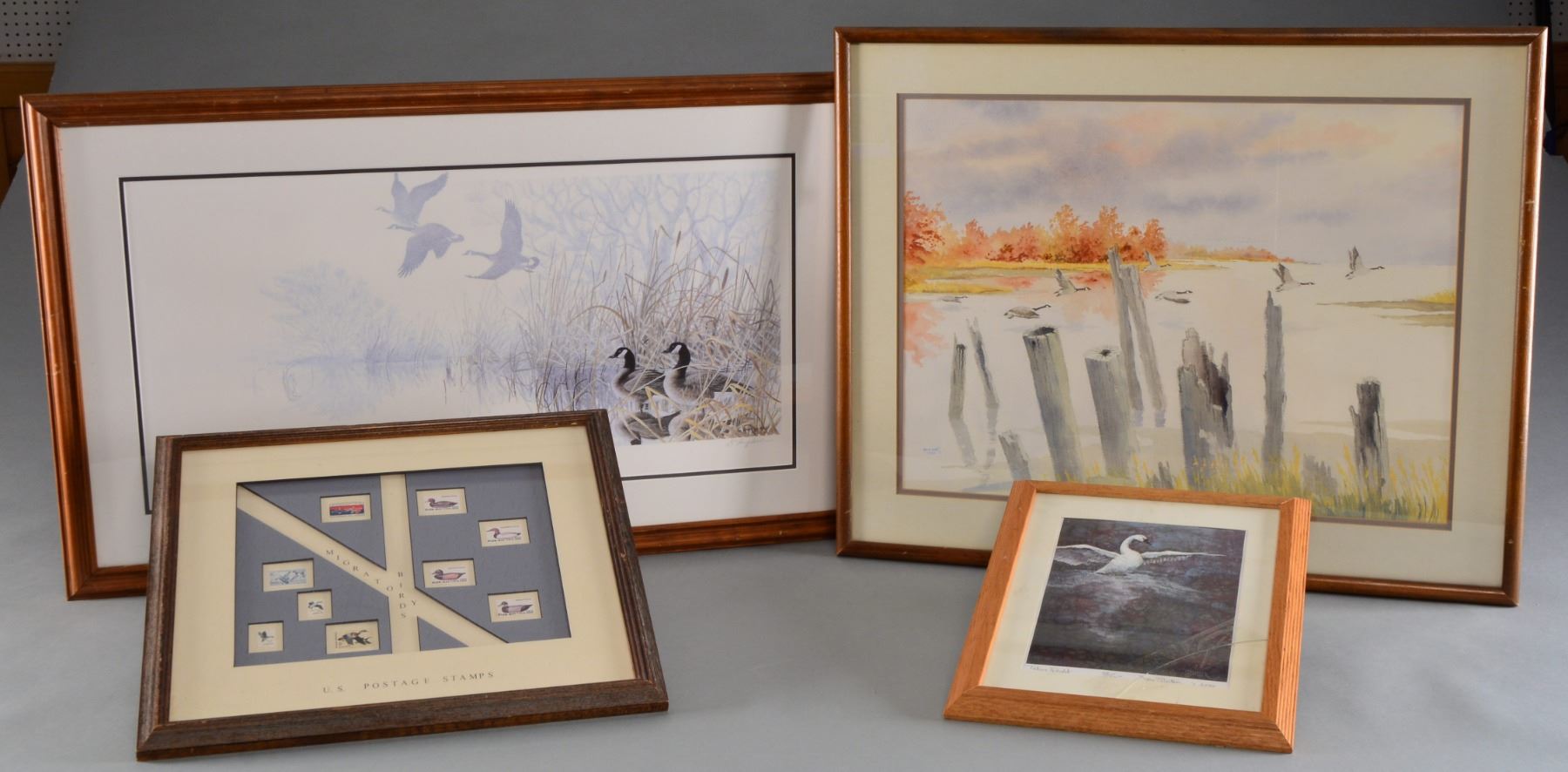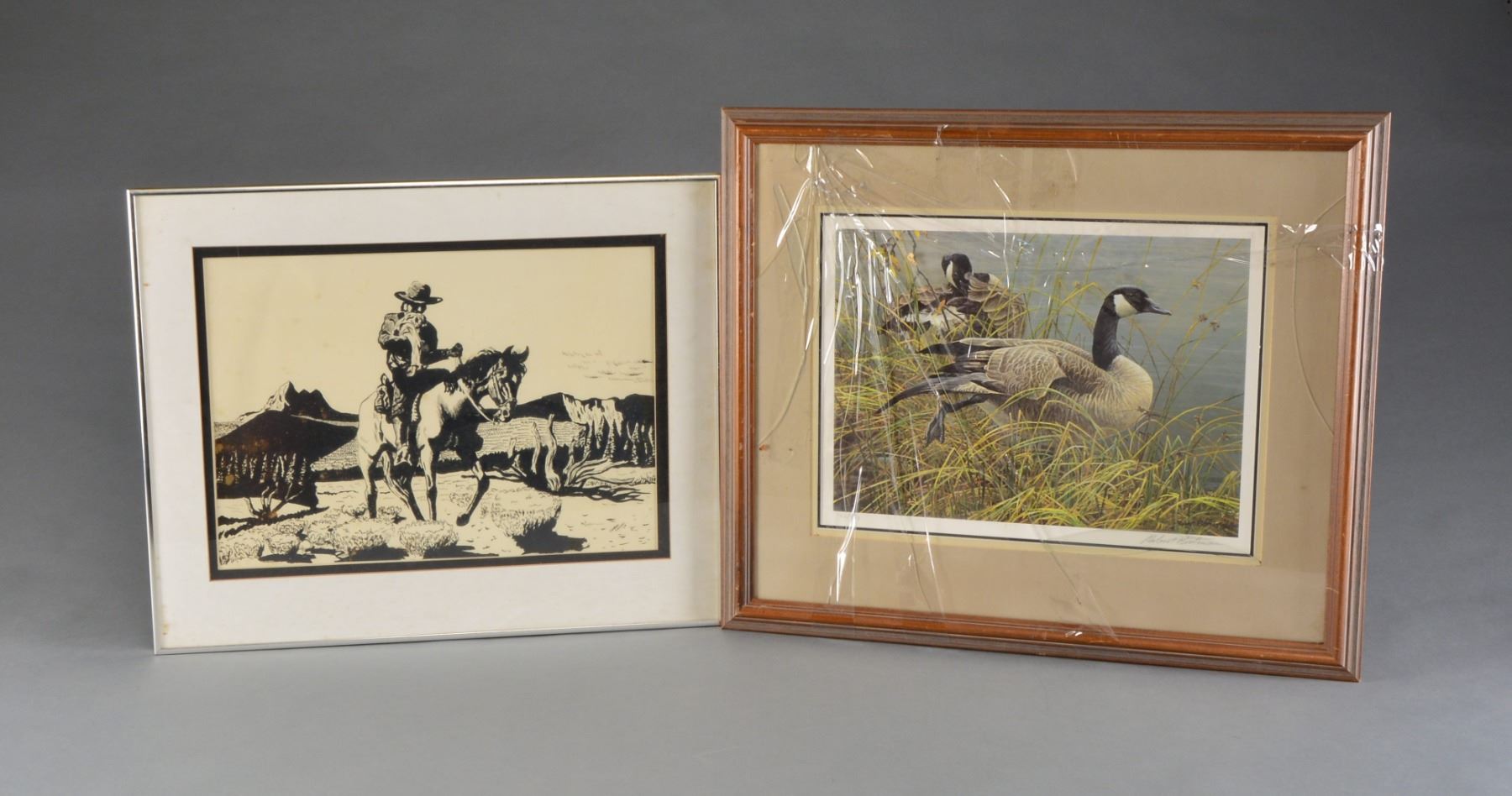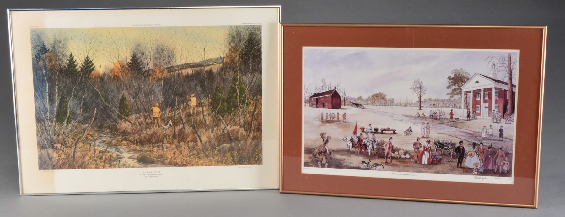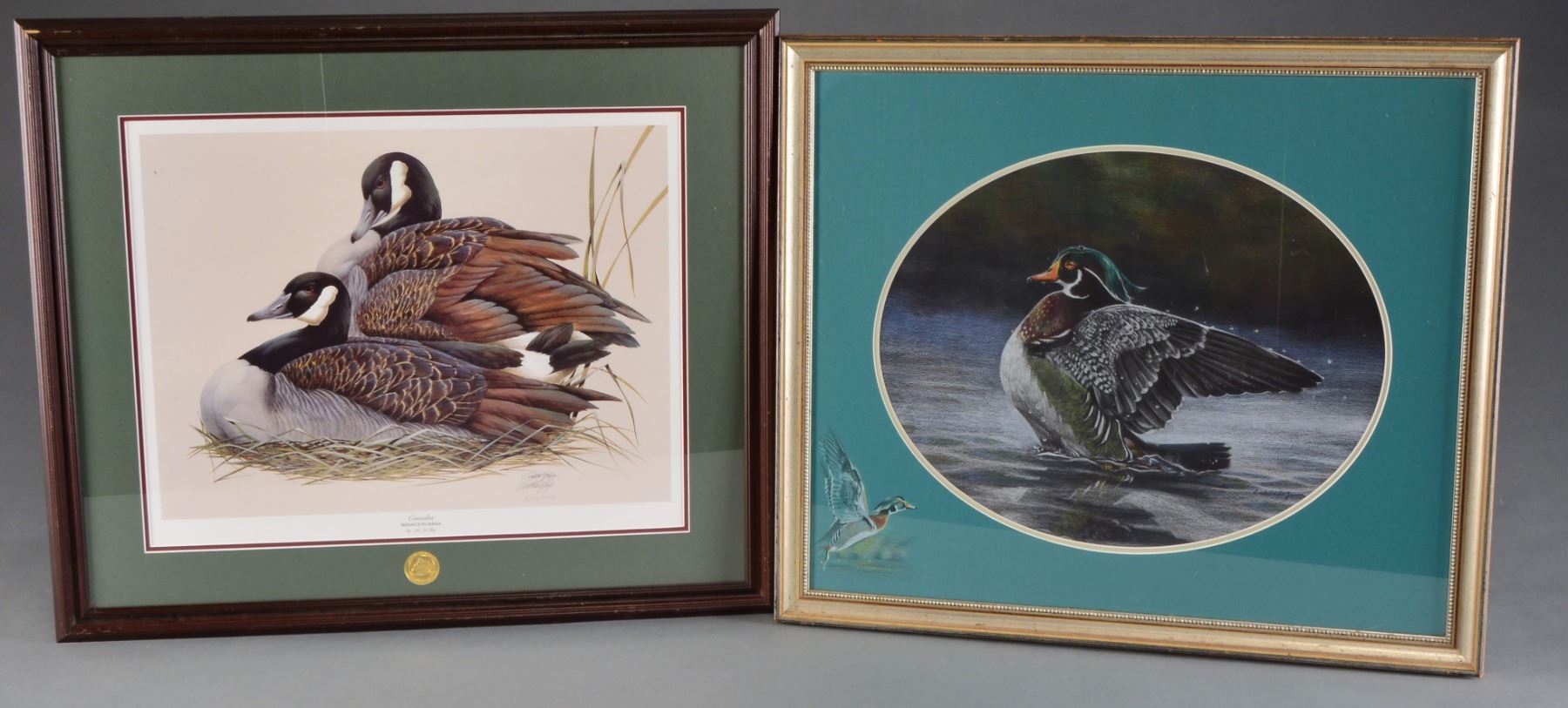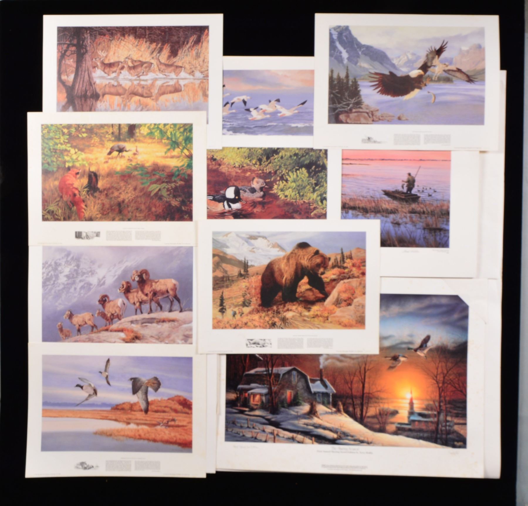 1) CANADA'S 1994-1995 DU MEDALLION SERIES PRINTS BY ART LEMAY. Print NO. 3167 of 5300. Features pair of nesting Canada Geese. Image size 16" x 21". Frame size 25" x 30". Dark walnut w/ green & brown matting. 2) Wood duck drake w/ wings open. Oval image size 20 1/2" x 16" w/ green matting. 28 1/2" x 24 1/2" Antique finished frame. 3) Canada geese & misty marsh scene by G. Randy Wilson, 1993. Print number 1,572 of 5,300. Image size 29" x 15" surrounded by black trim & white matting. 38" x 23" Pecan colored frame. 4) Autumn lake scene w/ flying Canada geese by Dan Britt, 1990. Image size 24 1/4" x 18 1/4" surrounded by gray border & white matting. 31" x 25" Medium colored wood frame. 5) "NOW OR NEVER A NEW BRUNSWICK CLASSIC" BY Tom Hennessey. Artist copy of an edition of 195 from the collection of James C. Rikhoff. Copyright 1980. New England woodland scene w/ setter & 2 hunters taking aim at a woodcock flying through the trees. Image size 26 1/2" x 17". Nickel finished metal frame, 31 1/4" x 22 1/4". 6) Resting pair of Canada geese by Robert Bateman. Print # 752 of 950. Image size 17" x 12 1/4". Tan color matting & medium tone wood frame size 27 1/4" x 23". Glass is broken. 7) "TAKING FLIGHT" by Jane Stouffer 2000. Print# 52 of 125. 10 x 7 3/4" Image of Trumpeter swamp w/ open wings. 16" x 13" Oak frame. Glass is cracked. 8) Migratory Birds U.S. Postage stamps. 13" x 10 1/2" Image displaying 9 waterfoul themed stamps. 20" x 17 3/4" Barnwood toned frame. 9) "GHOSTS ON THE COURTHOUSE LAWN" by award winning artist Harriet Cowen of Maine. 350th Anniversary Lancaster County, print# 34 of 1,000. Copyright 2001. Image shows Lancaster County courthouse w/ ghosts from Indians to Pilgrims to Civil War Soldiers. Image size 23 1/2" x 14". Bronze color matting. 29 1/4" x 20 1/4" Bronze color metal frame. 10) Print of horse mounted Vaquero carrying a child by Conrad Cayting. Image size 19 x 13 1/2" w/ black border & white matting. 25 1/4" x 20 1/4" Silver colored metal frame. UNFRAMED PRINTS: Vermont 1986 Waterfoul stamp & print. / 1989 Rhode Island First of State duck & print. / 2 - 1984 First of State Maine waterfoul stamp design by David A Mass. / Remignton Wildlife art collection 1989. "THE ABUNDANT LIFE", set of 4 selective prints. / 1986-1987 Federal Duck stamp print. / 1986 Maine Waterfoul stamp by David A Mass. / "HOODED MERGANSER" 1978-1979 Federal Migratory bird stamp print by Albert Earl Gilbert. / "THE SHARING SEASON" by Terry Redlin 1985. Winter scene w/ flying mallards crossing a setting sun. / 10 "EARLY SET" by Hank Walker. Hunter setting decoys in a fall marsh scene. Some unframed prints show spots of staining. (02-13415/DS) $150-300.
