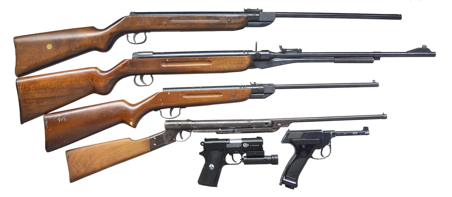 1) DIANA MODEL 120 YOUTH BB RIFLE. Cal. .177. Bbl. 14 1/8" smooth bore. Overall Length: 34 3/8". Single pump bbl. cocking. Bead post front sight. Receiver tube has simple rear sight marked "DIANA" below roll stamped Diana logo. Blue finish. Hardwood stock. Mfg. 1912-1940. CONDITION: 30% dull fading blue blending w/ areas of surface corrosion. Stock shows wear & handling marks. Bore shows some fouling. Front sight is bent. Gun has good compression. 2) BSF "BAYERISCHE SPORTWAFFENFABRIK" BAVARIA MODEL AIR RIFLE. Cal. 22. S# A3219. Bbl. 19 1/2". Post front sight w/ U notch adj. rear sight. Single pump under lever operation. Blue finish. Finger groove rnd. knob hardwood stock w/ plastic buttplate. Mfg. in Erlangen, West Germany. WEIGHT: 7 lbs., 9 oz. CONDITION: 90% blue showing scattered surface corrosion. Stock shows scratches & handling marks. Bore retains good rifling. Action has stiff compression. 3) HI-SCORE MODEL 807. Cal. 22. Bbl. 17 3/8" rifled. Adj. V notch rear sight, front sight is missing. Bbl. break single cock operation. Finger groove rnd. knob hardwood stock w/ grooved butt. Mfg. in Germany. CONDITION: 90% lightly faded blue showing areas of surface corrosion. Stock shows numerous finish chips, scratches & handling marks. Bore retains good rifling. Action has good compression. 4) SLAVIA MODEL 618 BARREL BREAK AIR RIFLE. Cal. .177. Bbl. 14" w/ rifled bore. Blade front sight w/ adj. square notch rear sight. Blue finish. Finger groove hardwood pistol grip stock w/ grooved butt. Mfg. in Czechoslovakia. CONDITION: 80% blue showing areas of surface corrosion. Stock shows spots of finish wear w/ scratches & marks. Bore has good rifling. Good compression. 5) PLAINSMAN BB CO2 OPERATED REPEATER PISTOL. Cal. .175. Bbl. 6" w/ smooth bore. Black paint alloy construction styled to look like a Colt Woodsman. 2 Piece black plastic checkered grips. Sold by Challenger Arms Corp. Healthways, LA, California. CONDITION: 80% painted finish. Grip shows handling marks. Good bore. 6) COLT DEFENDER. Cal. 177 (4.5mm). S# 12L12245. Bbl. 4.3" smooth bore. 16 Shot mag. CO2 operated. 440 FPS. Black finished metal construction styled to look like Colt Commander. Ramp front sight w/ square notch rear sight. Checkered plastic grips. Rail on bottom of frame holds Crossman laser sight. UNATTACHED ACCESSORIES: operations manual, safety rules, advertisement papers, 2 CO2 cartridges & partial tube of Daisy BB's. CONDITION: near excellent. (02-13408/DS). $250-500.