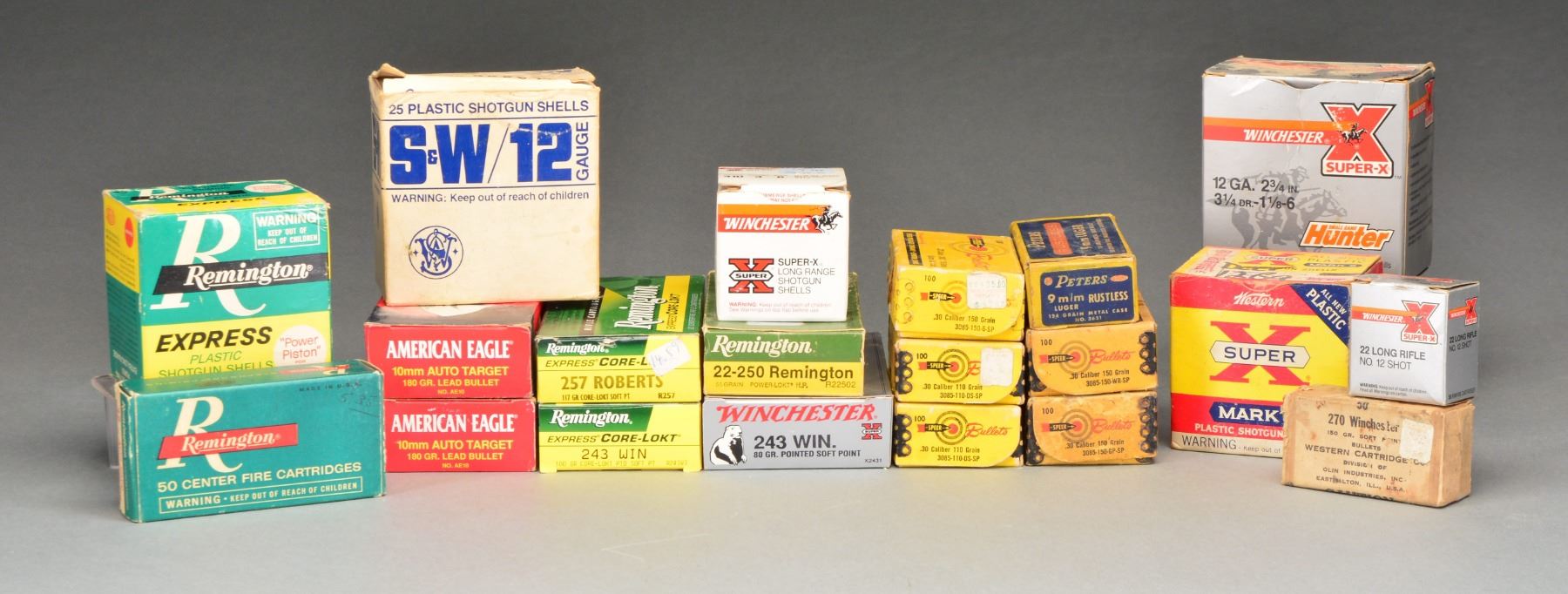 RIFLE: Rem. 22-250 55 gr. Power-Lokt, 1 box w/ 10 rds. / Win. Super X 22 LR No. 12 shot, 1 box 50 rd. mostly full. PISTOL: Peters Rustless 9mm Luger 124 gr. metal case, 1 yellow, blue & red box w/ 40 rds. / Rem. 32 Auto 71 gr. metal case, 1 box w/ 42 rds. / American Eagle 10mm Auto target 180 gr. lead, 1 full box & 1 box containing 3 rds. SHOT SHELL: Win. Super X 410, 3" No. 6 shot, 1 box nearly full. / 1 Box containing 16 rds. of 20 Ga. shells. / 3 Partial boxes of mixed 12 Ga., 2 3/4" shells including slugs & buck shot. BULLETS: 1 Box Speer 30 cal. 150 gr. Spitzer soft point. / 1 Box Speer 30 cal. 150 gr. rnd. nose. / 1 Partial box Speer 30 cal. 150 gr. WR soft point. / 1 full & 1 partial box. 30 cal. 110 gr. OS soft point / 1 Partial box Winchester Western 270 150 gr. soft point. BRASS: 1 Box Rem. 243 Win. / 1 Full Box Win. 243 Win. / 1 Box (18 rds.) 257 Roberts. (02-13439/DS). $50-100.