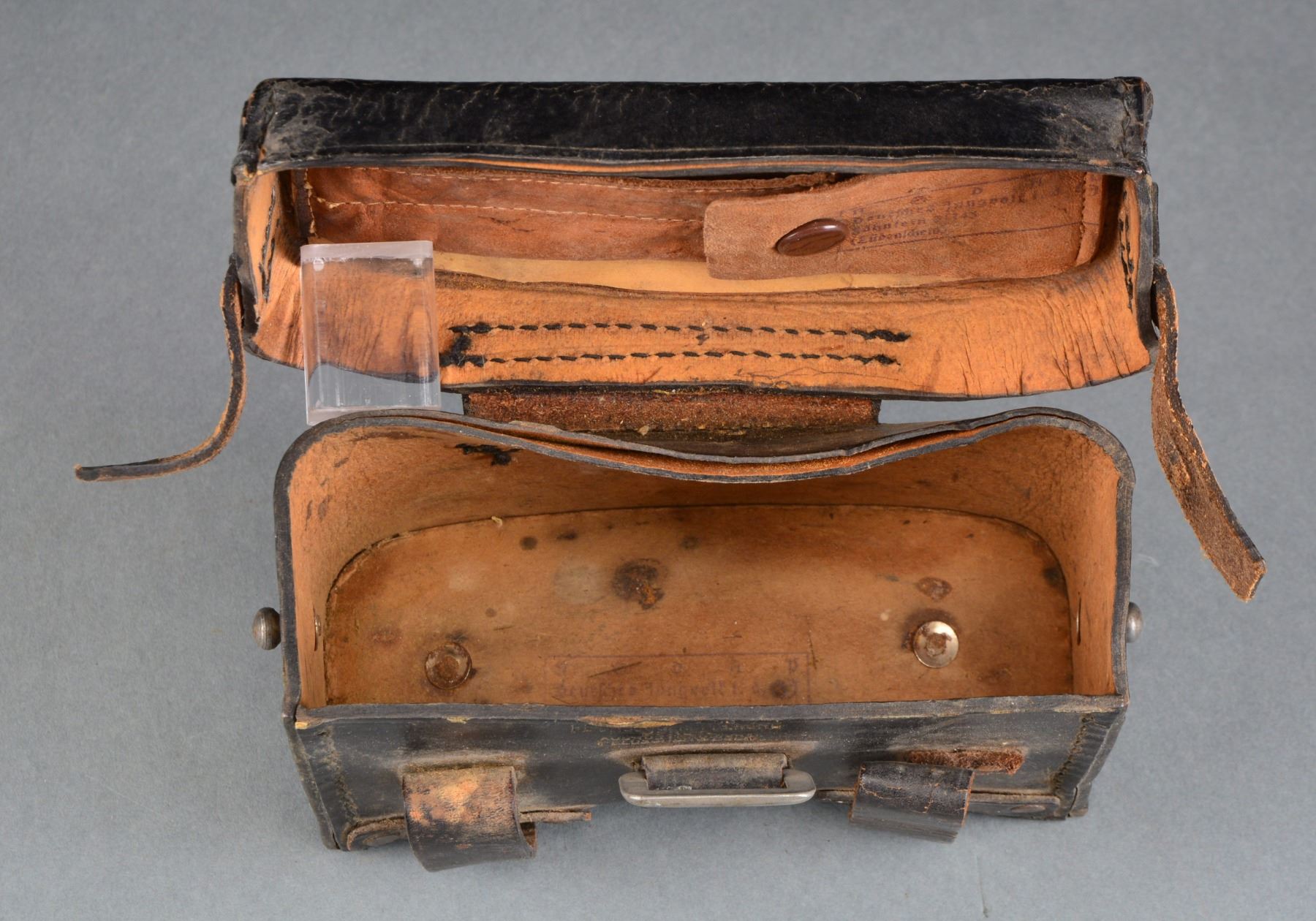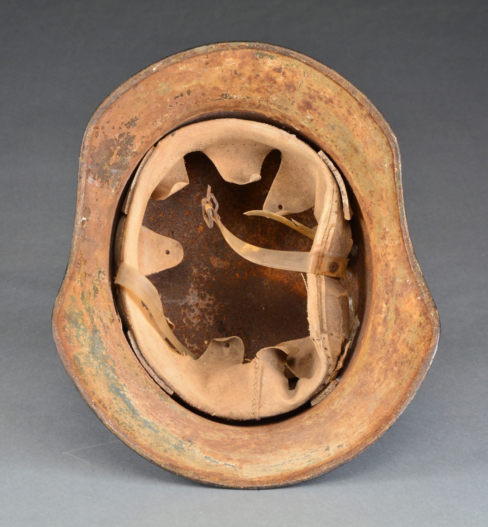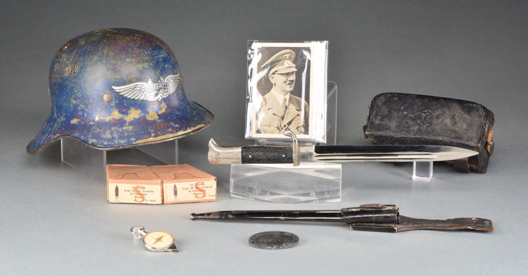 This interesting & varied lot contains 1 WWII Luftschutz helmet w/ primarily a blue body, full liner & replaced decal. / 1 WWII Army dress bayonet & scabbard w/ frog. / 1 WWII Adolf Hitler postcard w/ cancellation stamps on reverse. / 1 Post WWII pocket compass marked, "ELYCO W. Germany". / 2 Original boxes of WWII 8mm Mauser ammunition dated 1938 w/ Waffenamt. / 1 Black leather field first aid kit w/ a Hitler Youth diamond impressed into the top. / 1 Metal oval tag measuring 2 3/8" x 1 1/4" that reads, "ORGANISATION TODT AUSWEIS BRITISCHE KANALINSELN". Presumably, identification for a resident of the British Channel Islands occupied by Germany during WWII. CONDITION: helmet shows evidence of being repainted several times. First Aid kit shows moderate wear. Remaining items show light wear. (02-13451/BF). $400-600.