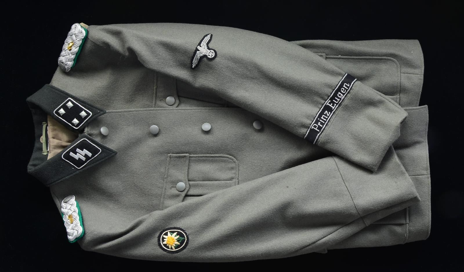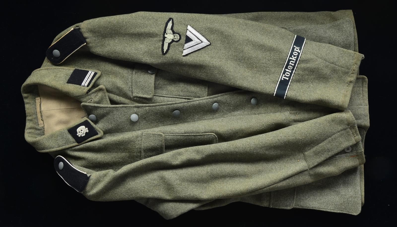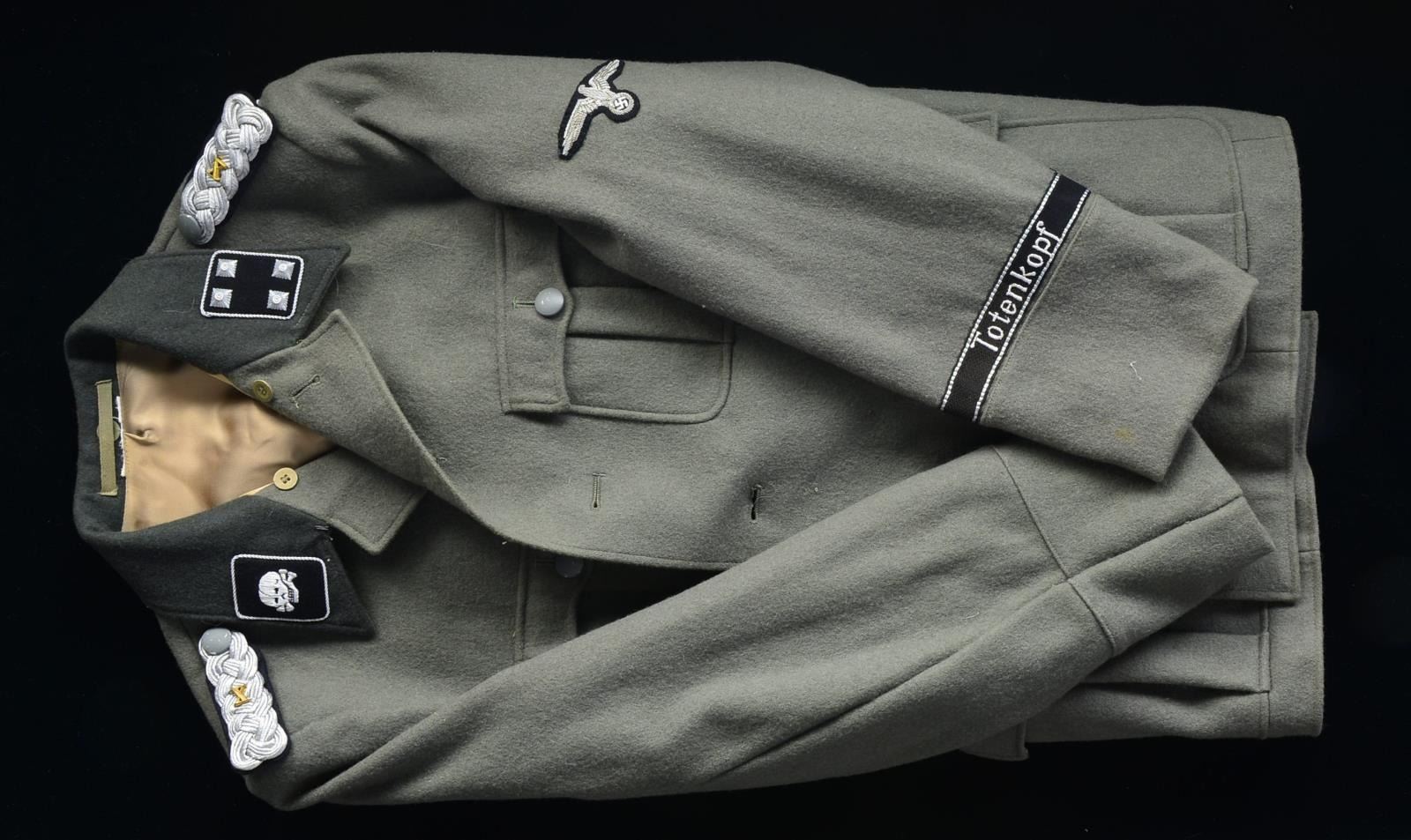 This group of tunics includes 3 SS Privates tunics. / 1 SS Second Lieutenant. / 1 SS Second Lieutenant of the Totenkopf Division. / 1 SS First Lieutenant of Panzers. / 1 SS Major of Mountain Troops. / 1 SS Major"s winter tunic. / 1 SS Major"s tunic of the Totenkopf Division. CONDITION: all uniforms show light wear. (02-13523/BF). $600-1,000.