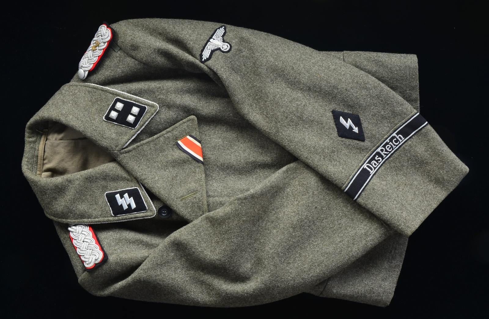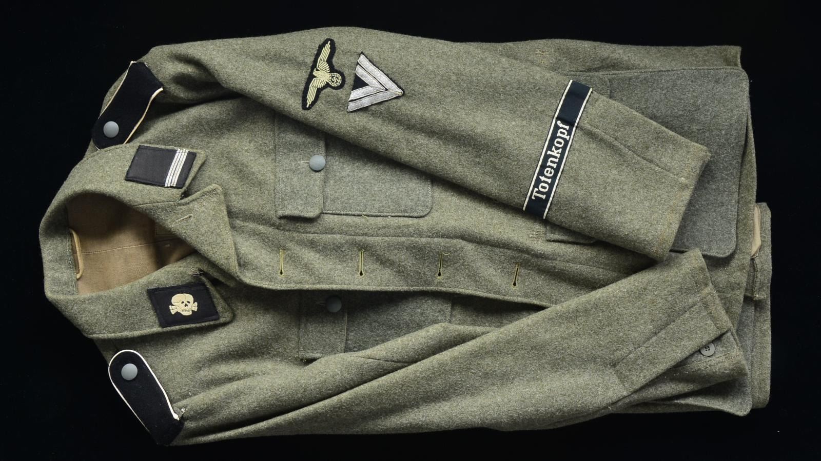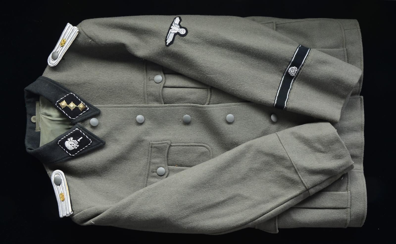 This group of tunics includes 3 SS Privates tunics. / 1 SS Second Lieutenant. / 1 SS Second Lieutenant of the Totenkopf Division. / 1 SS First Lieutenant of Panzers. / 1 SS Major of Mountain Troops. / 1 SS Major"s winter tunic. / 1 SS Major"s tunic of the Totenkopf Division. CONDITION: all uniforms show light wear. (02-13523/BF). $600-1,000.