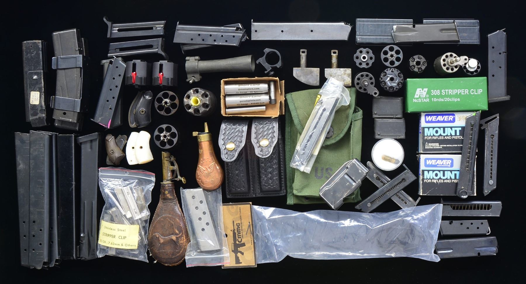 30 Magazines including: 3-Hi-Standard 22 LR, 1-Triple K/ Hi-Standard G380, 1-Stoeger Luger 22 LR, 8-M1911 of various cal & mfg. 3 are extended length, 2-Browning HP, 5-for unidentified pistols, 1-Remington M760 30-06, 2-.17 HMR rotary, 4- M1 Carbine, 3- 45 ACP stick, 1-CMMG 5.7x28 mag extension kit. 4- M1 Garand clips, 25-stripper clips. 14-NcSTAR 10 rd 308 stripper clips 9 Revolver cylinders: 2-Hi-Standard Double Nine 22 LR, 1`-Colt SAA 45 LC, 1- SA 45 LC, 1- 38 cal, 1-Ruger Single Six, 1- Ruger Old Army, 1- Repro Walker 44 Cal, 1- Repro M1849 31 cal. 1-HKS #22 HR speed loader. 4-Sub cal inserts: Short Lane 12 ga./38 special, Short Lane 12 ga, /410-45 Colt, 410/9mm & 45 Colt/22RF. 3- sets of grips for Iver Johnson DA revolvers, 1 pearl & 2 hard rubber .2-sets Weaver scope rings. 1- S&W double mag pouch #B110W. 1-US canvas M1 carbine mag pouch. 1-Repro pistol size powder flask. 1-Antique leather shot flask. 1-Flash hider. 2-Spencer breech blocks. 1-Antique 36 cal paper cartridge. (02-13720/DS). NONGUN. $300-600.