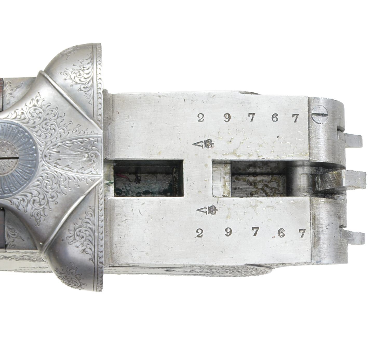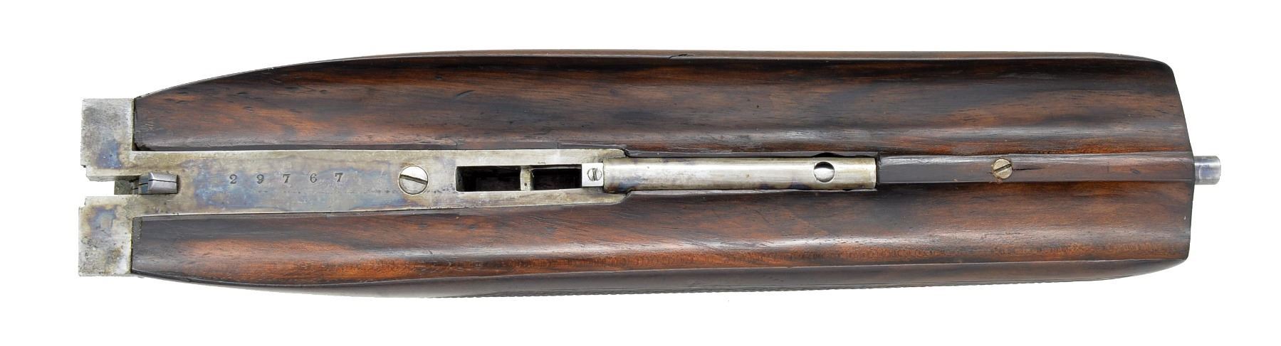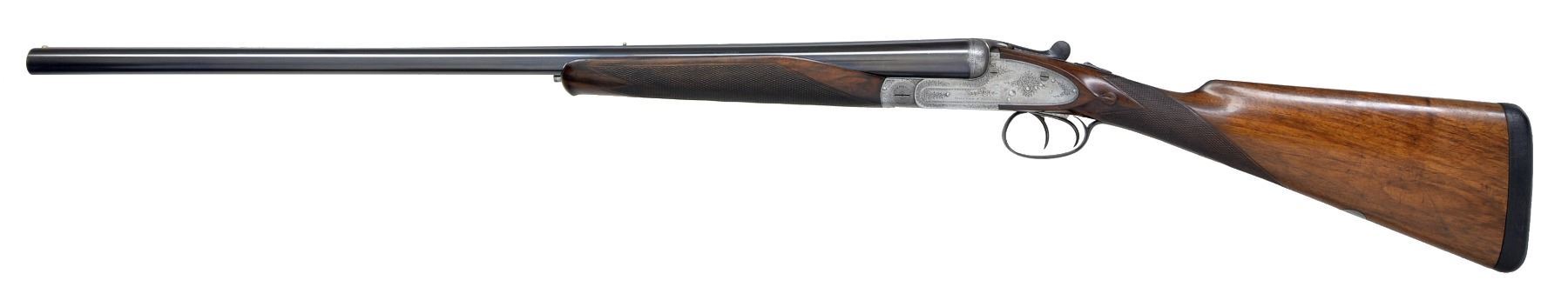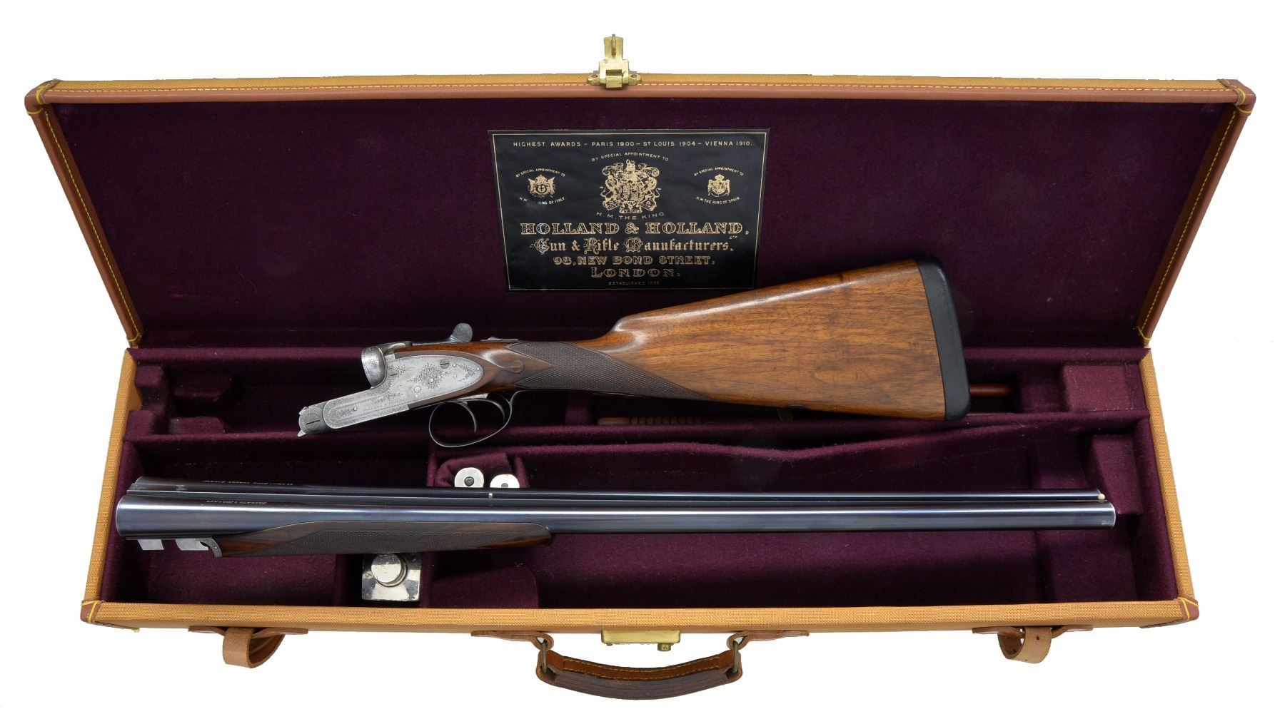 EJECTOR GAME GUN WITH CASE. Cal. 12 Ga., 2 3/4". S# 29767. (1949). Bbls. 28" Chopper lump w/ slightly raised game rib engraved "Holland & Holland" & "98 New Bond Street, London." on tops. Bbl. flats are stamped w/ London nitro proofs for 2 3/4" chambers & "CHOKE". Casehardened square backed sidelock action features non automatic safety (SAFE inlaid in gold), hidden third fastener, gas vents & dbl. triggers. Action engraved w/ 70% coverage nicely cut medium shaded scroll. "Holland & Holland" is on each lockplate. Bottom of action engraved "Holland's Ejector". Blued top lever and trigger guard are also scroll engraved. Serial number on trigger guard tang. Relatively plain American walnut straight grip buttstock measures 14 5/8" over black leather covered pad. Stock features fluted drop points & fairly coarse point pattern checkering which wraps around bottom of grip. A vacant silver oval is on toeline. Matching long schnabeled beavertail ejector forend has Anson release. Bore diameters: left - .729, restriction: .038 (full), right - .729, restriction: .021 (Mod). Minimum wall thickness: left - .030, right - .034. DAH: 2 5/16". DAC: 1 1/2". Cast about 1/2" off. WEIGHT: 7 lbs. 2 oz. UNATTACHED ACCESSORIES: gun is housed in relatively new gold canvas tan leather trimmed case lined in purple cloth. A reproduction H&H label is in lid. Case contains H&H marked pair of snap caps, square oil bottle & 2 piece cleaning rod. Also included; A Holland & Holland Factory letter. CONDITION: good, as refurbished. Bbls. have what appears to be original blue but may be an older "best" reblue. Action is nearly all silver to gray w/ traces of color where protected. Newer stocks by a fairly accomplished craftsman retain most of their oil finish w/ numerous light marks & scratches. Top lever & trigger guard reblued and retain nearly all of that blue. Checkering slightly worn. Bores are very fine, shiny. Action is tight. Bbls. are on face. Ejectors are strong & in time. Case is fine. Interior has rubs. Snap caps & oil bottle are heavily scratched. (20-919/MGM84). CURIO. $7,000-10,000.