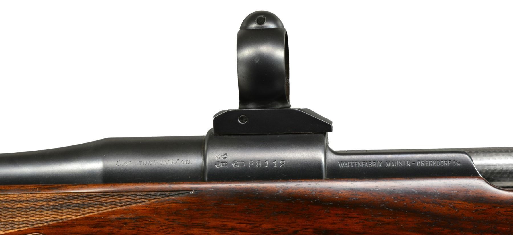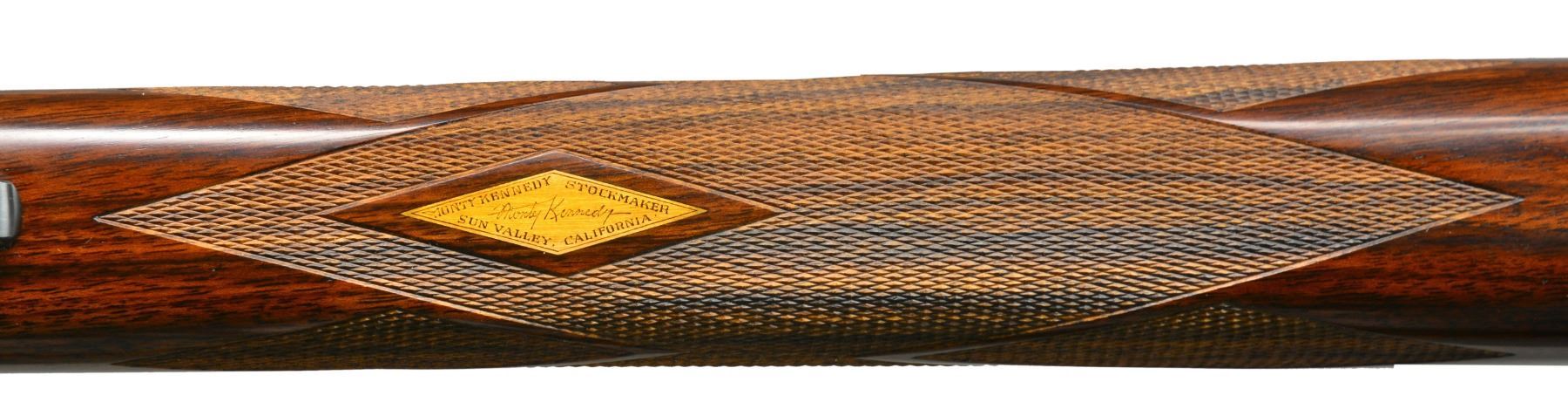 AND STOCKMAKER MONTY KENNEDY. Cal. 300 Win. Mag. S# 88112. Bbl. 24" lightweight engraved "Griffin & Howe Inc. New York, N.Y." on top. Bbl. is fitted w/ G&H type banded on front ramp w/ knurled sight protector. Oberndorf commercial standard length action has had bridge modified & fitted w/ Buehler rings & bases. German proofs are on receiver ring & side wall is marked "WAFFENFABRIK MAUSER " OBERNDORF A/N". Engine turned bolt has had handle lowered & knob has checkered band & engraved starburst at bottom. A Buehler safety has been fitted to bolt shroud & a commercial trigger has been installed. Original bottom metal is marked "Made in Germany"on hinged floorplate retained by button in trigger guard bow. Stock appears to be of nicely figured American walnut & was probably made by Kennedy during the"50's, close to the time he worked for Pfeifer, as it exhibits typical California styling of that period w/ its high rollover comb & triangular forend. Stock measures 13 1/4" over thin black Old English pad & has swept shadow line right hand cheekpiece, ebony forend tip & ebony grip cap w/ gold diamond inlay. Checkering is of multi point pattern w/ ribbons separating other diamonds of checkering. (In Kennedy's book, THE CHECKERING AND CARVING OF GUN STOCKS, he named many of these patterns & this cataloger remembers this particular one, but not its name). An uncheckered diamond at bottom of forend surrounds inlet gold diamond engraved"MONTY KENNEDY STOCKMAKER" "SUN VALLEY, CALIFORNIA"which is above & below his central signature. CONDITION: very fine, as competently refinished retaining nearly all of satin rust reblue. Stock has dark hand rubbed oil finish over some light marks & a few subsequent scratches. Checkering competently recut. Bore is fine, shiny w/ some erosion at throat. (20-527/MGM38). CURIO. $4,000-6,000.