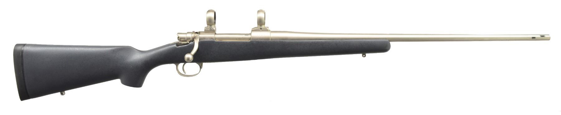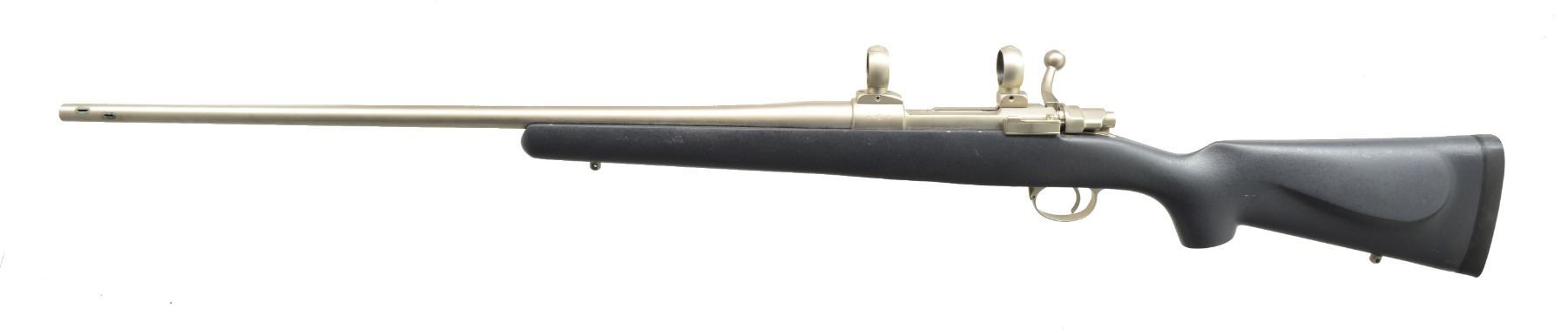 Cal. 264 Win. Mag. S# 3637. This company was one of the first to use fiberglass rifle stocks in building super accurate hunting rifles & weatherproof metal finishes. 26 1/2" Medium weight bbl. w/ integral muzzle brake. Company name & caliber are on left side. Standard length FN Model 98 action appears to have been sourced from a Browning Safari grade rifle. This company will build any model rifle on a customer supplied action. Bbl. & action are electroless nickel finished. Bottom metal has hinged floorplate engraved w/ geometric light scroll. Lightweight matte finished black fiberglass stock measures 14 1/8"over black Decelerator pad. Stock features right hand cheekpiece & sling eyes. Action fitted w/ Conetrol rings & bases. CONDITION: fine w/ a few rubs, retaining nearly all factory finishes w/ some tarnishing around openings in muzzle brake & some dark discoloration from lubrication in action area which is mostly removable w/ steel wool. Bore is very fine, a bit dirty. Custom rifles by this company retail at well over $3000.00 presently. (20-611/MGM141). MODERN. $1,500-2,000.