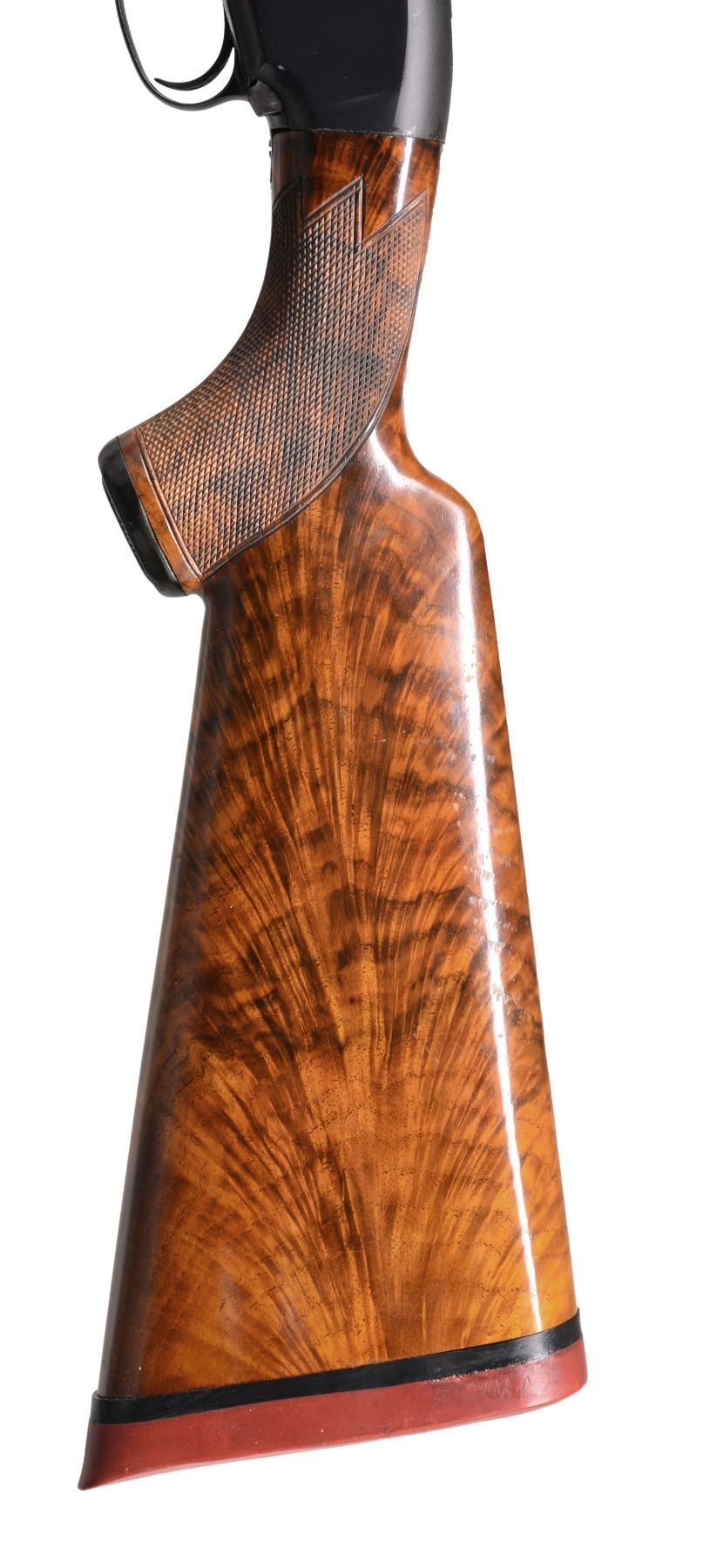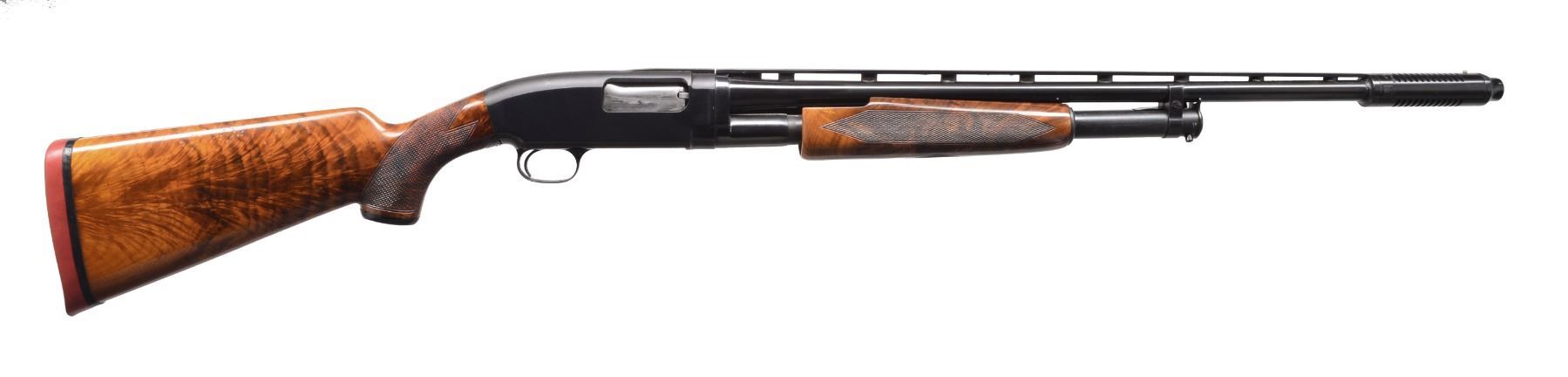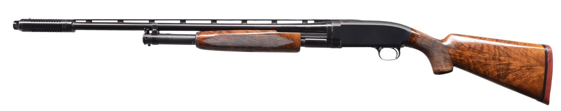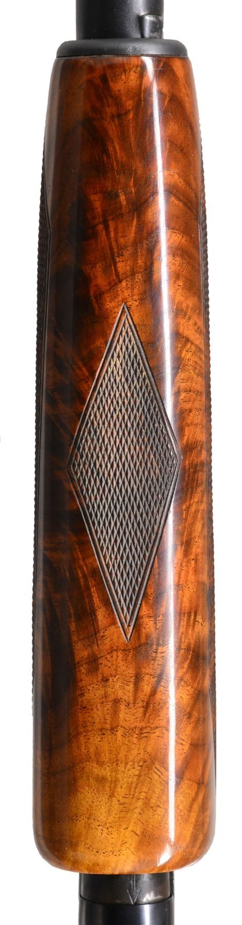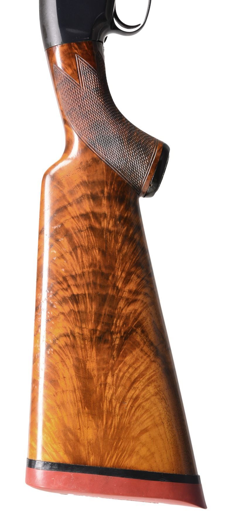 Cal. 28 Ga., 2 7/8". S# 1239352. Bbl. 26" over aftermarket Cutt's Compensator w/ 20 Ga. spreader tube. Aftermarket lg. oval post Simmons rib. Custom aftermarket beavertail forearm & hard rubber capped pistol grip stock of gloss finished exhibition grade walnut w/ point pattern hand checkering. LOP: 13 1/2" over repro. solid red pad. CONDITION: over 95% reblued finish showing take down marks & sm. marks in front of action & receiver extension. Wood shows scattered scratches & marks. Clean bright bore. (20-123/DS). CURIO. $1,750-2,500.