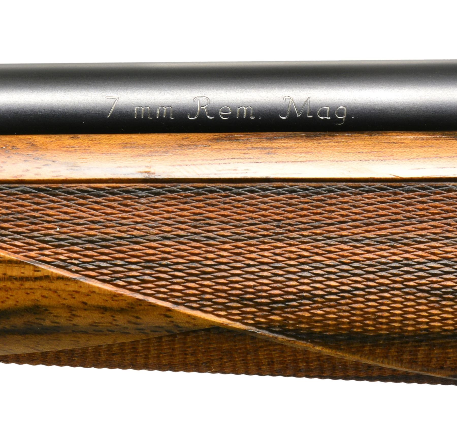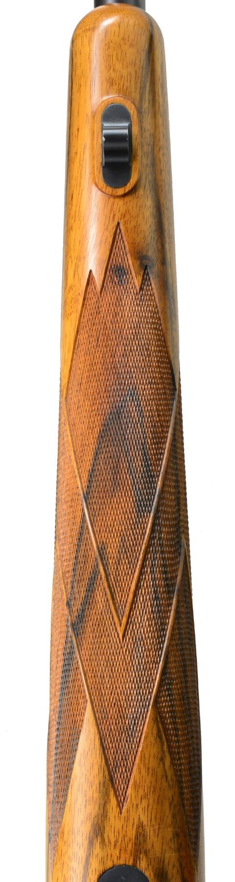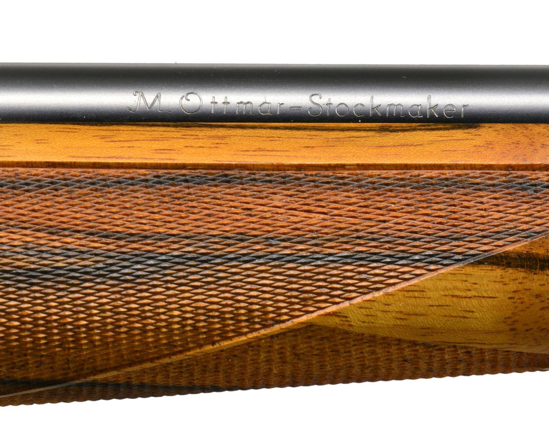 OTTMAR. Cal. 7mm Rem. Mag. S# 487858. Lightweight rnd bbl. of 24" is engraved w/ caliber on left side & "M. Ottmar " Stockmaker"on right. Standard Model 70 action has custom shaped & checkered bolt release. Engine turned bolt has knob checkered w/ 2 rnd. panels. Custom 1 piece steel bottom metal has hinged straddle floorplate w/ takedown button in trigger guard bow. Oil finished stock of strikingly marbled & lightly figured European walnut measures 13 3/8" over checkered steel buttplate w/ trap. Ottmar worked for Champlin's for a number of years & the styling of this rifle is reminiscent of their products. Right hand cheekpiece has unusual cyma curve to shadow line at rear & sweeps forward into grip. Sling eyes are let into relief carved platforms. Skeleton grip cap is of steel w/ central checkered wood portion. Checkering is unusual & distinctive in point pattern w/ diamond portions separated by ribbons. Checkered fields are sunken into stock leaving ribbons raised. CONDITION: very fine showing very little use w/ a few scattered handling marks in wood including a few sm. scratches on left side. Bore is sharp & shiny. Action smooth. An eye catching rifle by this very highly regarded stockmaker. (20-524/MGM39). CURIO. $3,000-4,000.