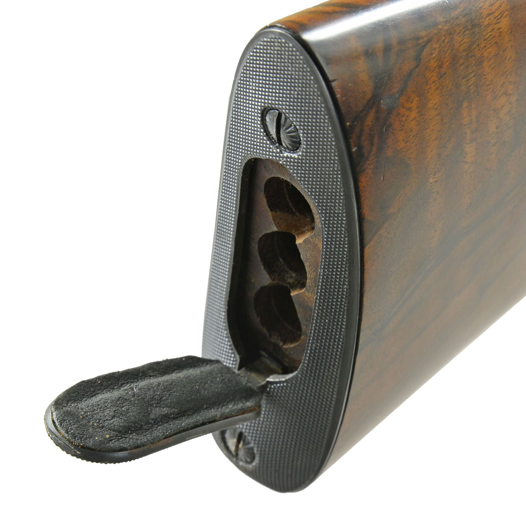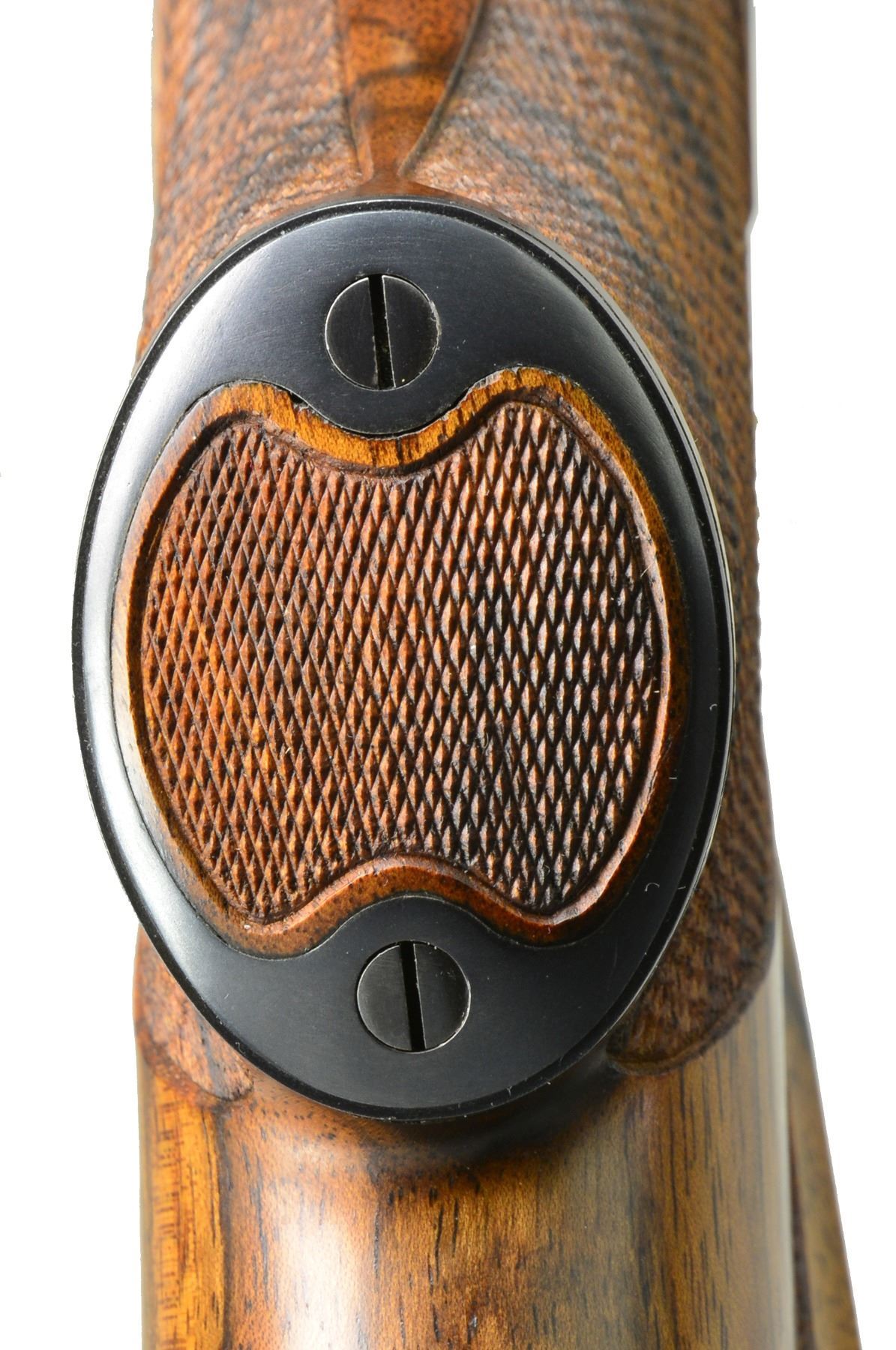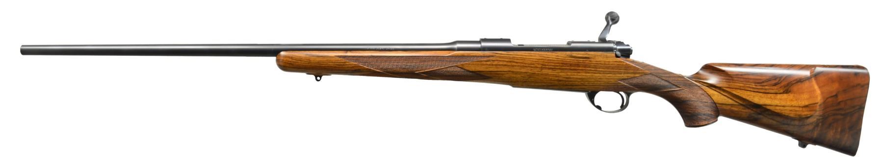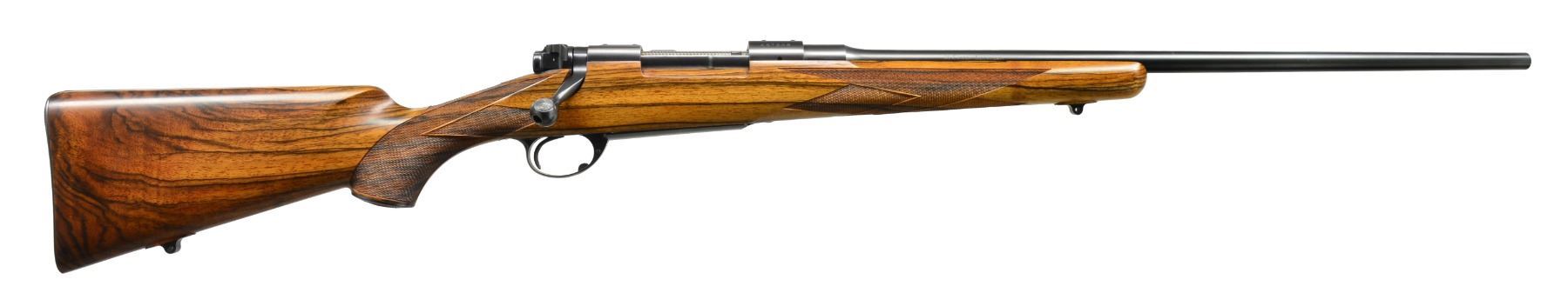 OTTMAR. Cal. 7mm Rem. Mag. S# 487858. Lightweight rnd bbl. of 24" is engraved w/ caliber on left side & "M. Ottmar " Stockmaker"on right. Standard Model 70 action has custom shaped & checkered bolt release. Engine turned bolt has knob checkered w/ 2 rnd. panels. Custom 1 piece steel bottom metal has hinged straddle floorplate w/ takedown button in trigger guard bow. Oil finished stock of strikingly marbled & lightly figured European walnut measures 13 3/8" over checkered steel buttplate w/ trap. Ottmar worked for Champlin's for a number of years & the styling of this rifle is reminiscent of their products. Right hand cheekpiece has unusual cyma curve to shadow line at rear & sweeps forward into grip. Sling eyes are let into relief carved platforms. Skeleton grip cap is of steel w/ central checkered wood portion. Checkering is unusual & distinctive in point pattern w/ diamond portions separated by ribbons. Checkered fields are sunken into stock leaving ribbons raised. CONDITION: very fine showing very little use w/ a few scattered handling marks in wood including a few sm. scratches on left side. Bore is sharp & shiny. Action smooth. An eye catching rifle by this very highly regarded stockmaker. (20-524/MGM39). CURIO. $3,000-4,000.