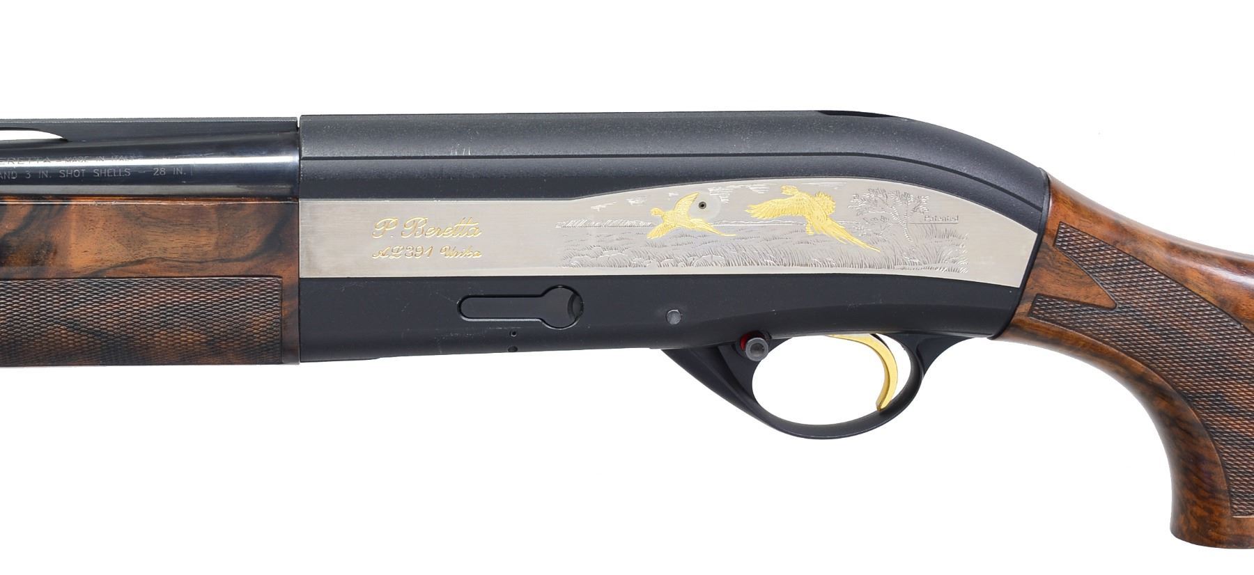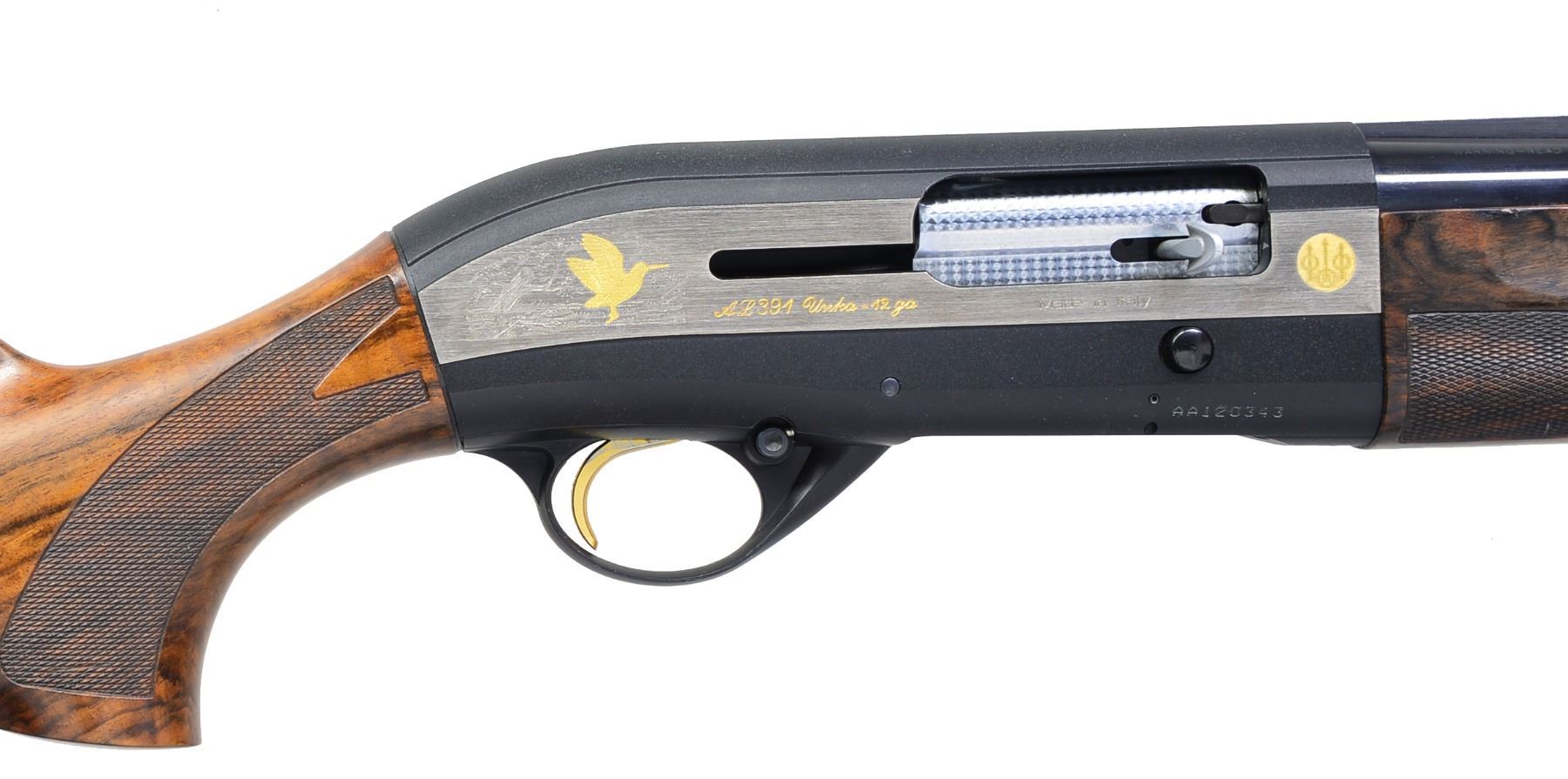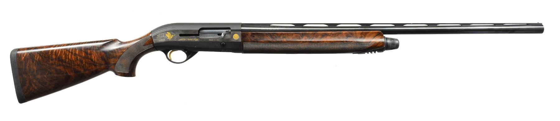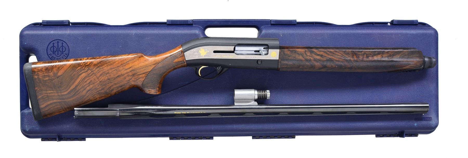 SHOTGUNS. 1) Cal. 12 Ga. S# AA120343. Bbl. 28" VR w/ steel front bead fitted for Mobile chokes; full set of 5 chokes included. Left side of bbl. has gold inscription "Made Especially for Ken Behring". Matte black anodized alloy receiver w/ natural finished side panels having gold markings w/ game scenes having gold plated woodcock on right side & 2 flying pheasants on left side. Jeweled bolt & carrier. Gold finished trigger. Forearm & uncapped pistol grip stock of checkered fancy walnut showing vivid marbling & dark streaking. LOP: 14 3/8" over solid black pad. UNATTACHED ACCESSORIES: blue molded case containing spare chokes, choke wrench, buttplate, stock shims, sling swivels, grip cap, Beretta oil, plug, owner's manual & warranty info. CONDITION: bbl. & action retain over 95% finish showing light scratches on left side of receiver. Wood has very good finish showing a few sm. marks. Clean bright bore. (20-1176/DS). 2) Cal. 12 Ga., 2 3/4" & 3". S# AA120344. Bbl. 28" VR w/ steel bead & fitted for Mobile chokes; Full, Imp. Mod., Mod., & Imp. Cyl. included. Matte black finished alloy receiver w/ natural finished side panels having gold markings & game scenes featuring gold plated woodcock on right & 2 gold flying pheasants on left side. Gold finish trigger. Jeweled bolt & carrier. Forearm & pistol grip stock of satin finished fancy walnut having extensive fiddle figure & marbling w/ striking dark streaks. LOP: 14 3/8" over original solid black pad. UNATTACHED ACCESSORIES: blued molded case containing chokes, choke wrench, buttplate, gun lock, Beretta oil, plug, owner's manual & warranty papers. CONDITION: over 98% metal finish. Stock finish shows spots of wear w/ scattered scratches & marks. Clean bright bore. (20-1177/DS). BOTH MODERN. $1,400-2,000.