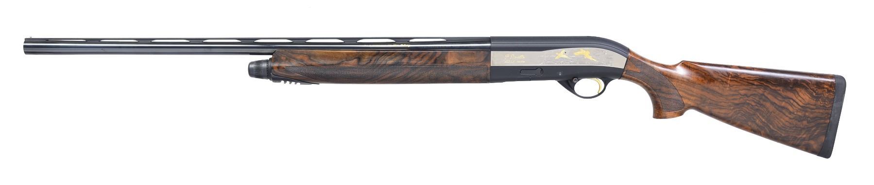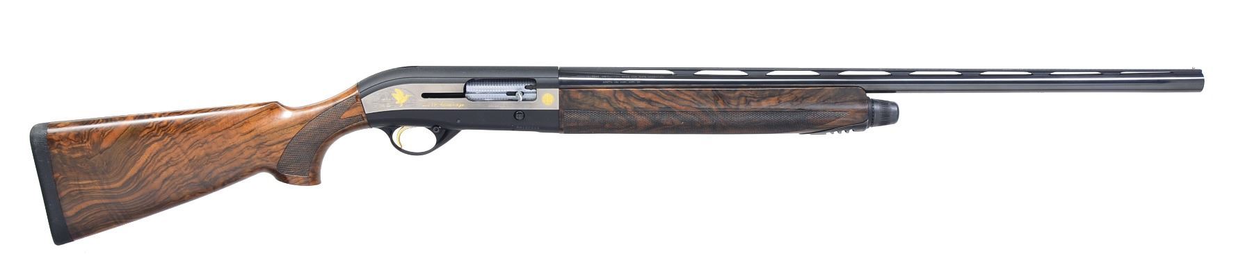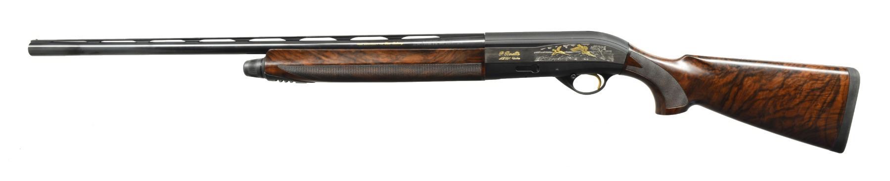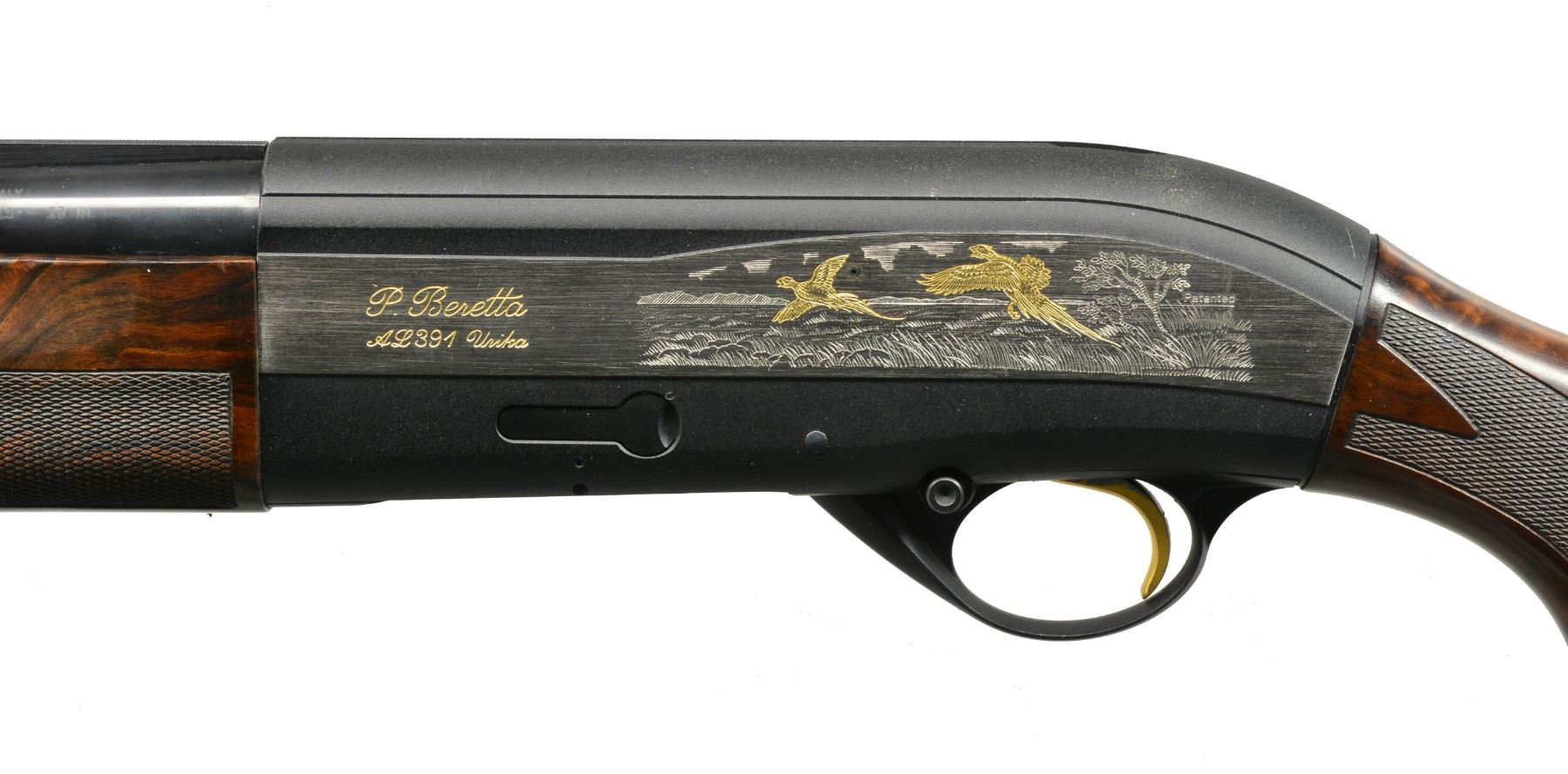 SHOTGUNS. 1) Cal. 12 Ga. S# AA120343. Bbl. 28" VR w/ steel front bead fitted for Mobile chokes; full set of 5 chokes included. Left side of bbl. has gold inscription "Made Especially for Ken Behring". Matte black anodized alloy receiver w/ natural finished side panels having gold markings w/ game scenes having gold plated woodcock on right side & 2 flying pheasants on left side. Jeweled bolt & carrier. Gold finished trigger. Forearm & uncapped pistol grip stock of checkered fancy walnut showing vivid marbling & dark streaking. LOP: 14 3/8" over solid black pad. UNATTACHED ACCESSORIES: blue molded case containing spare chokes, choke wrench, buttplate, stock shims, sling swivels, grip cap, Beretta oil, plug, owner's manual & warranty info. CONDITION: bbl. & action retain over 95% finish showing light scratches on left side of receiver. Wood has very good finish showing a few sm. marks. Clean bright bore. (20-1176/DS). 2) Cal. 12 Ga., 2 3/4" & 3". S# AA120344. Bbl. 28" VR w/ steel bead & fitted for Mobile chokes; Full, Imp. Mod., Mod., & Imp. Cyl. included. Matte black finished alloy receiver w/ natural finished side panels having gold markings & game scenes featuring gold plated woodcock on right & 2 gold flying pheasants on left side. Gold finish trigger. Jeweled bolt & carrier. Forearm & pistol grip stock of satin finished fancy walnut having extensive fiddle figure & marbling w/ striking dark streaks. LOP: 14 3/8" over original solid black pad. UNATTACHED ACCESSORIES: blued molded case containing chokes, choke wrench, buttplate, gun lock, Beretta oil, plug, owner's manual & warranty papers. CONDITION: over 98% metal finish. Stock finish shows spots of wear w/ scattered scratches & marks. Clean bright bore. (20-1177/DS). BOTH MODERN. $1,400-2,000.