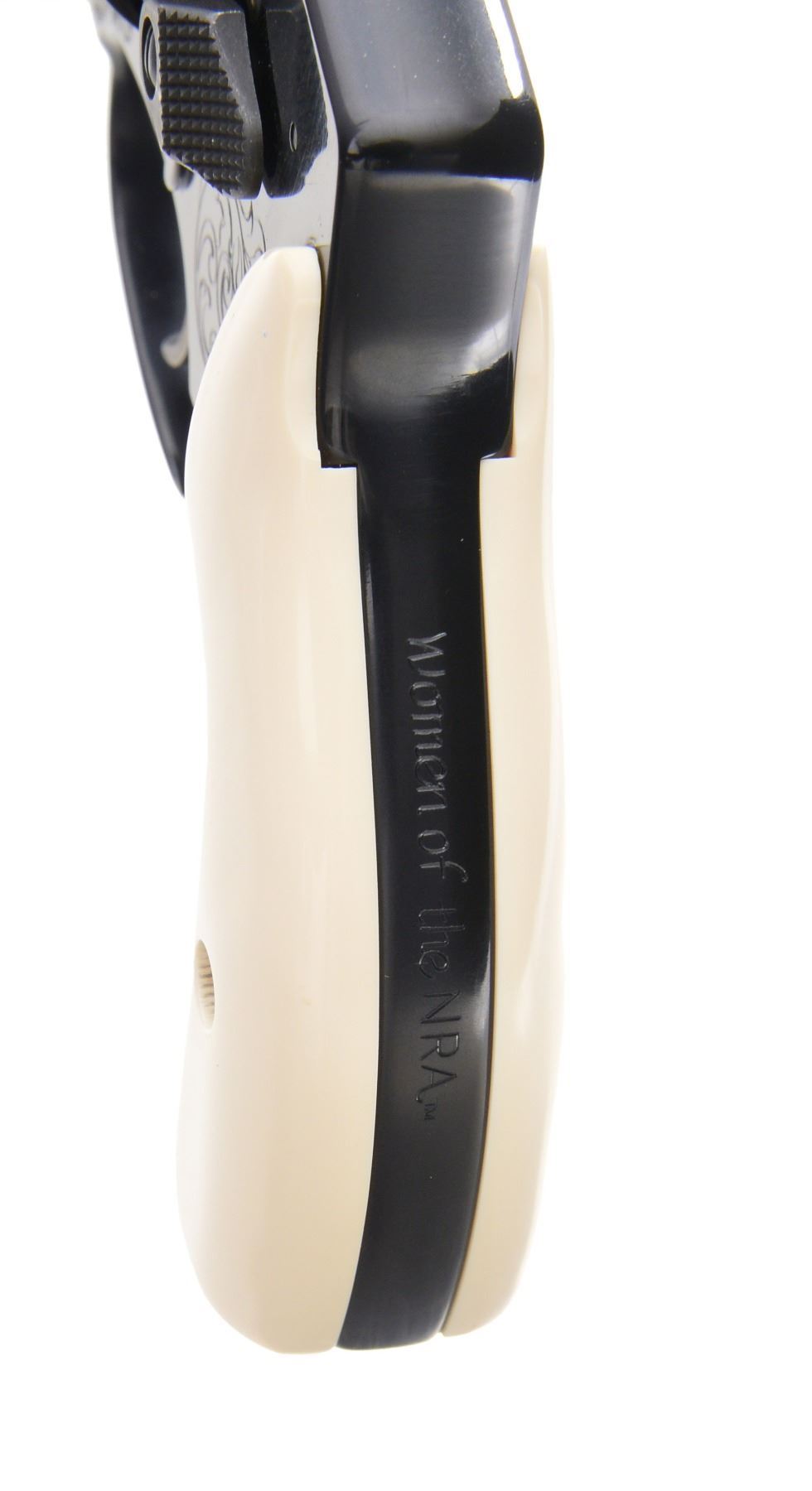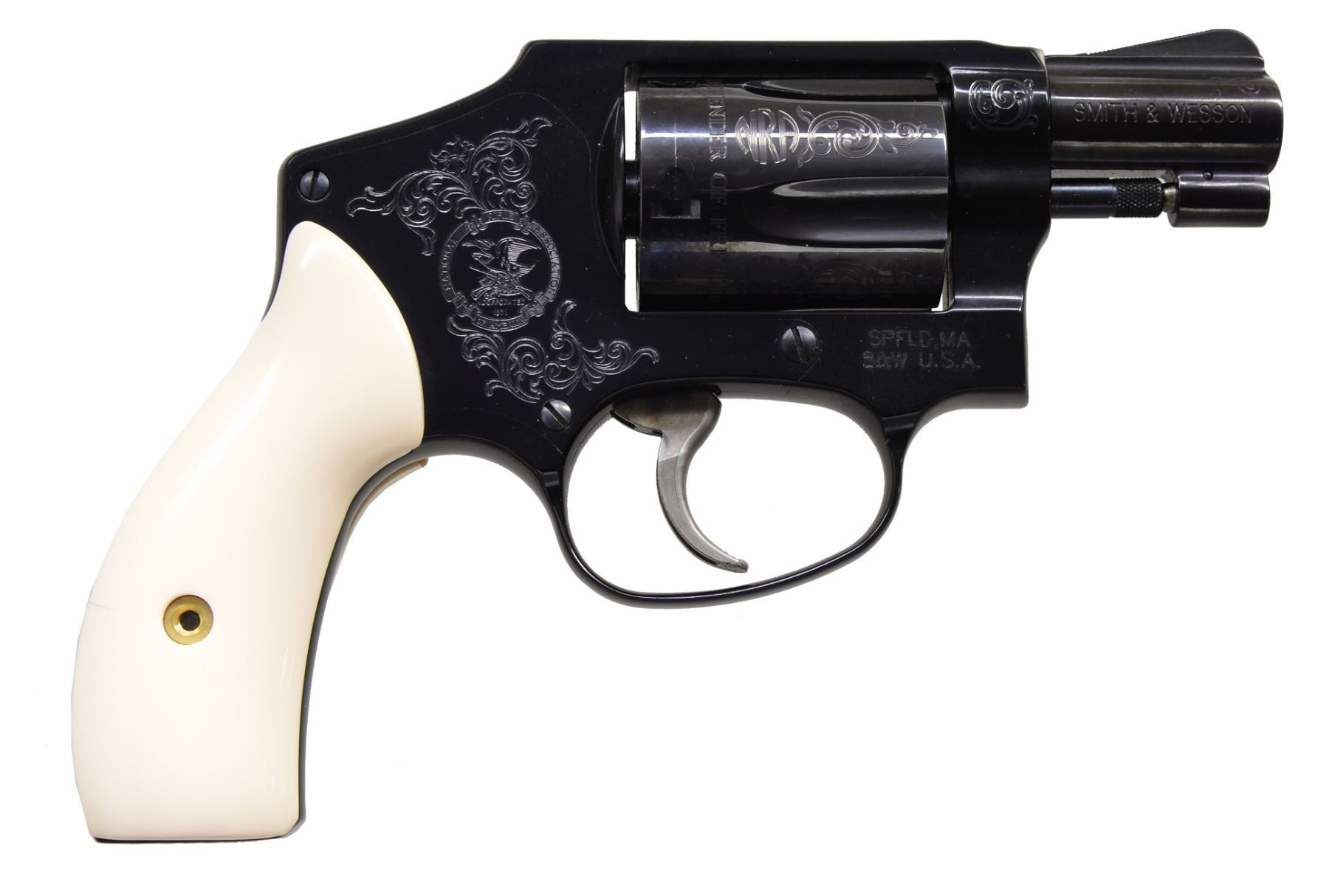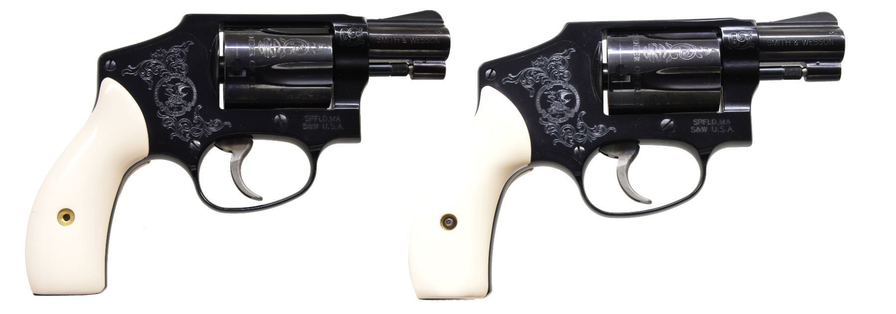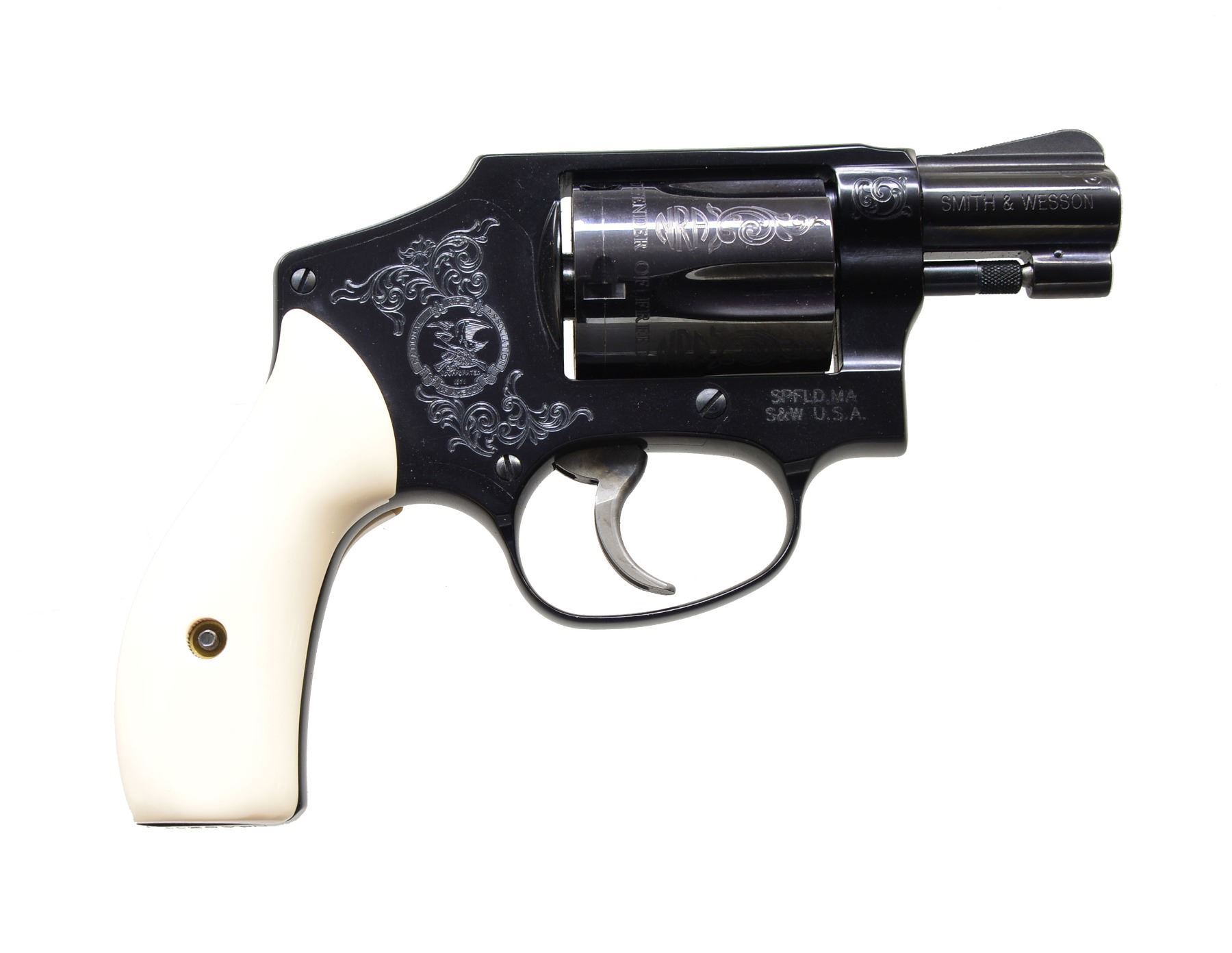 MODEL 442 WOMEN OF THE NRA DA REVOLVERS. ALL: cal. 38 S&W SPL. +P. This special Edition revolver dedicated to the Women of the NRA was issued during Sandra Froman's tenure as NRA president (2005-2007). Information cards w/ the guns picture Sandra Froman & quotes her views the guns as follow, "This model exemplifies the spirit & importance of our Second Amendment rights in a beautifully engraved piece that captures the essence of strong, powerful women who believe in their right to keep & bear arms." The first 130 of these 500 Special Edition guns had a spelling mistake on the cyl. The word "Amendment" was accidentally misspelled "AMMENDMENT". Only a portion of these had been sent to deals & distributors, S&W immediately asked for the guns to be returned, so cyls. could be replaced. To S&W's dismay, the distributor in possession of these 4 consecutive numbered guns declined to return them. It's believed that only a handful, other than these 4, are in circulation. Alloy J frame revolvers w/ concealed hammers. 1 7/8" Ribbed bbls. w/ serrated ramp front sights. Swing out fluted 5 shot cyls. Case colored triggers. Synthetic ivory rnd. butt grips. Ornamentation consists of scroll engraving on muzzle end of bbls., both sides of frame & cyl. between flutes w/ "NRA" markings. Left side of frame features the NRA seal. Inscription around the back of cyl. reads "ORIGINAL DEFENDER OF FREEDOM SECOND AMMENDMENT". UNATTACHED ACCESSORIES: both guns are housed in original blue molded S&W boxes w/ matching S# labels. Boxes contain instruction manuals, S&W club, laser engraving, NRA pamphlets & Sandra Froman cards along w/ trigger locks & fired cases. Also included are glass fronted wooden display cases w/ blue velour interiors having NRA seal on lids. CONDITION: both guns appear near new & unfired showing a slight drag line on the cyls. 1) S# NRA0210. (19-339/DS). 2) S# NRA0211. (19-340/DS). ALL MODERN. $7,000-10,000.