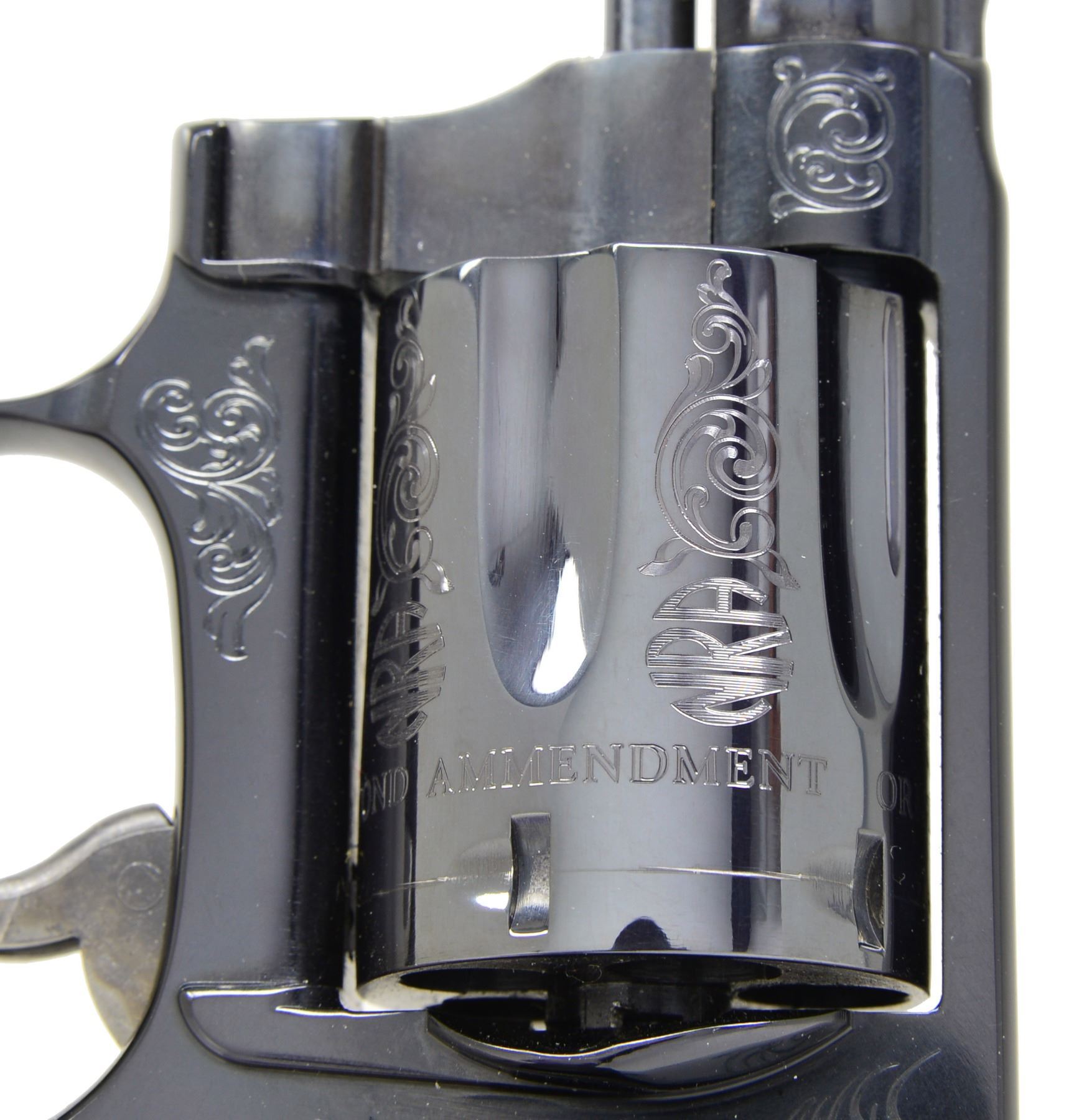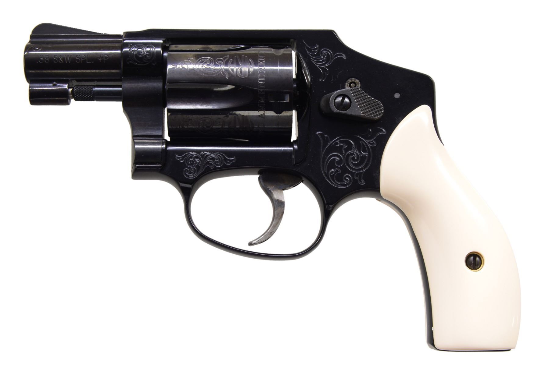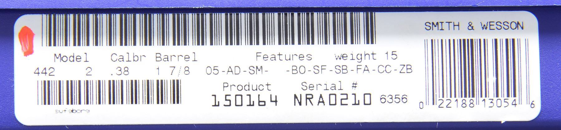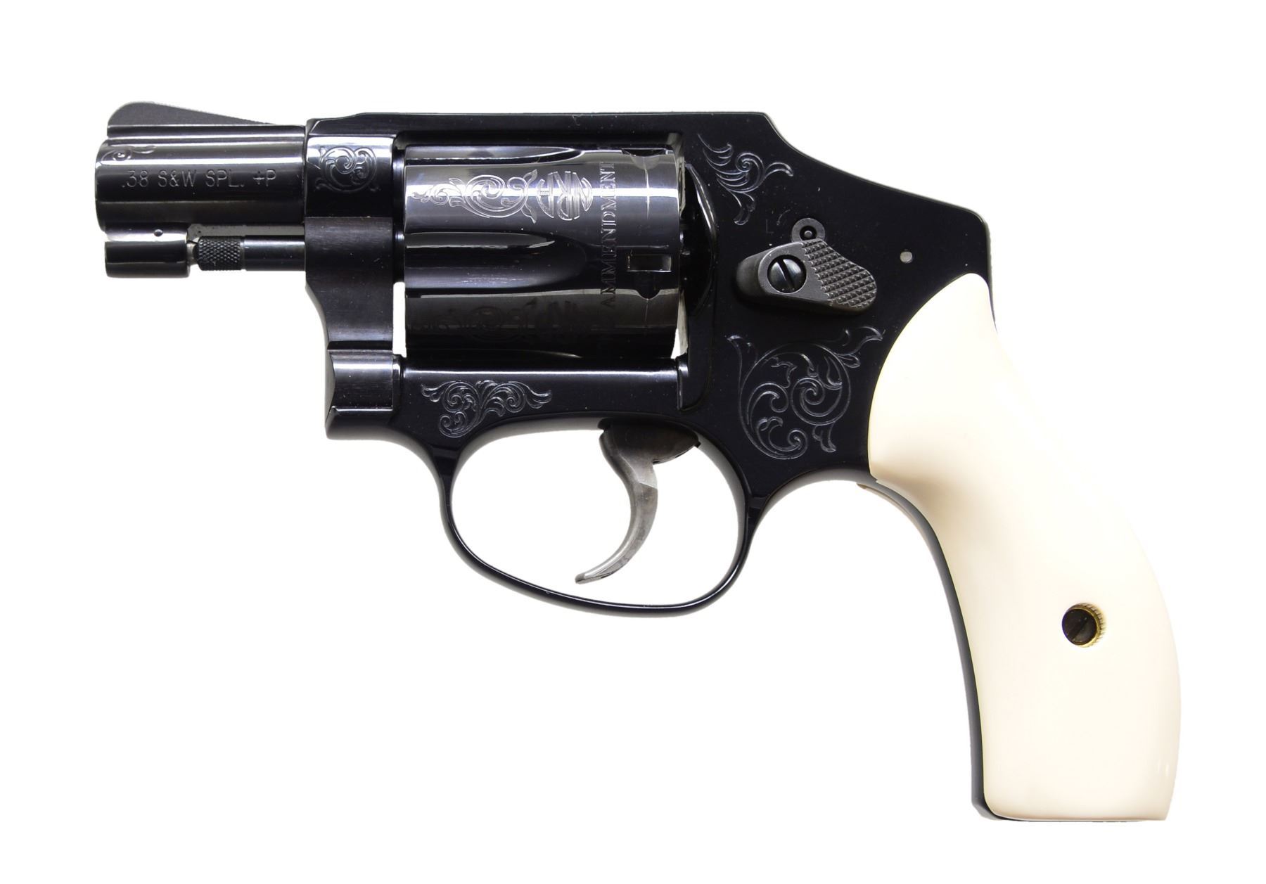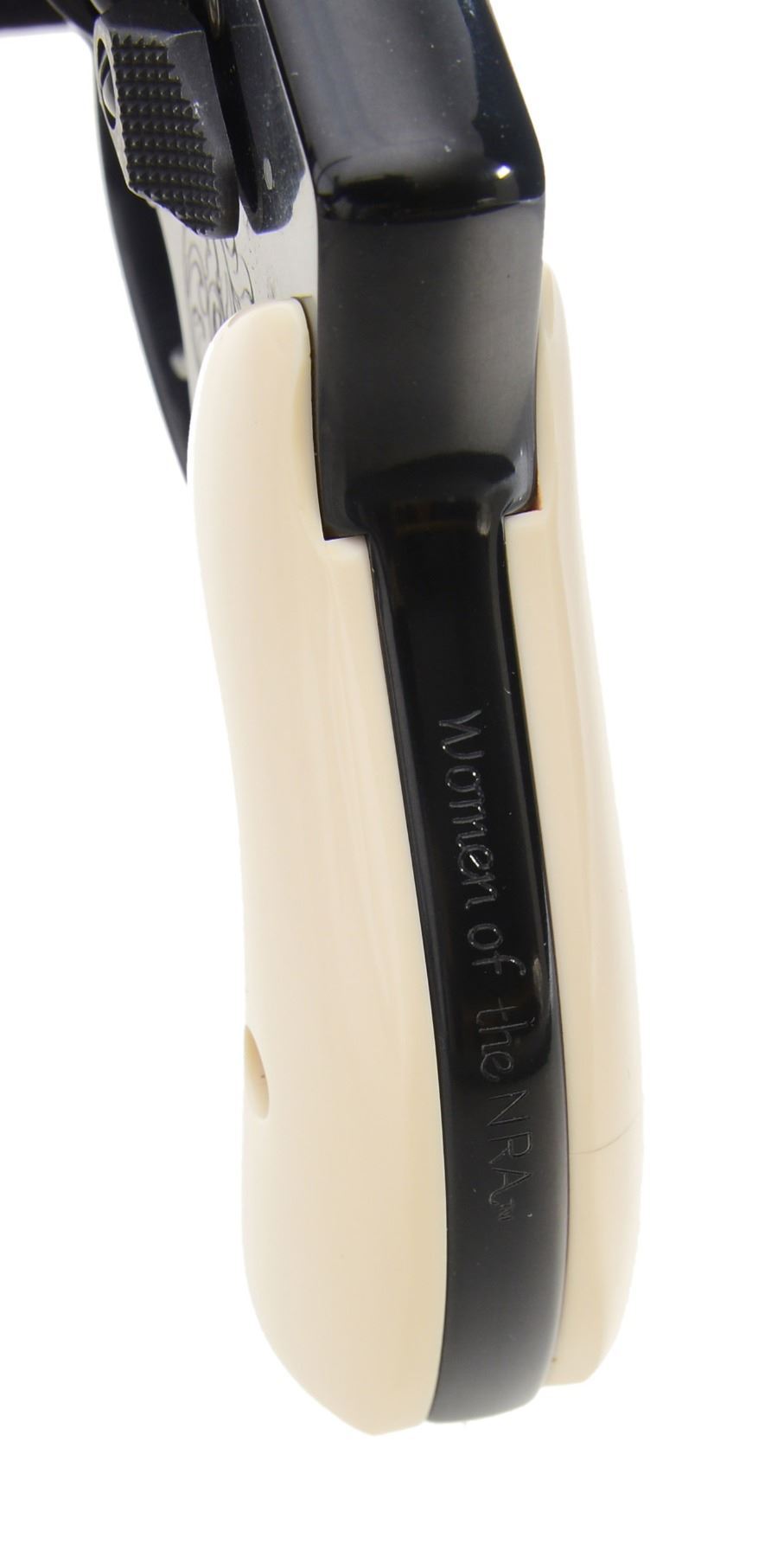 MODEL 442 WOMEN OF THE NRA DA REVOLVERS. ALL: cal. 38 S&W SPL. +P. This special Edition revolver dedicated to the Women of the NRA was issued during Sandra Froman's tenure as NRA president (2005-2007). Information cards w/ the guns picture Sandra Froman & quotes her views the guns as follow, "This model exemplifies the spirit & importance of our Second Amendment rights in a beautifully engraved piece that captures the essence of strong, powerful women who believe in their right to keep & bear arms." The first 130 of these 500 Special Edition guns had a spelling mistake on the cyl. The word "Amendment" was accidentally misspelled "AMMENDMENT". Only a portion of these had been sent to deals & distributors, S&W immediately asked for the guns to be returned, so cyls. could be replaced. To S&W's dismay, the distributor in possession of these 4 consecutive numbered guns declined to return them. It's believed that only a handful, other than these 4, are in circulation. Alloy J frame revolvers w/ concealed hammers. 1 7/8" Ribbed bbls. w/ serrated ramp front sights. Swing out fluted 5 shot cyls. Case colored triggers. Synthetic ivory rnd. butt grips. Ornamentation consists of scroll engraving on muzzle end of bbls., both sides of frame & cyl. between flutes w/ "NRA" markings. Left side of frame features the NRA seal. Inscription around the back of cyl. reads "ORIGINAL DEFENDER OF FREEDOM SECOND AMMENDMENT". UNATTACHED ACCESSORIES: both guns are housed in original blue molded S&W boxes w/ matching S# labels. Boxes contain instruction manuals, S&W club, laser engraving, NRA pamphlets & Sandra Froman cards along w/ trigger locks & fired cases. Also included are glass fronted wooden display cases w/ blue velour interiors having NRA seal on lids. CONDITION: both guns appear near new & unfired showing a slight drag line on the cyls. 1) S# NRA0210. (19-339/DS). 2) S# NRA0211. (19-340/DS). ALL MODERN. $7,000-10,000.