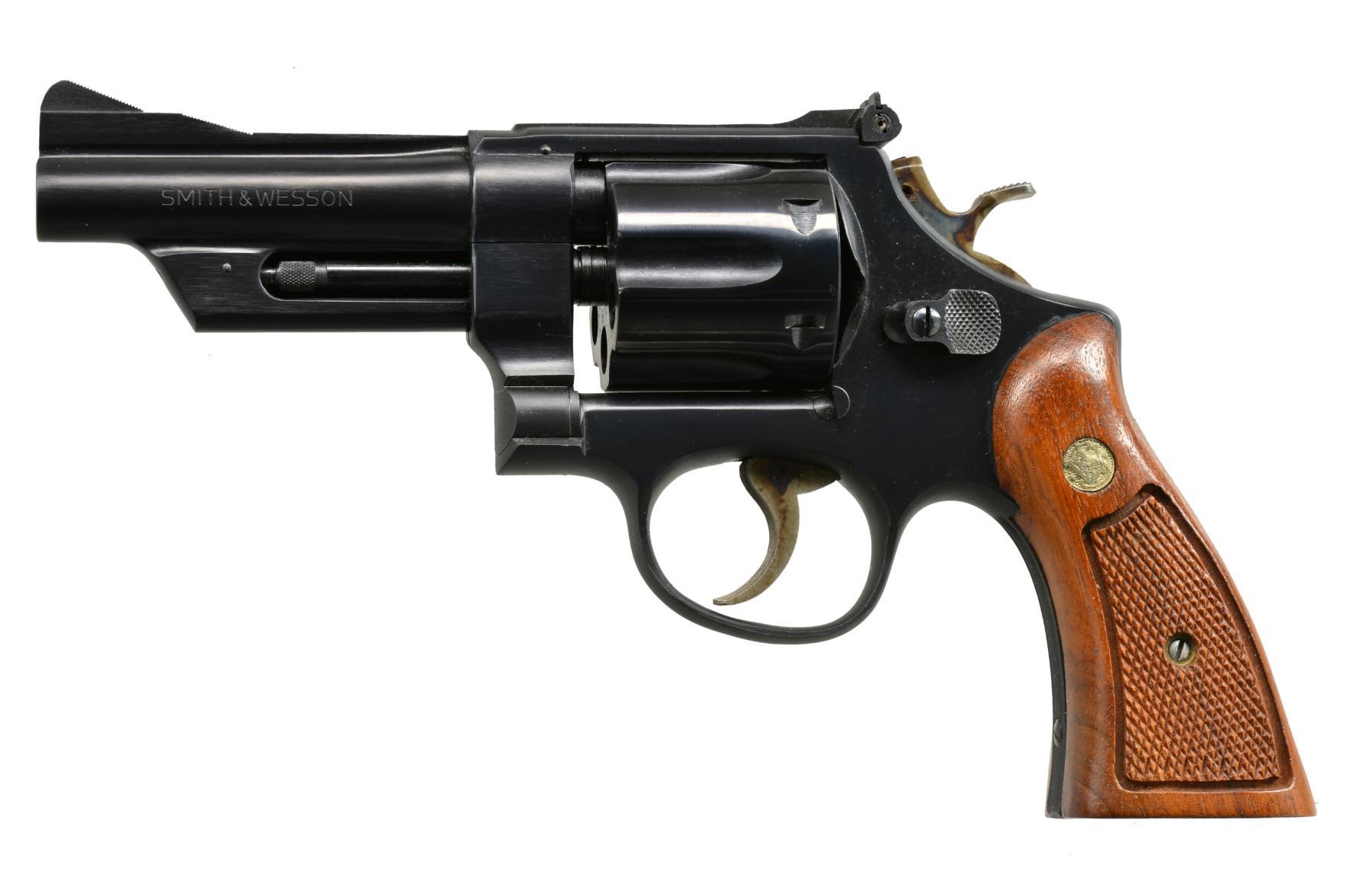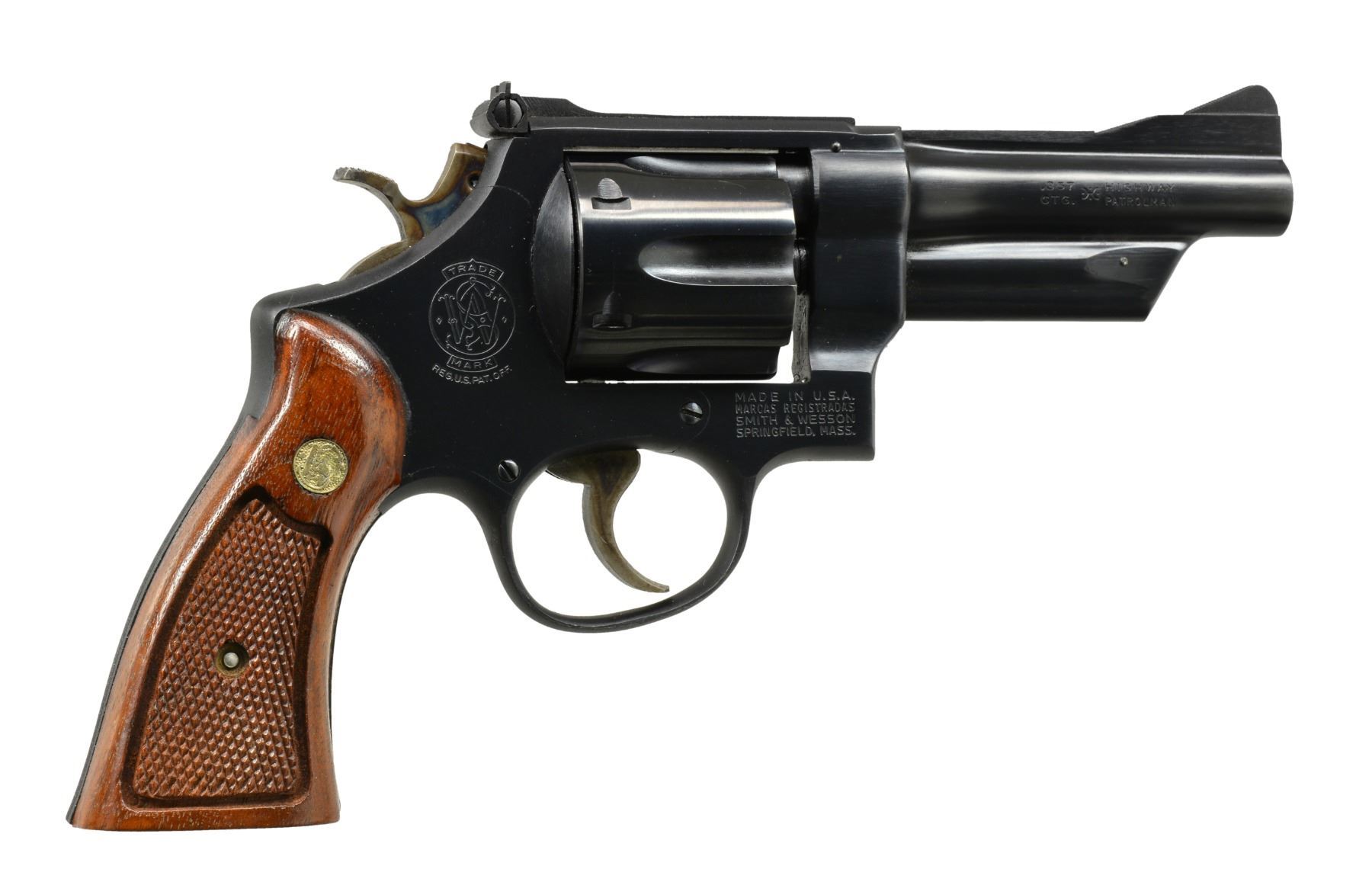 REVOLVER. Cal. 357 Mag. S# N503185. Bbl. 4" rnd. w/ rib & extractor shroud. Serrated ramp front sight w/ square notch adj. rear sight. 6 Shot fluted cyl. Blue finished 3 screw action w/ pinned bbl. Case colored hammer & serrated trigger. 2 Piece checkered walnut Magna grips w/ silver S&W medallions. CONDITION: near excellent retaining over 98% wood & metal finish. Bore is bright w/ sharp rifling. (20-845/DS). MODERN. $600-800.