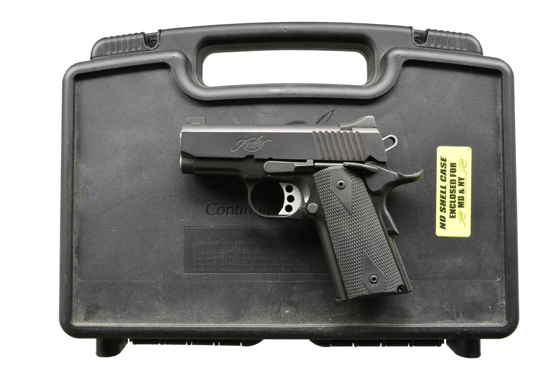 Cal. 45 ACP. S# KU79494. Bbl. 3". Pachmayr hard rubber grips. 2 Tone matte black finish. Lightweight skeletonized hammer & trigger. Extended beavertail safety. Straight checkered mainspring housing. Subdued high profile sights. Full length guide rod. MAGS: 1-6 rd. CONDITION: very good overall. Appears to have seen very little use. No outward signs of holster or storage wear. Shiny bore w/ good rifling. (20-348/JZ). MODERN. $600-900.