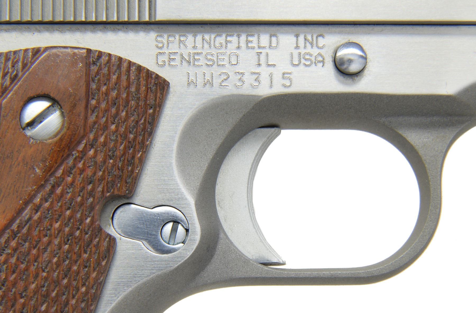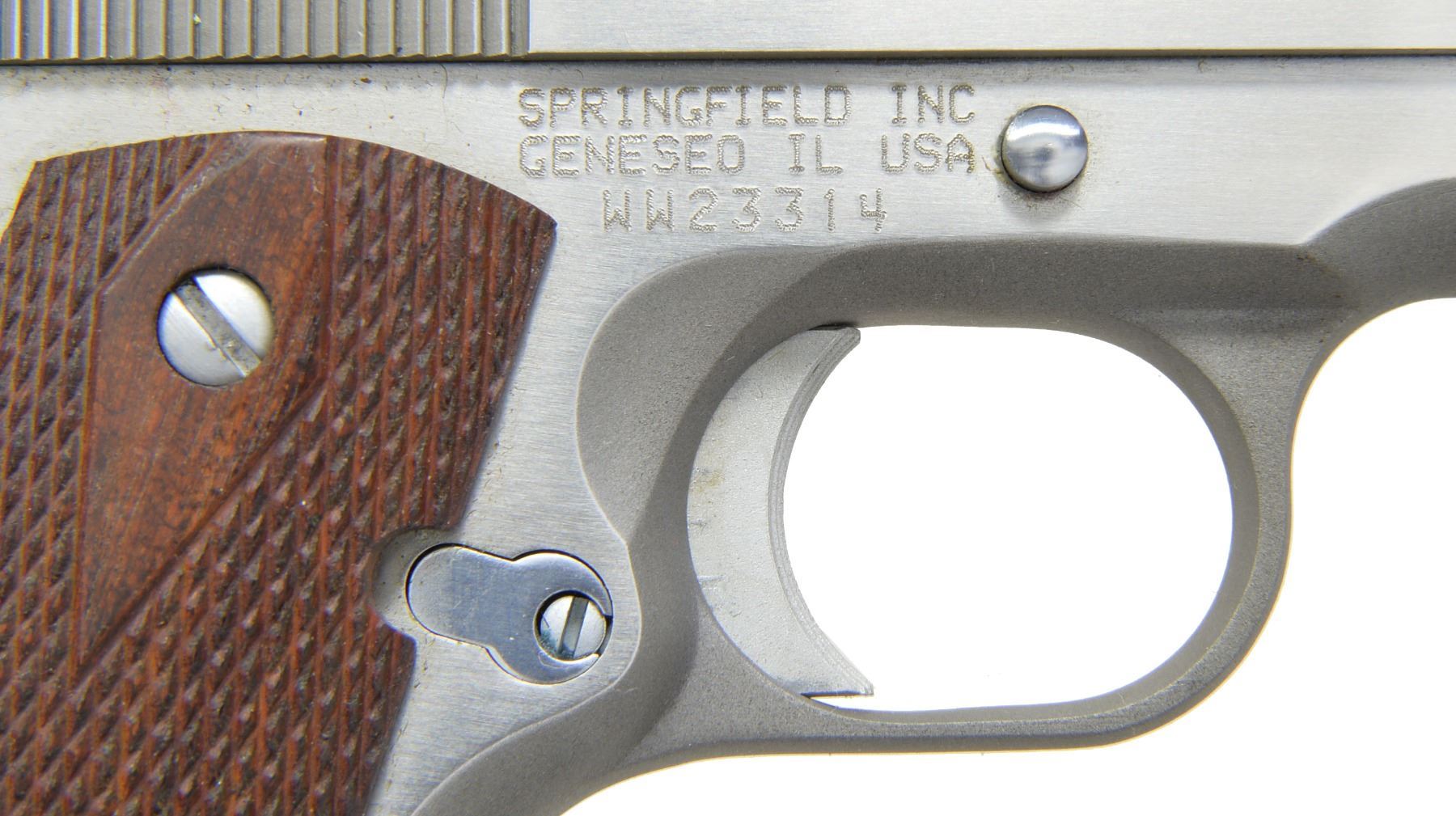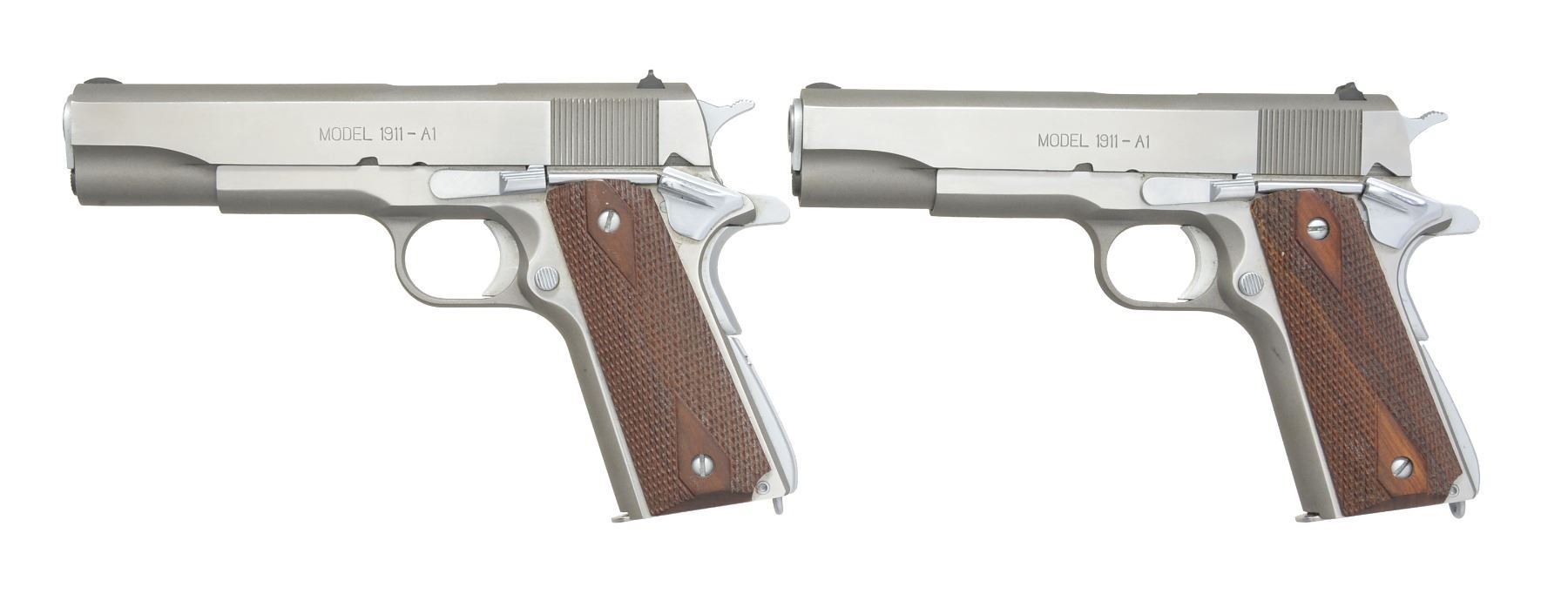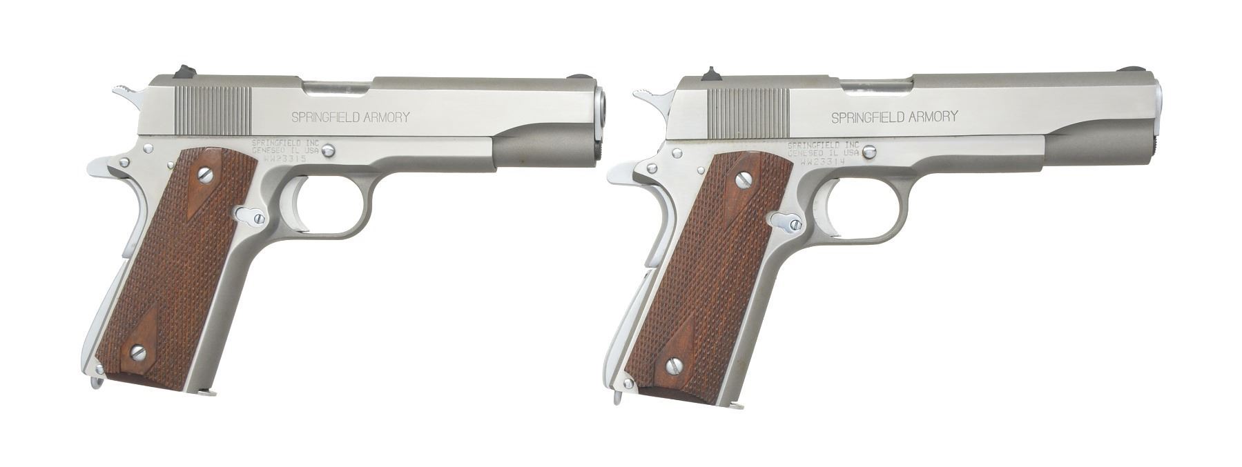 SEMI AUTO PISTOLS. BOTH: cal. 45 ACP. Bbls. 5". Stainless steel finish. Checkered hardwood grips. Blade front sights. Dovetail rear sights. Backstrap safeties. Serrated arched mainspring housings. Lanyard loops. The "WW" prefix shows they were mfg. w/ WWII style attributes. MAGS: 2-7 rd. total. CONDITION: both in very good condition w/ bright bores having strong rifling. 1) S# WW23315. (20-349/JZ). 2) S# WW23314. (20-350/JZ). BOTH MODERN. $1,000-2,000.