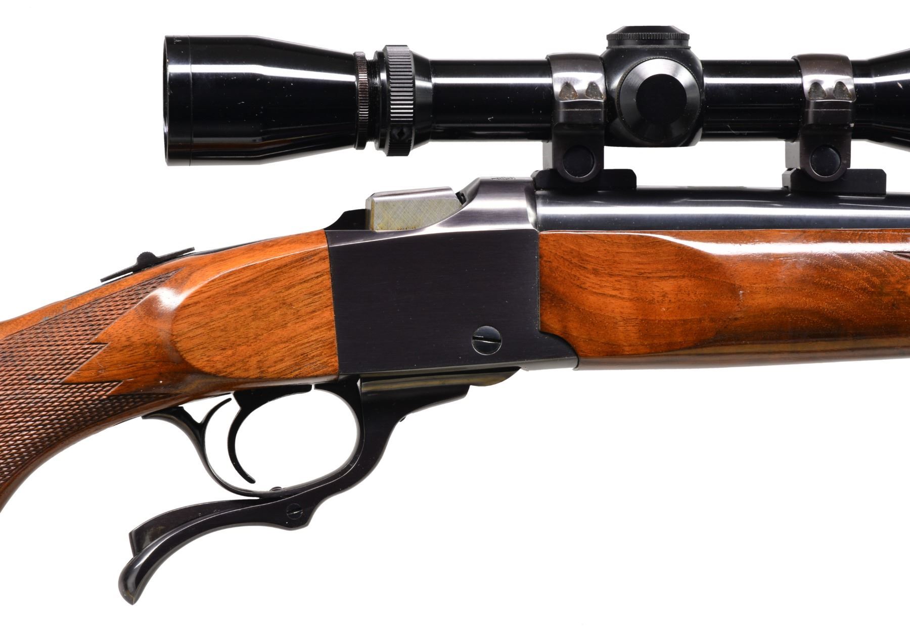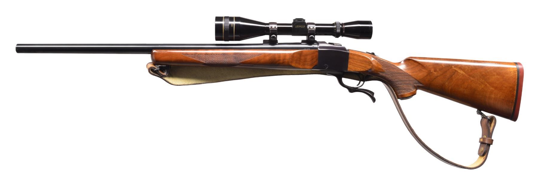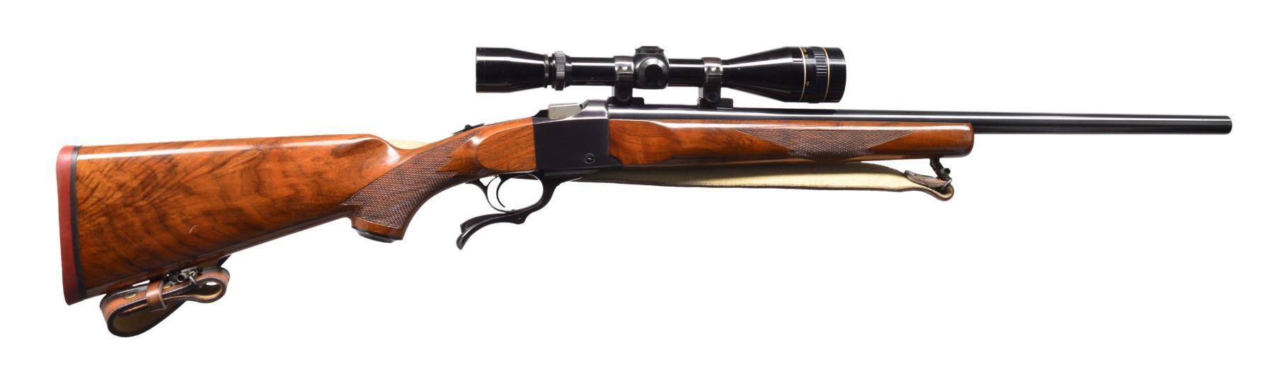Cal. 22-250. S# 130-44758. Bbl. 24" heavy weight w/out sights. Leupold 3-9 gloss finished scope w/ AO & duplex reticle on Ruger rings. Lever operated falling block action w/ tang safety. Blue finish. Semi beavertail forearm & capped straight comb fancy walnut stock w/ cut checkering & solid red pad. Custom leather sling w/ Ruger emblem on QD swivels. Mfg. 1977. CONDITION: 98% original blue. Wood shows sm. marks. Bright near excellent bore. Scope has bright optics. (20-146/DS). MODERN. $700-1,100.