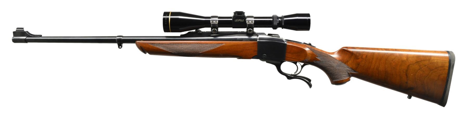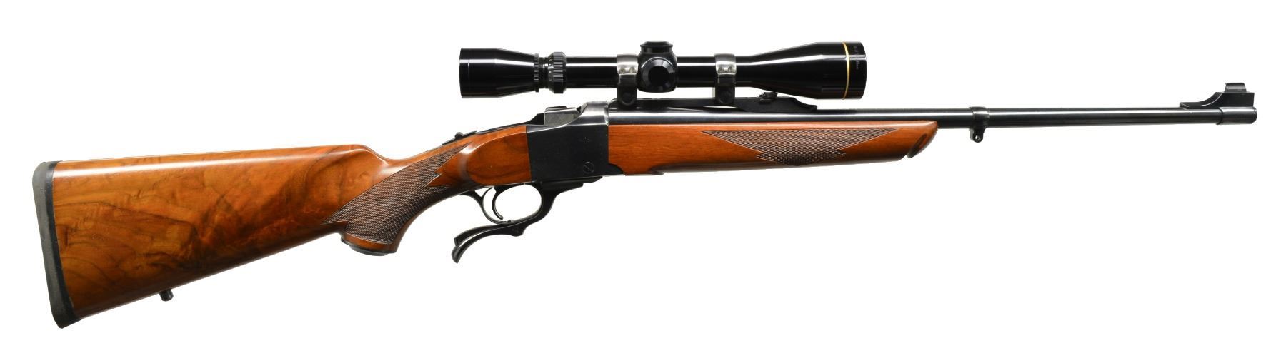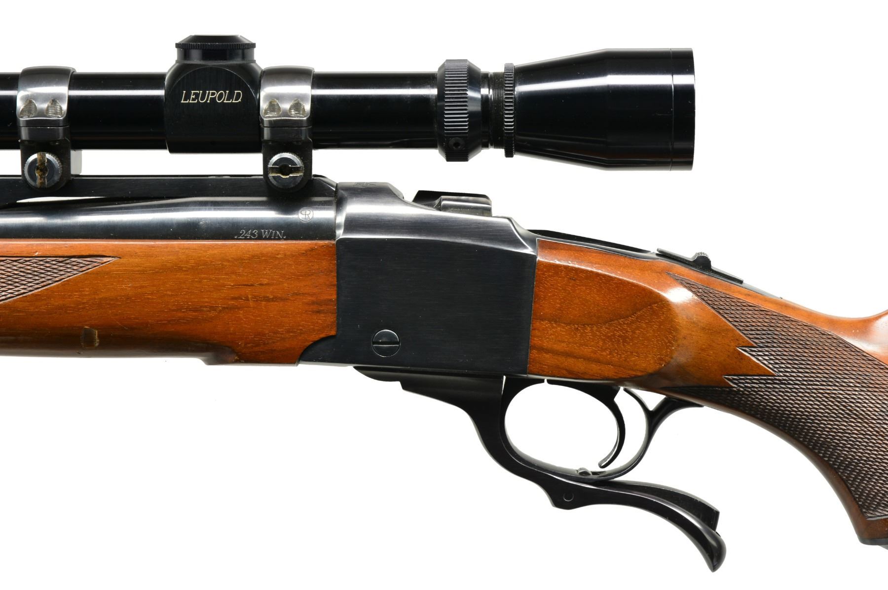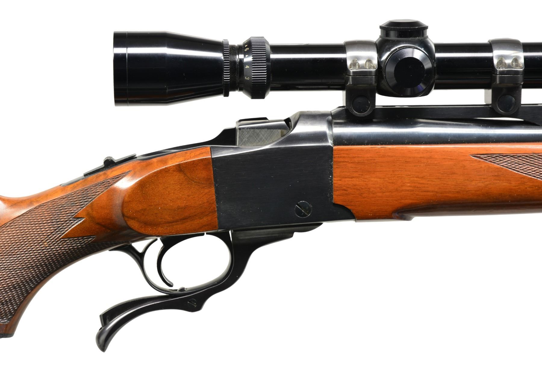 Cal. 243 Win. S# 132-08341. Bbl. 22" w/ banded front sight allowing for quick sight changes w/out tools plus bbl. band QD sling stud. Standard quarter rib at rear w/ folding sight plus Ruger rings & Leupold VX-II 3-9X40mm gloss black duplex reticle scope. Mfg. 1981 w/ Alex Henry forend. Buttstock w/ nice figure, steel grip cap, QD sling stud & replacement Ruger black pad. CONDITION: overall very good appearance w/ only very faint beginning high point wear on metal finish. Forend w/ light marks, noticeable dent at lower left between receiver & checkering plus 2" crack at bottom left; receiver forward. Very minimal marks on buttstock having replacement pad well fitted but not factory work retaining standard LOP. Light damage to scope ring screws; all other aspects of scope set near excellent including optics. Bore near excellent. (20-291/NW). MODERN. $750-1,000.