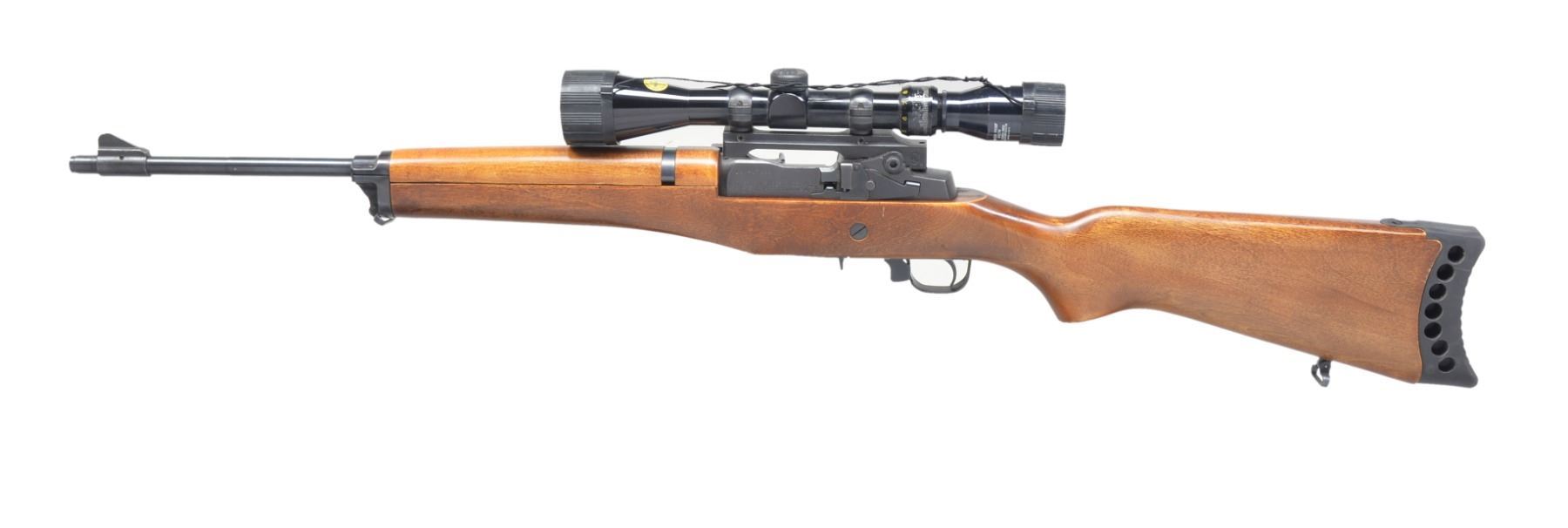 Cal. 223 Rem. S# 180-17292. Bbl. 18 1/2". Band mounted serrated ramp front sight. 180 Series action fitted w/ S&K top mt. holding Tasco 3-9x40 gloss finished scope w/ duplex reticle. Hardwood handguard & pistol grip stock w/ sling swivels & aftermarket rubber extension pad. MAGS: 5-10 rd., 4-20 rd. & 1-30 rd. w/ green nylon bag & 2 mag. holder. CONDITION: 95% blue. Wood shows scattered scratches & marks. Scope has good optics. Bright bore w/ sharp rifling. (19-5605/DS). MODERN. $500-700.