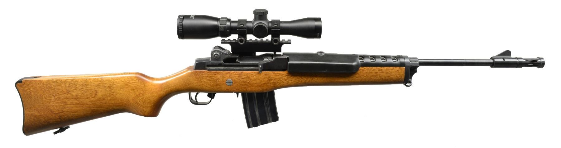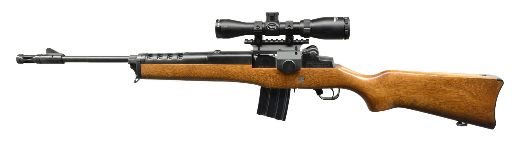 Cal. 223. S# 181-77953. Bbl. 20 1/4" over flash hider. Front sight fixed blade, rear sight peep windage adj. Plastic, ventilated hand guard. Hard wood stock. Has an added 5" picatinny rail mounted above receiver w/ 1.5-4.5 B.S.A. optical sight, scope mount has pass through to utilize the bolt hold open device. Sling swivels front & rear. Aftermarket slip on & pinned flash hider. MAGAZINE: 1 - 20 rd. steel magazine. CONDITION: all exterior metal surfaces have a dark rich blue finish w/out any significant visible wear or defect; bore is shiny w/ good rifling; fire control mechanism appears to function correctly when cycled by hand. (20-468/JZ). MODERN. $400-600.