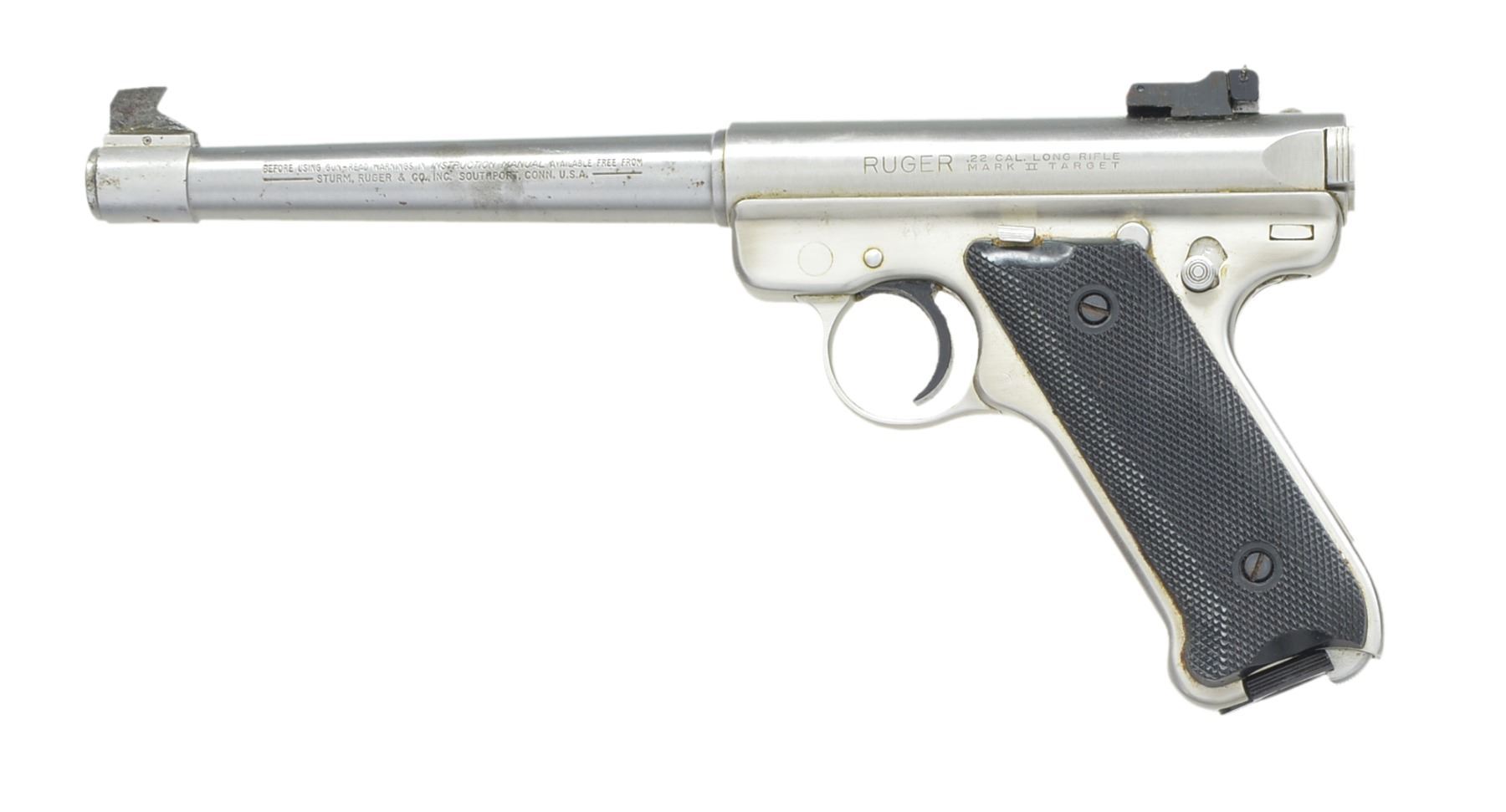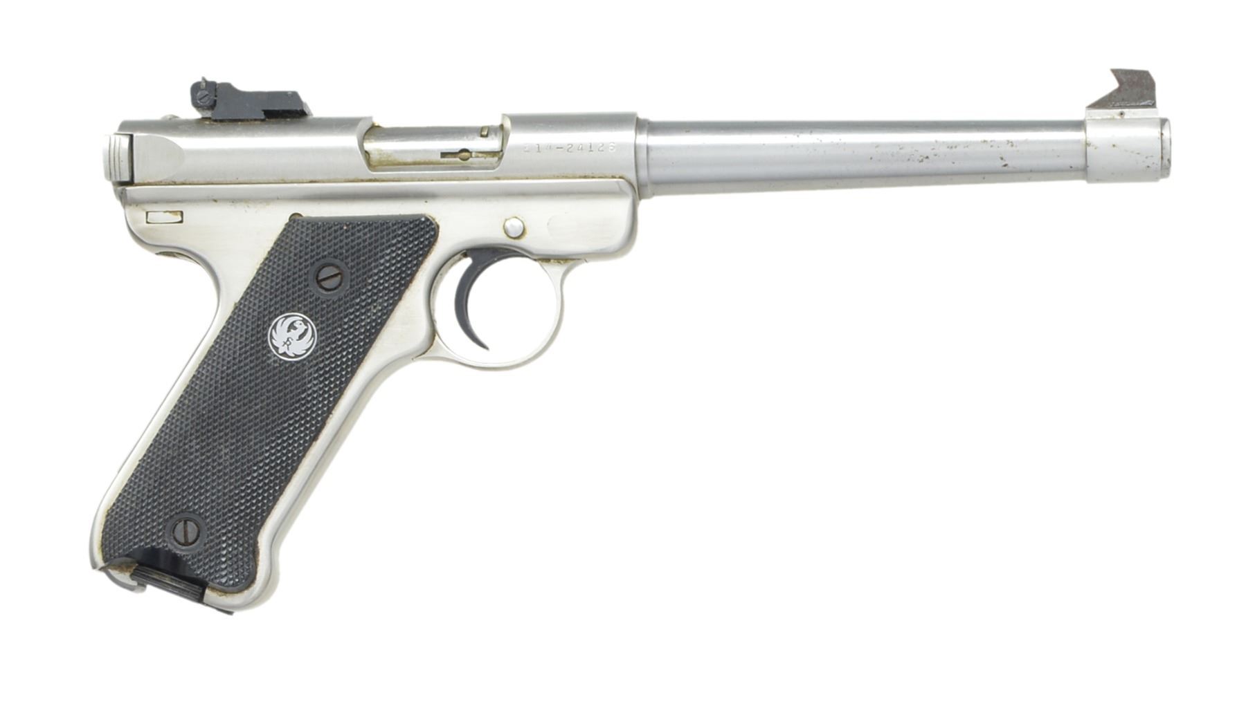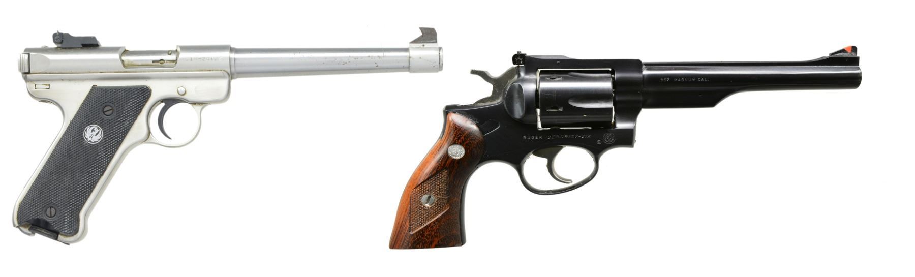 1) MKII TARGET SEMI AUTO PISTOL. Cal. 22 LR. S# 214-24126. Bbl. 6 7/8" w/ Patridge front sight & square notch adj. rear sight. Stainless steel construction. 2 Piece black eagle checkered plastic grips. MAGS: 1 detachable 10 rd. UNATTACHED ACCESSORIES: instruction manual. CONDITION: stainless finish shows spots of corrosion & pitting on bbl. & takedown lever. Very good grips. Bright bore w/ sound rifling. (20-214/DS). 2) SECURITY-SIX DA REVOLVER. Cal. 357 Mag. S# 161-66646. Bbl. 6" w/ rib & ejector housing. Red serrated ramp front sight w/ adj. square notch rear sight. 6 Shot fluted cyl. Blue finish w/ stainless steel hammer & trigger. 2 Piece checkered wood grips w/ silver Ruger medallions. CONDITION: over 98% original blue showing a faint cyl. drag line. Grips have very good finish. Bright bore w/ sharp rifling. (20-215/DS). BOTH MODERN. $550-750.