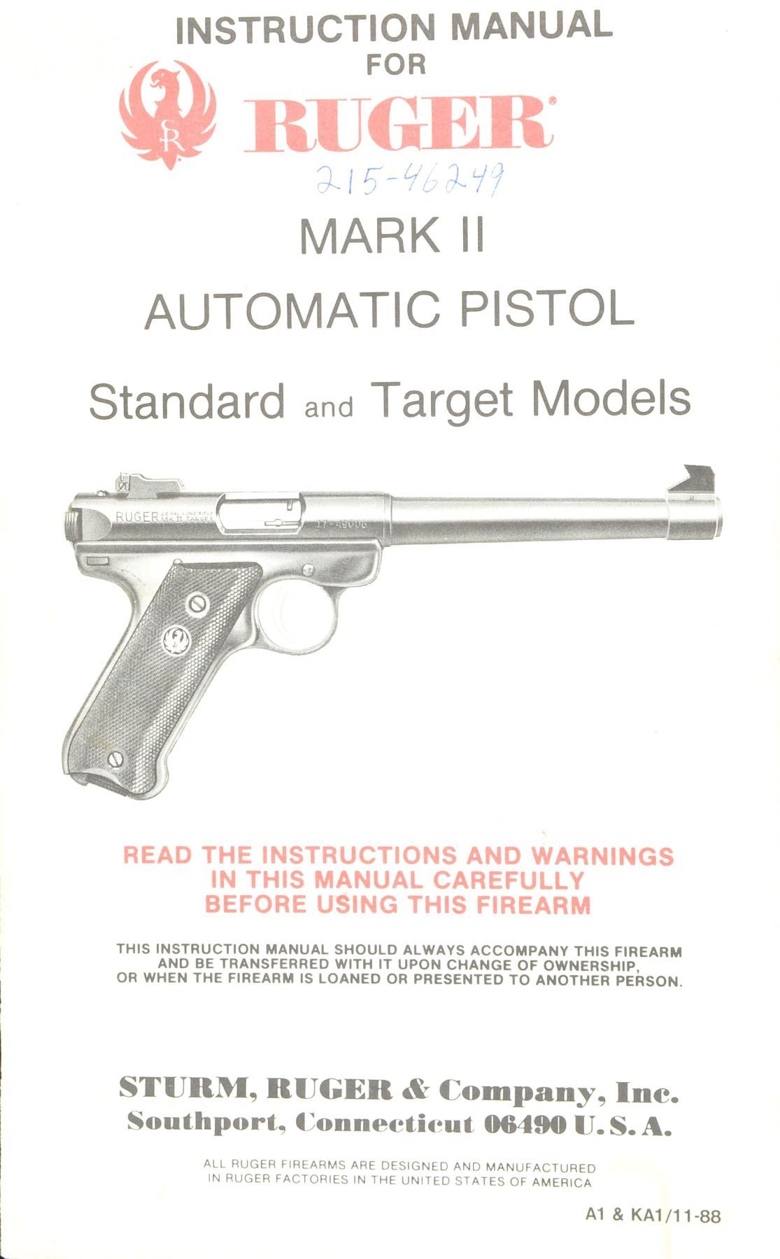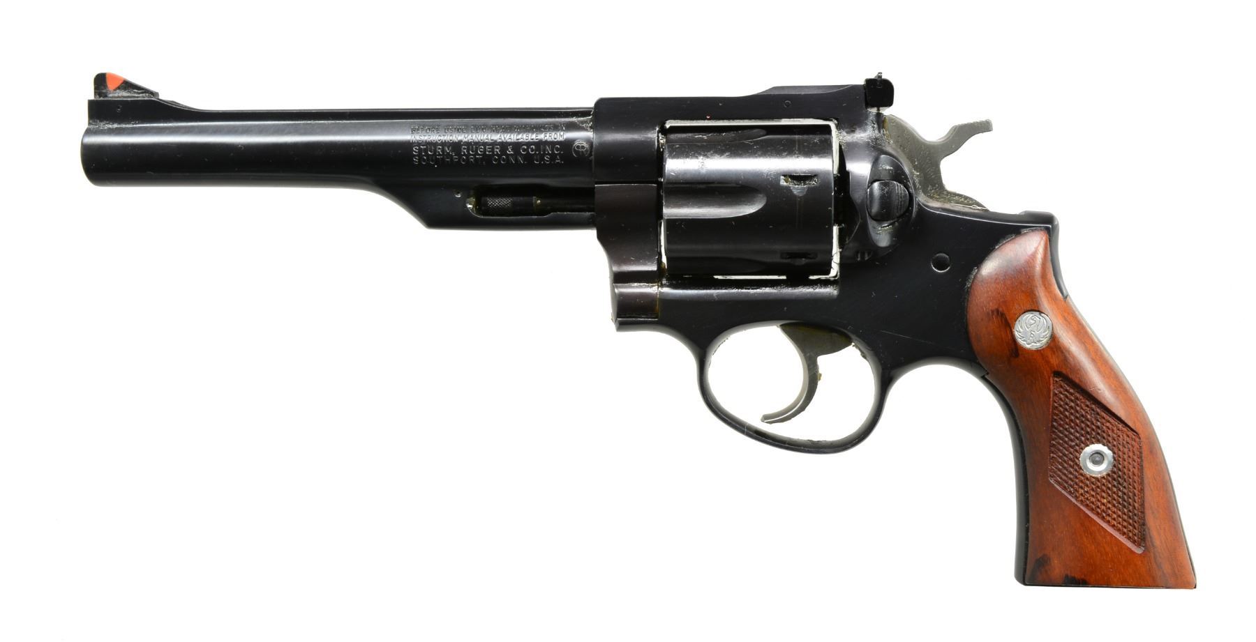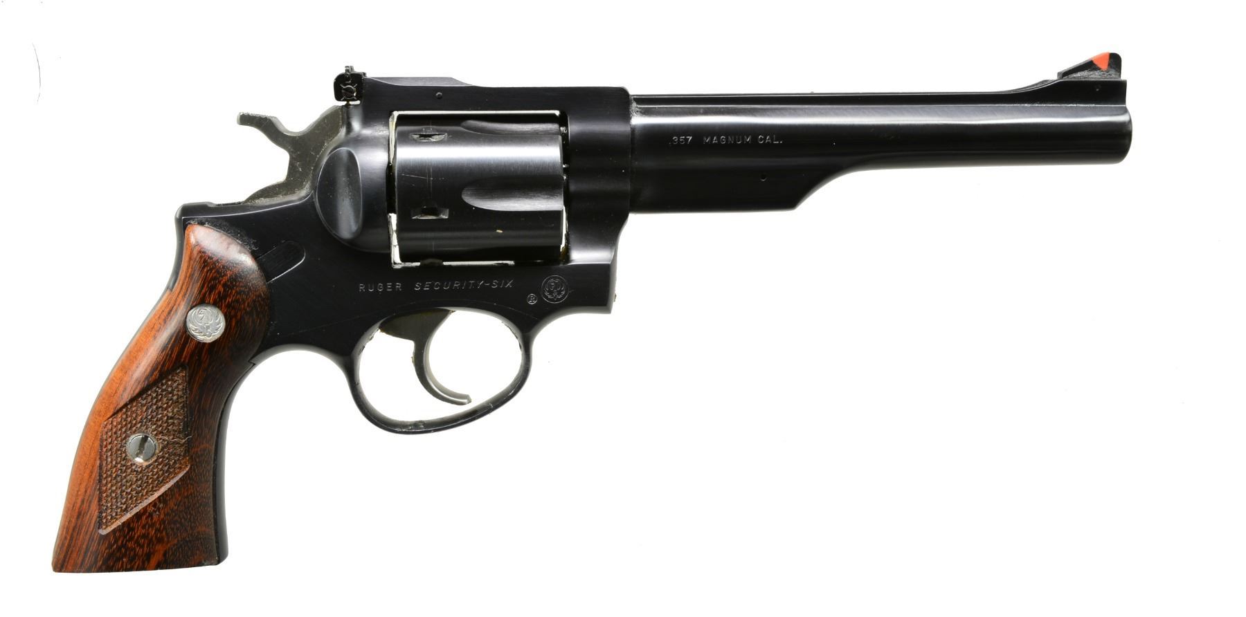 1) MKII TARGET SEMI AUTO PISTOL. Cal. 22 LR. S# 214-24126. Bbl. 6 7/8" w/ Patridge front sight & square notch adj. rear sight. Stainless steel construction. 2 Piece black eagle checkered plastic grips. MAGS: 1 detachable 10 rd. UNATTACHED ACCESSORIES: instruction manual. CONDITION: stainless finish shows spots of corrosion & pitting on bbl. & takedown lever. Very good grips. Bright bore w/ sound rifling. (20-214/DS). 2) SECURITY-SIX DA REVOLVER. Cal. 357 Mag. S# 161-66646. Bbl. 6" w/ rib & ejector housing. Red serrated ramp front sight w/ adj. square notch rear sight. 6 Shot fluted cyl. Blue finish w/ stainless steel hammer & trigger. 2 Piece checkered wood grips w/ silver Ruger medallions. CONDITION: over 98% original blue showing a faint cyl. drag line. Grips have very good finish. Bright bore w/ sharp rifling. (20-215/DS). BOTH MODERN. $550-750.