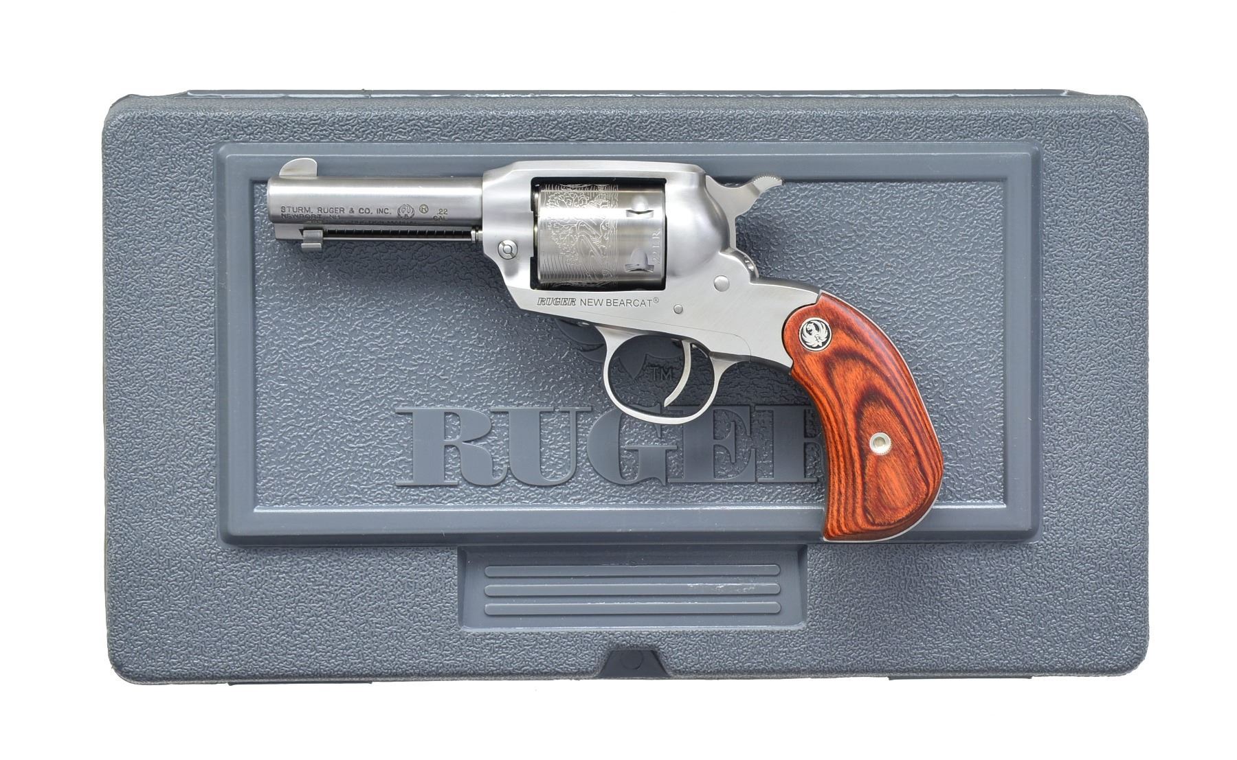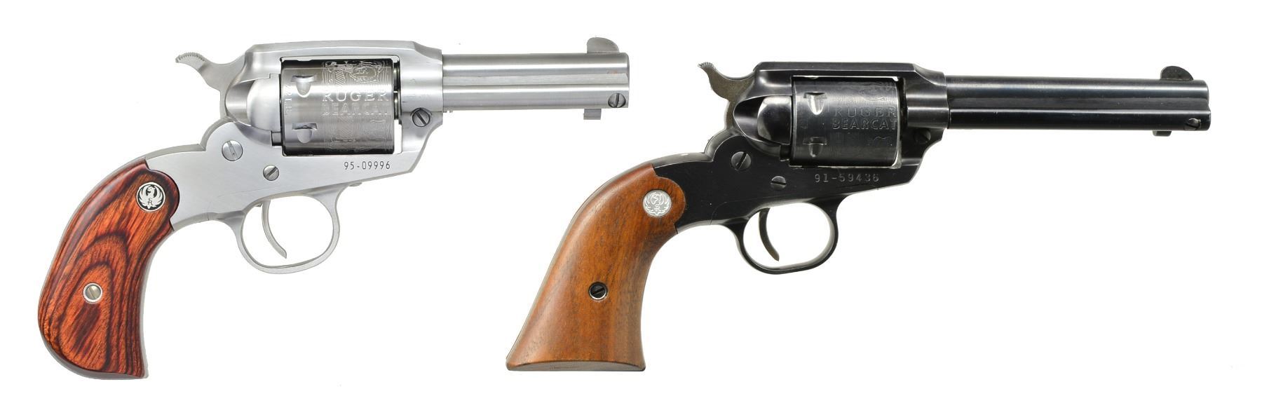 BOTH: cal. 22 LR. Unfluted roll marked cyls. Rounded blade front sights & frame notched rears. 1) NEW BEARCAT. S# 95-09996. Bbl. 3". Mfg. 2016 for exclusive distribution by Lipsey's. Stainless w/ birds head grip having laminated walnut grips & silver eagle medallions. Slim trigger & wide spur hammer operating new designed safety transfer bar system. UNATTACHED ACCESSORIES: factory gray plastic box & packaging. CONDITION: all aspects near excellent including bore; appears new & unfired. (20-1330/NW). 2) SUPER BEARCAT. S# 91-59436. Bbl. 4" marked w/".22 / CAL." having alloy ejector housing. Mfg. 1973 w/ all steel (including trigger guard) blued finish. Original lock work w/out factory safety update. Smooth walnut grips w/ all silver eagle medallions. CONDITION: slight wear to cyl. stop leads along w/ very faint turn line. Light wear on left side of bbl. at muzzle. Staining on sides of hammer & trigger. Scattered pinprick oxidation throughout. Near excellent bore & grips. (20-1349/NW). BOTH MODERN. $700-1,000.