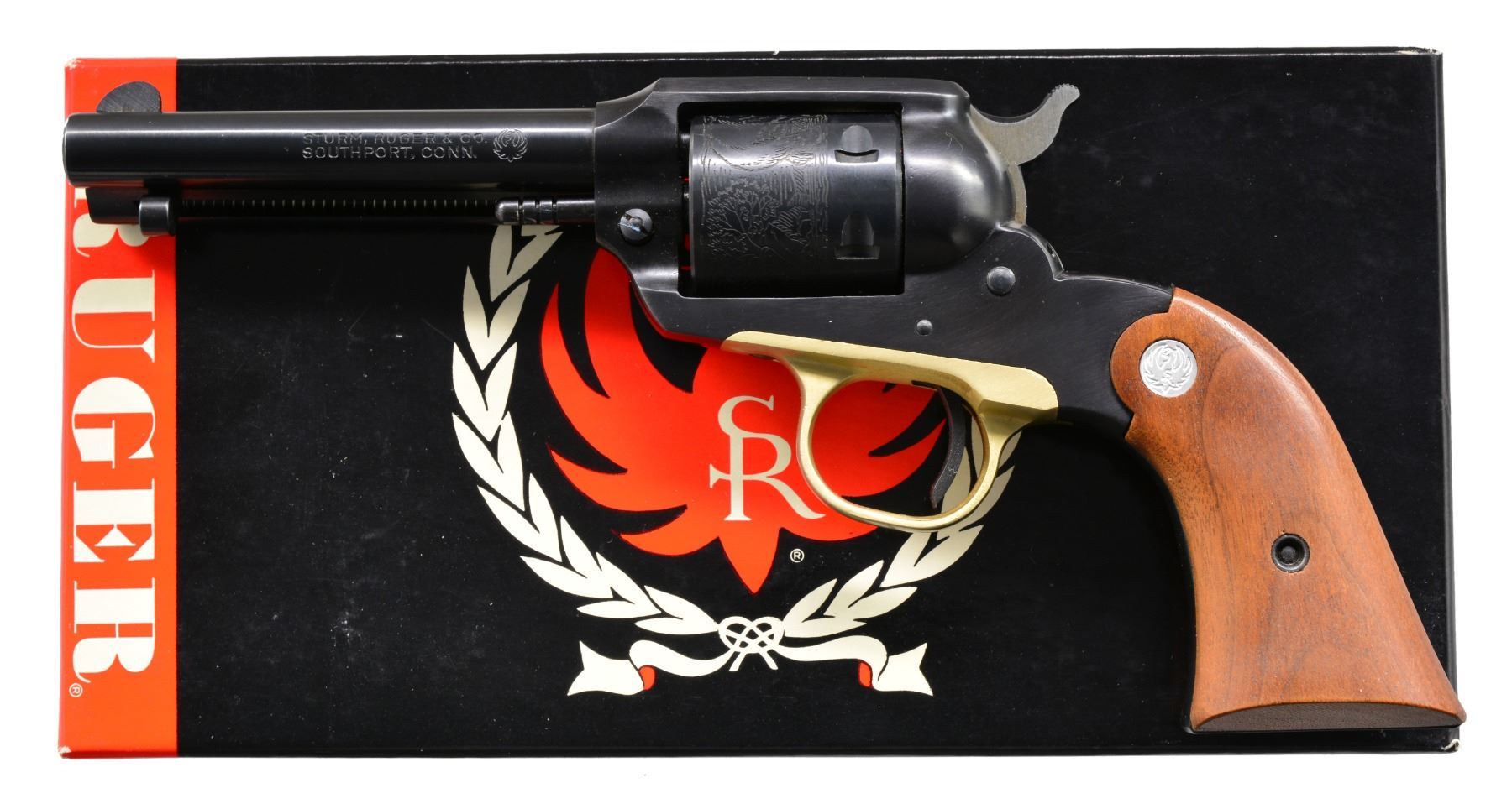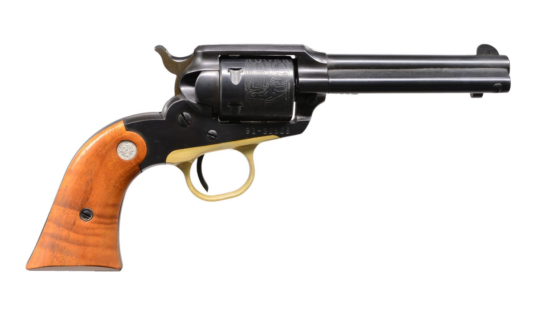 BOTH: cal. 22 LR. Bbls. 4" w/ blade front sights & square notch rear sights. 6 Shot rnd. roll engraved cyls. Blue finished bbls., cyls. & steel frames. Brass anodized aluminum trigger guards. 2 Piece walnut grips w/ silver eagle medallions. Mfg. 1972. 1) S# 91-30770. UNATTACHED ACCESSORIES: original 2 piece red & black box. Box shows light tattering. CONDITION: near excellent retaining over 99% original wood & metal finish. Bright near excellent bore. (20-57/DS). 2) S# 91-32528. UNATTACHED ACCESSORIES: original 2 piece red & black box containing instructions. CONDITION: over 98% wood & metal finish showing slight cyl. drag line. Anodized trigger guard shows very slight fading. Bore is bright w/ near excellent rifling. (20-58/DS). BOTH MODERN. $900-1,200.