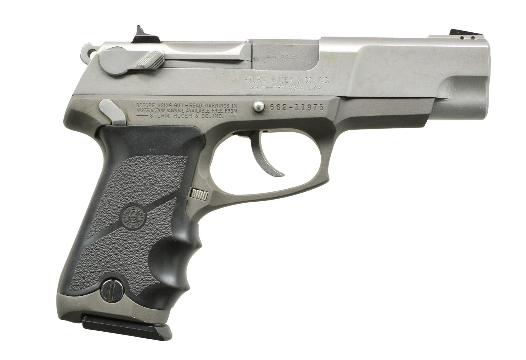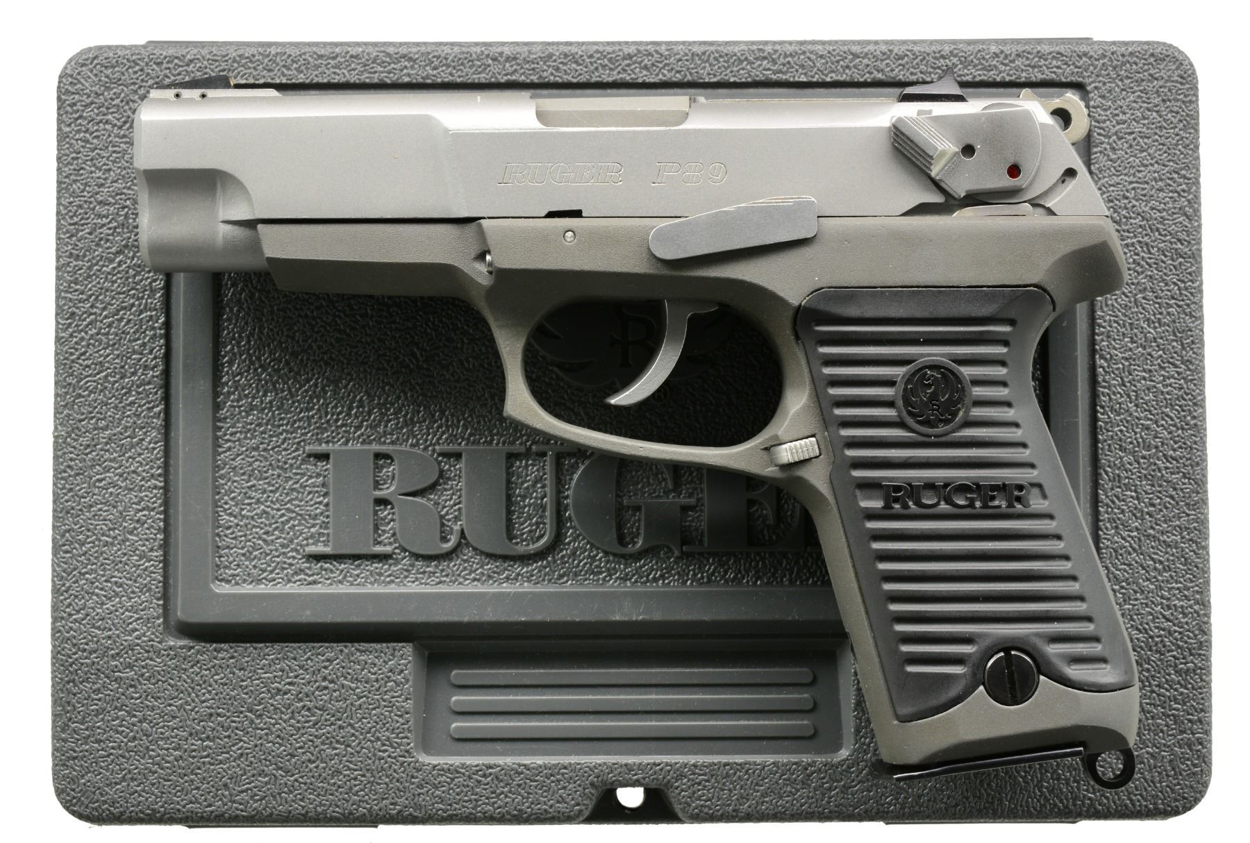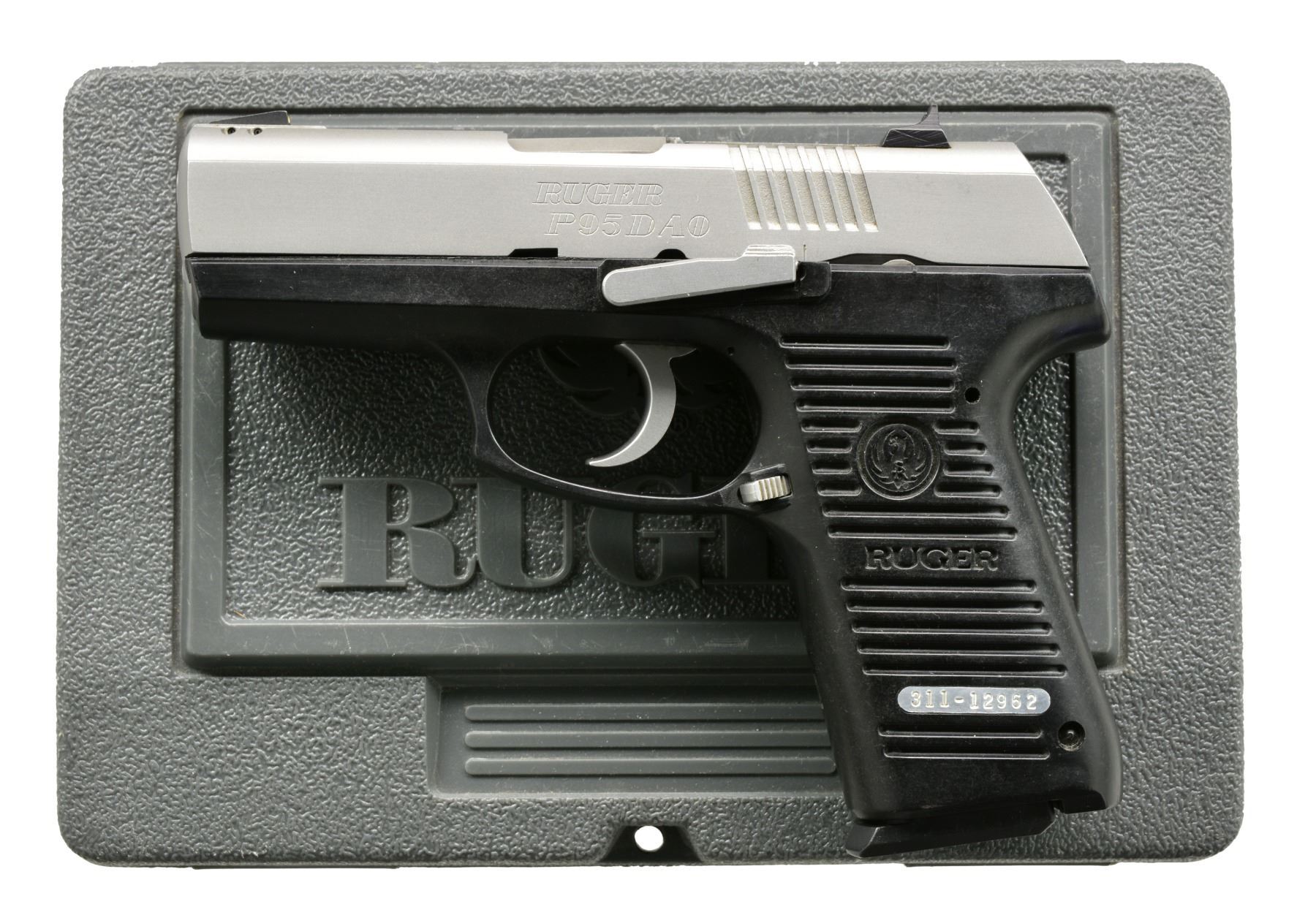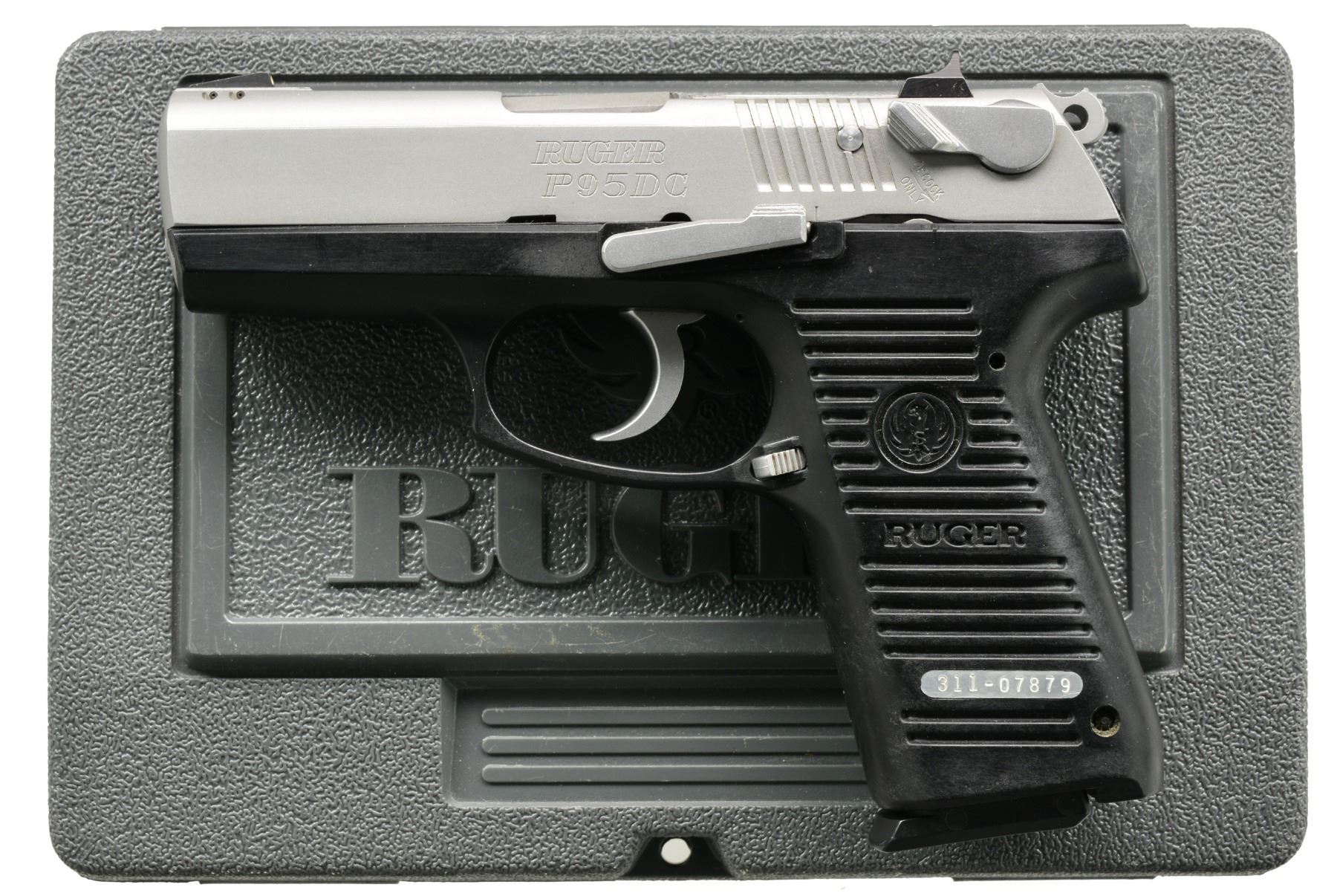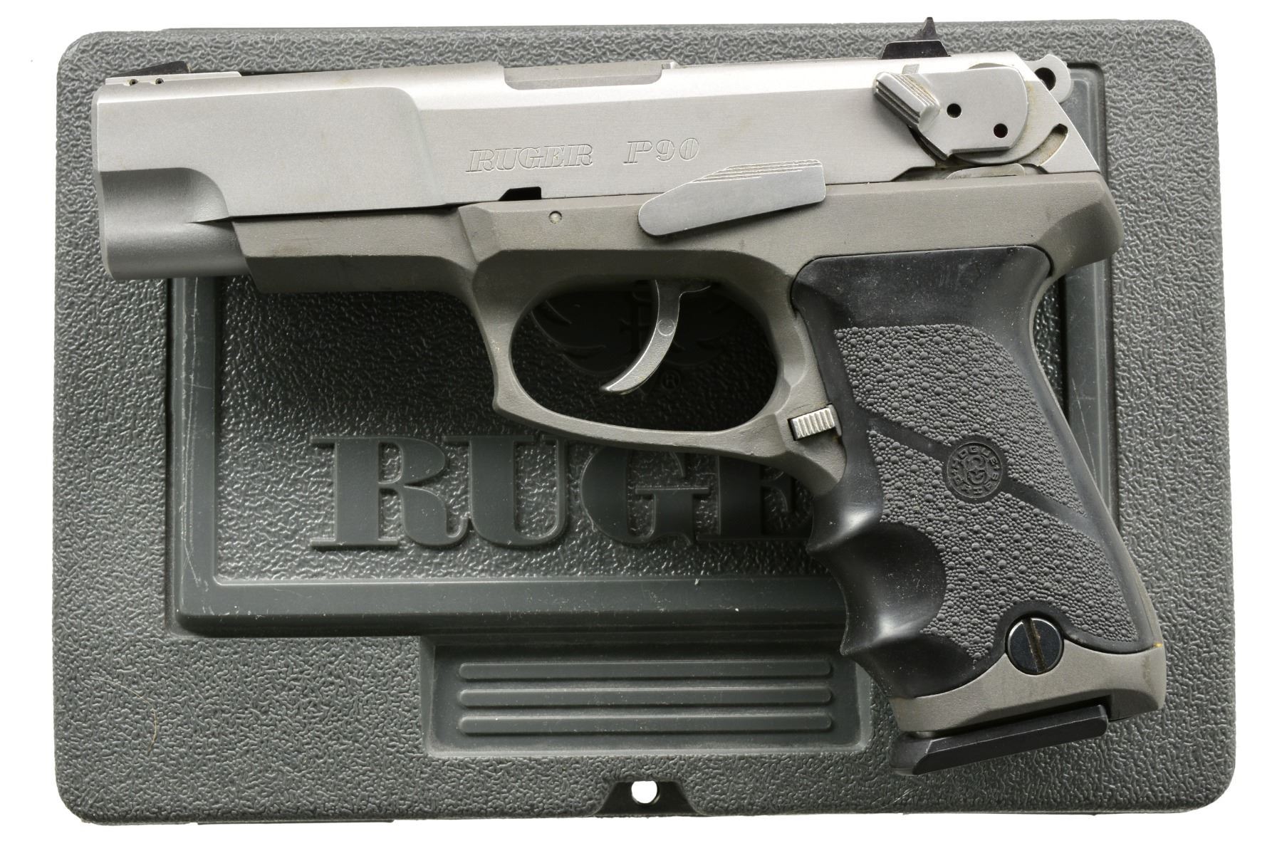 ALL: blued fixed 3 dot sight sets. CONDITION: all aspects of the 4 pistols near excellent including bores. 1) MODEL P90. Cal. 45 ACP. S# 662-11975. Bbl. 4 1/2". Mfg. 2000 w/ matte alloy frame having Hogue finger grooved grips. Ambidextrous safety. MAGS: 3 factory 8 rd. UNATTACHED ACCESSORIES: original factory gray plastic case w/ packaging. (20-267/NW). 2) MODEL P95DC. Cal. 9mm Luger. S# 311-07879. Bbl. 3.9". Mfg. 1996 w/ polymer frame having ambidextrous mag. release. Ambidextrous decocking lever; no safety. MAGS: 1 factory 10 rd., & 1 factory 15 rd. UNATTACHED ACCESSORIES: original factory gray plastic case w/ packaging. (20-273/NW). 3) MODEL P95DAO. Cal. 9mm Luger. S# 311-12962. Bbl. 3.9". Mfg. 1996 w/ polymer frame having ambidextrous mag. release. DAO; no safety. MAGS: 2 factory 10 rd. stainless. UNATTACHED ACCESSORIES: original factory gray plastic case w/ packaging. (20-274/NW). 4) MODEL P89. Cal. 9mm Luger. S# 307-14144. Bbl. 4 1/2". Mfg. 1993 w/ matte alloy frame having standard Ruger logo plastic grips & ambidextrous mag. release. Ambidextrous safety. MAGS: 2 factory 15 rd. UNATTACHED ACCESSORIES: factory gray plastic case w/ packaging; no label. (20-275/NW). ALL MODERN. $ 900-1,400.