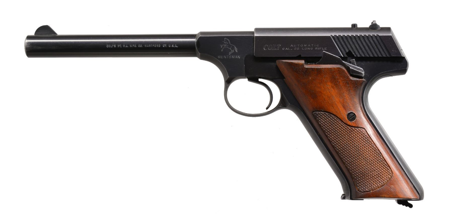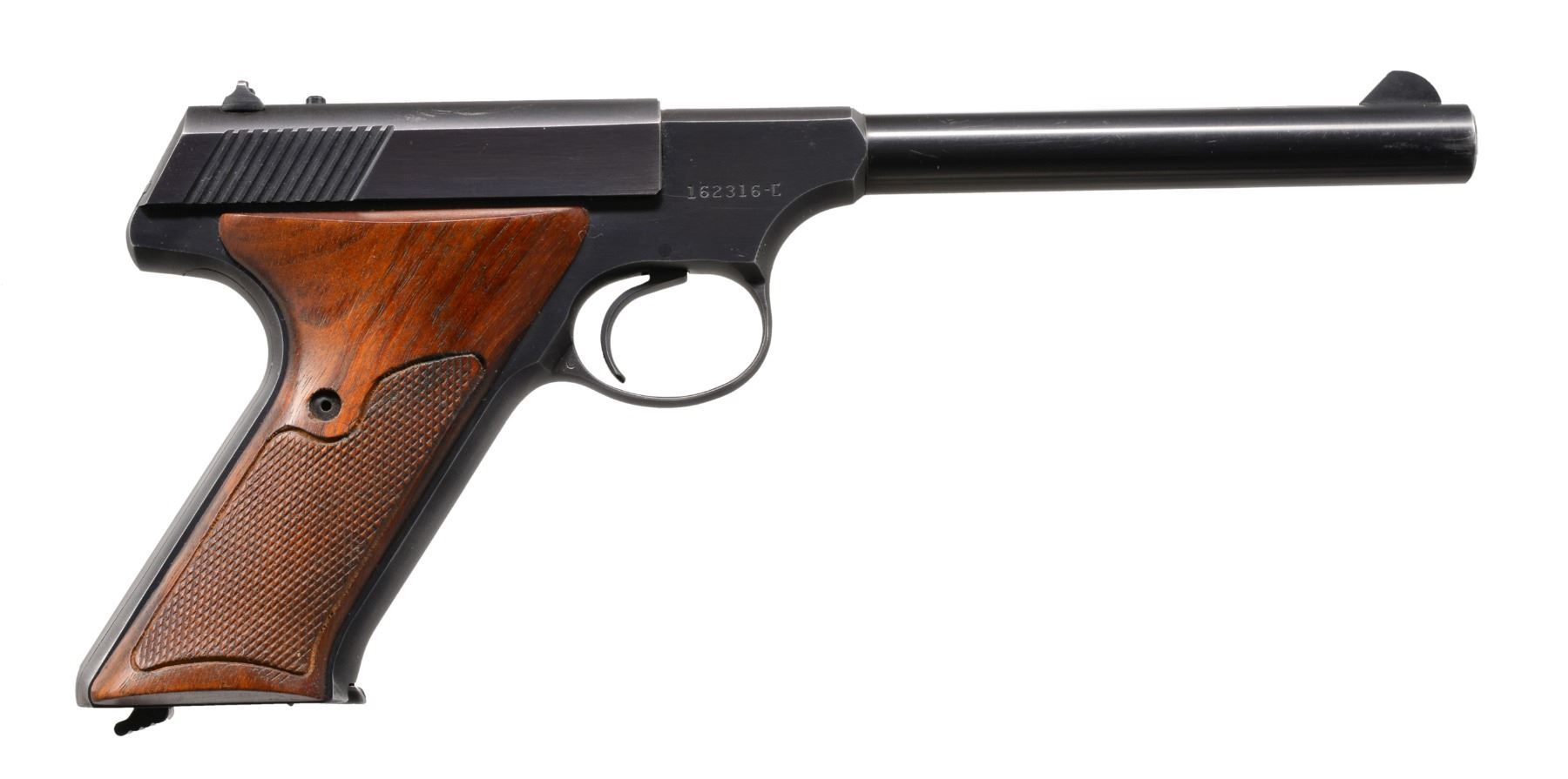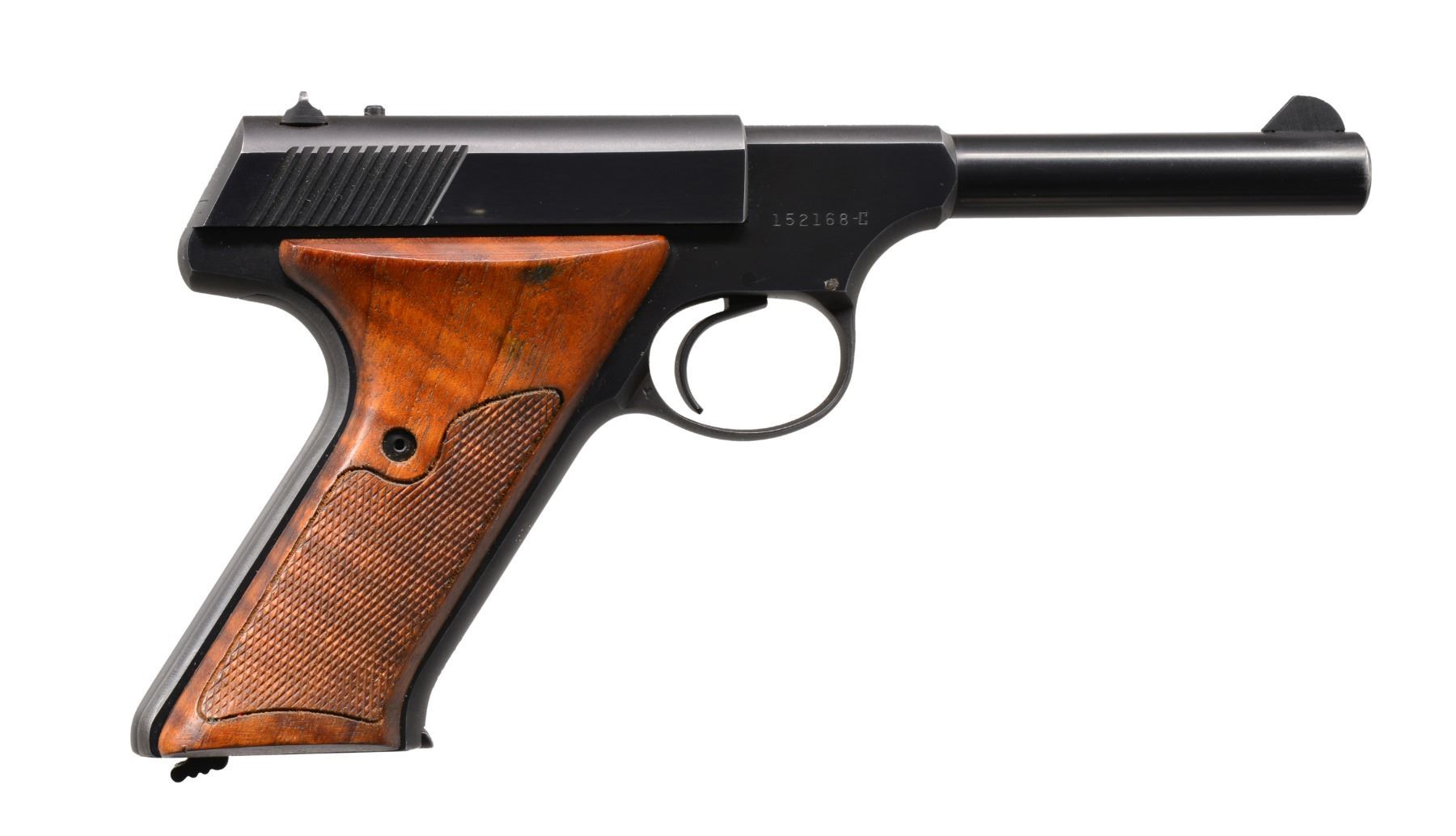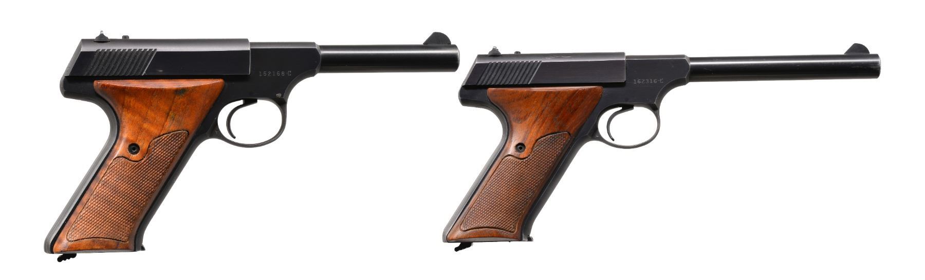 BOTH: cal. 22 LR. Serrated ramp front sights w/ fixed square notch rear sights. Blue finish. 2 Piece checkered walnut grips. 1) S# 152168-C. Bbl. 4 1/2". Mfg. 1960. MAGS: 1 detachable 10 rd. CONDITION: over 90% blue showing wear at muzzle & grip straps w/ scattered sm. spots of finish loss. Grips show light wear & marks. Bore is bright w/ strong rifling. (20-157/DS). 2) S# 162316-C. Bbl. 6". MAGS: 1 detachable 10 rd. CONDITION: over 90% blue showing light wear at muzzle, grip straps & edges. Grips show light wear. Bright bore w/ strong rifling. (20-158/DS). BOTH CURIO. $800-1,100.