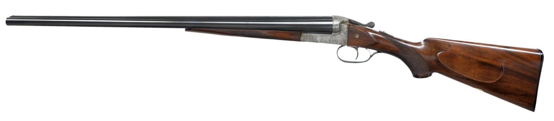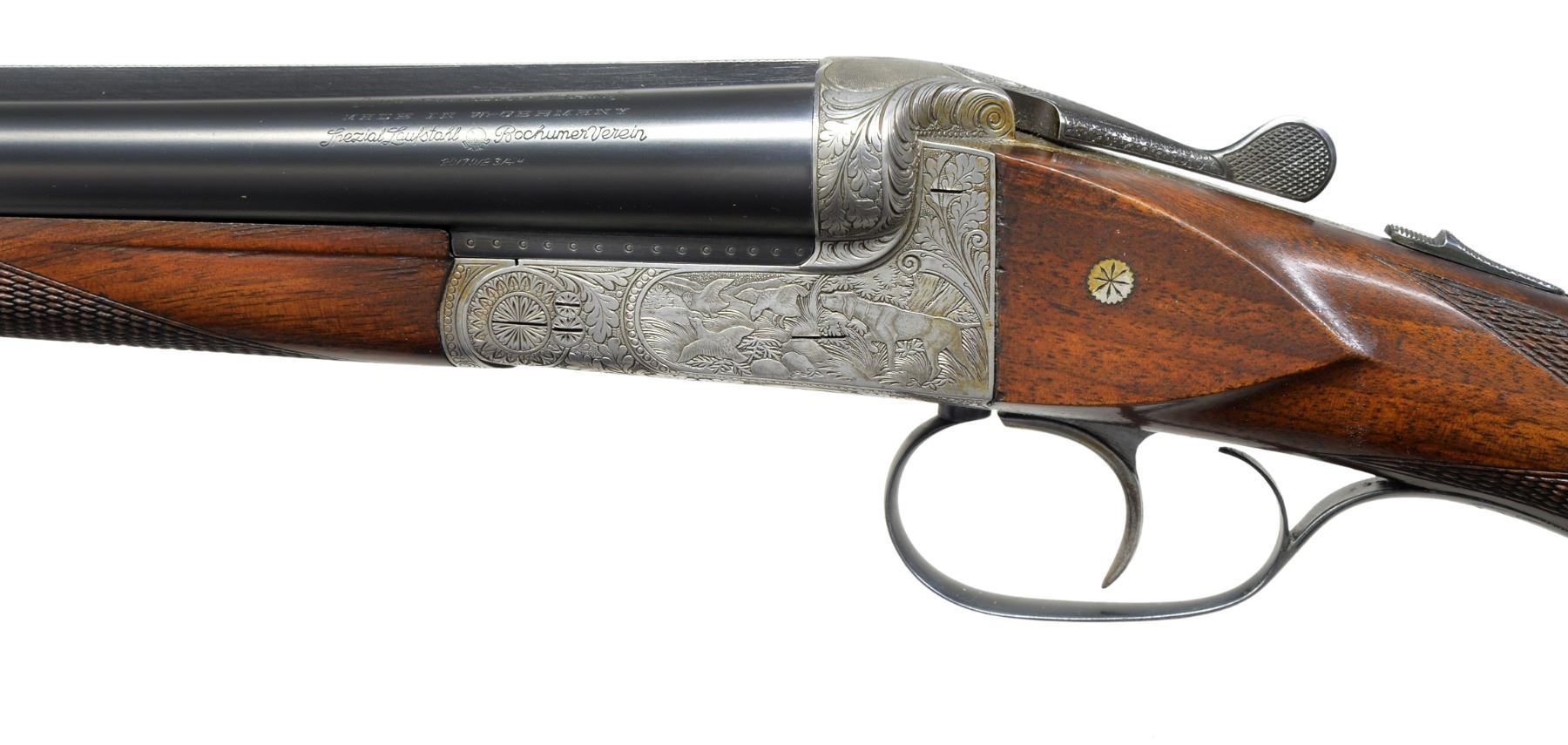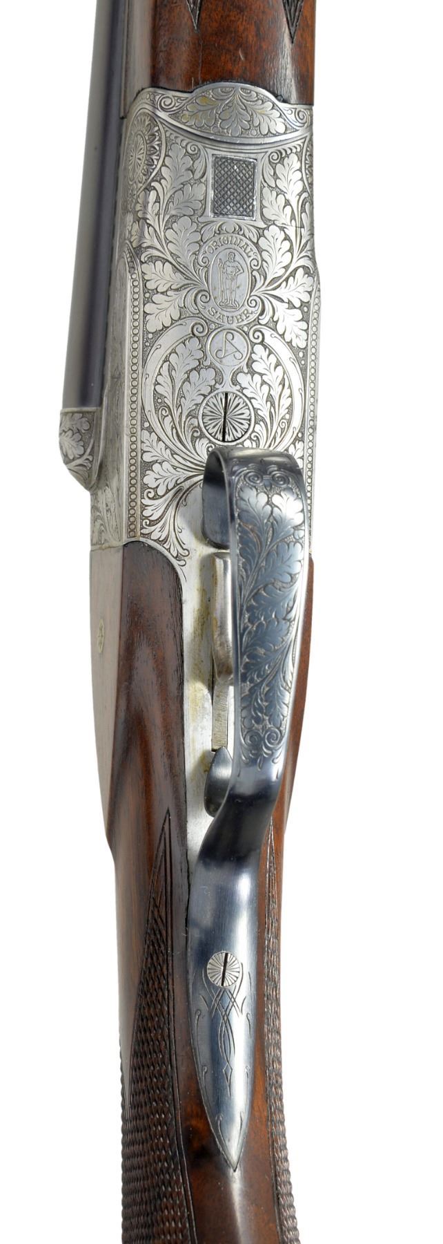 TRIGGER SHOTGUN WITH SPECIAL ORDER ENGRAVING. Cal. 20 Ga. S# 295002. This fine gun was proofed in 1959 & appears to be a Model 60 Deluxe. 26" Shoe lump bbls. have slightly raised matted rib. Sauer markings are on tops. Bbl. flats have nitro proofs for 2 3/4" chambers. Coin finished straight backed action w/out side clips or Greener crossbolt, features automatic safety & non selective single trigger. Action is engraved in motif illustrated as "Style 02" in the 1958 SHOOTERS BIBLE at an extra cost of $174.00. This well cut engraving consists of near full coverage scrolling oak leaves in shaded background surrounding nicely detailed game scenes on sides; a pointer pointing a trio of grouse on left & a fox contemplating a pair of rising ducks on right. Sauer logo is on trigger plate. Blued trigger guard has more oak leaves on bow. Lightly marbled European walnut capped pistol grip buttstock measures 14 1/4" over Sauer hard rubber buttplate. Stock features right hand cheekpiece, point pattern checkering & a vacant gold oval. Matching splinter ejector forend has Deeley release. Bore diameters: left - .617, choke .006 (IC), right - .618, choke .003 (IC). Wall thickness: left - .040, right - .040. DAC: 1 11/16". DAH: 2 9/16". Neutral cast. LOP: 14 1/4". WEIGHT: 6 lbs.1 oz. UNATTACHED ACCESSORIES: blue canvas covered case lined in dark burgundy velvet, has combination lock & is in good condition. CONDITION: bbls. retain nearly all of their original blue. Action has nearly all its coin finish, darkened a bit on bottom. Top lever & trigger guard lightly silvered. Stocks have nearly all of their original finish w/ some light handling marks. Bores are bright & shiny. Action is tight. Ejectors are slightly out of time. Trigger appears to work well. There is some chipping of wood at interface of action & left cheek of buttstock. A transverse reinforcing pin appears to be factory. (19-5440/MGM38). CURIO. $1,500-2,500.