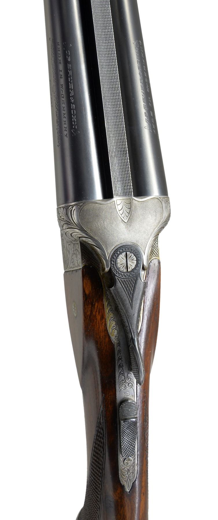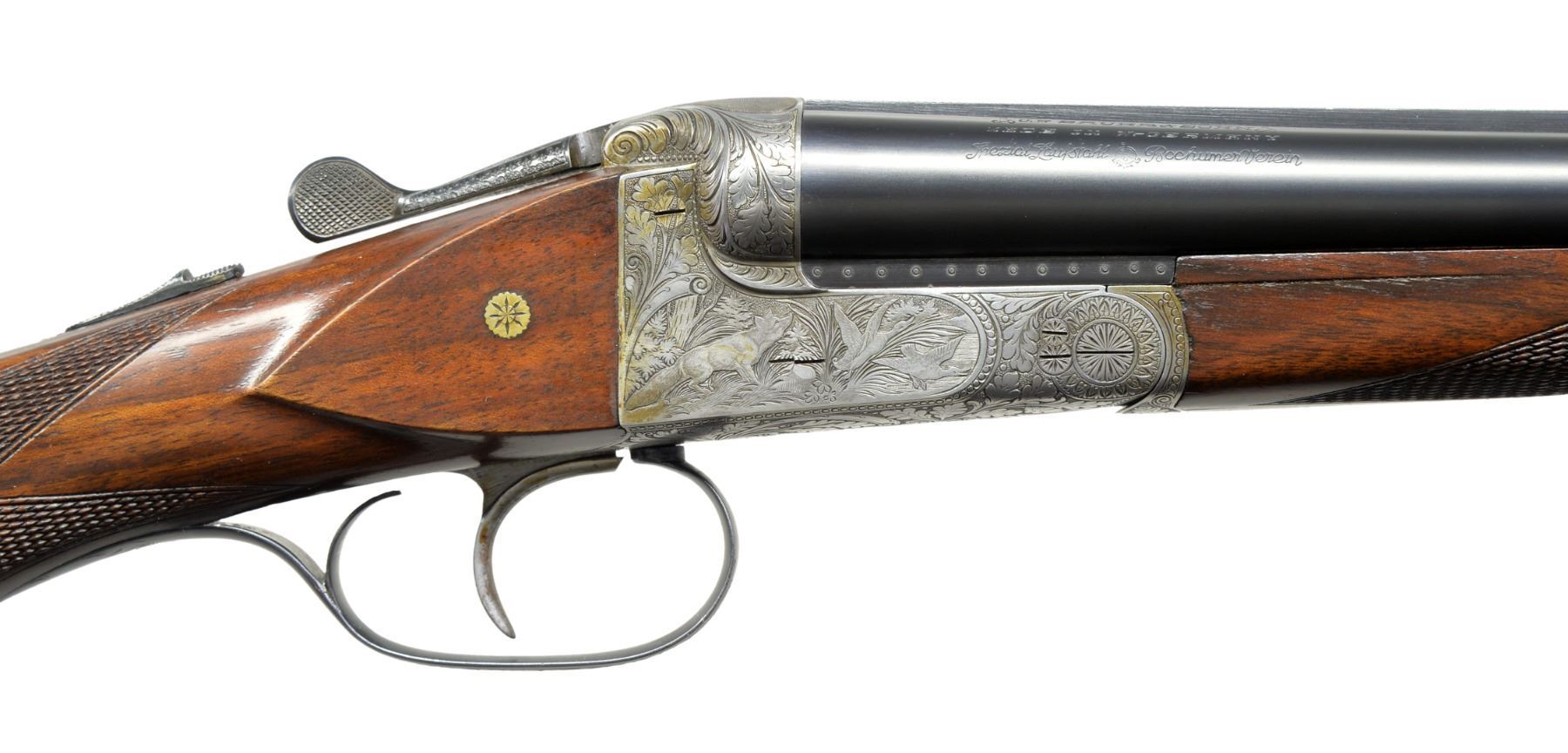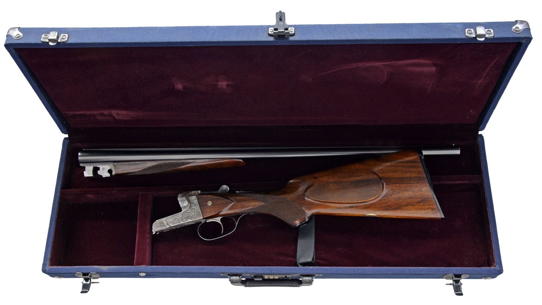 TRIGGER SHOTGUN WITH SPECIAL ORDER ENGRAVING. Cal. 20 Ga. S# 295002. This fine gun was proofed in 1959 & appears to be a Model 60 Deluxe. 26" Shoe lump bbls. have slightly raised matted rib. Sauer markings are on tops. Bbl. flats have nitro proofs for 2 3/4" chambers. Coin finished straight backed action w/out side clips or Greener crossbolt, features automatic safety & non selective single trigger. Action is engraved in motif illustrated as "Style 02" in the 1958 SHOOTERS BIBLE at an extra cost of $174.00. This well cut engraving consists of near full coverage scrolling oak leaves in shaded background surrounding nicely detailed game scenes on sides; a pointer pointing a trio of grouse on left & a fox contemplating a pair of rising ducks on right. Sauer logo is on trigger plate. Blued trigger guard has more oak leaves on bow. Lightly marbled European walnut capped pistol grip buttstock measures 14 1/4" over Sauer hard rubber buttplate. Stock features right hand cheekpiece, point pattern checkering & a vacant gold oval. Matching splinter ejector forend has Deeley release. Bore diameters: left - .617, choke .006 (IC), right - .618, choke .003 (IC). Wall thickness: left - .040, right - .040. DAC: 1 11/16". DAH: 2 9/16". Neutral cast. LOP: 14 1/4". WEIGHT: 6 lbs.1 oz. UNATTACHED ACCESSORIES: blue canvas covered case lined in dark burgundy velvet, has combination lock & is in good condition. CONDITION: bbls. retain nearly all of their original blue. Action has nearly all its coin finish, darkened a bit on bottom. Top lever & trigger guard lightly silvered. Stocks have nearly all of their original finish w/ some light handling marks. Bores are bright & shiny. Action is tight. Ejectors are slightly out of time. Trigger appears to work well. There is some chipping of wood at interface of action & left cheek of buttstock. A transverse reinforcing pin appears to be factory. (19-5440/MGM38). CURIO. $1,500-2,500.