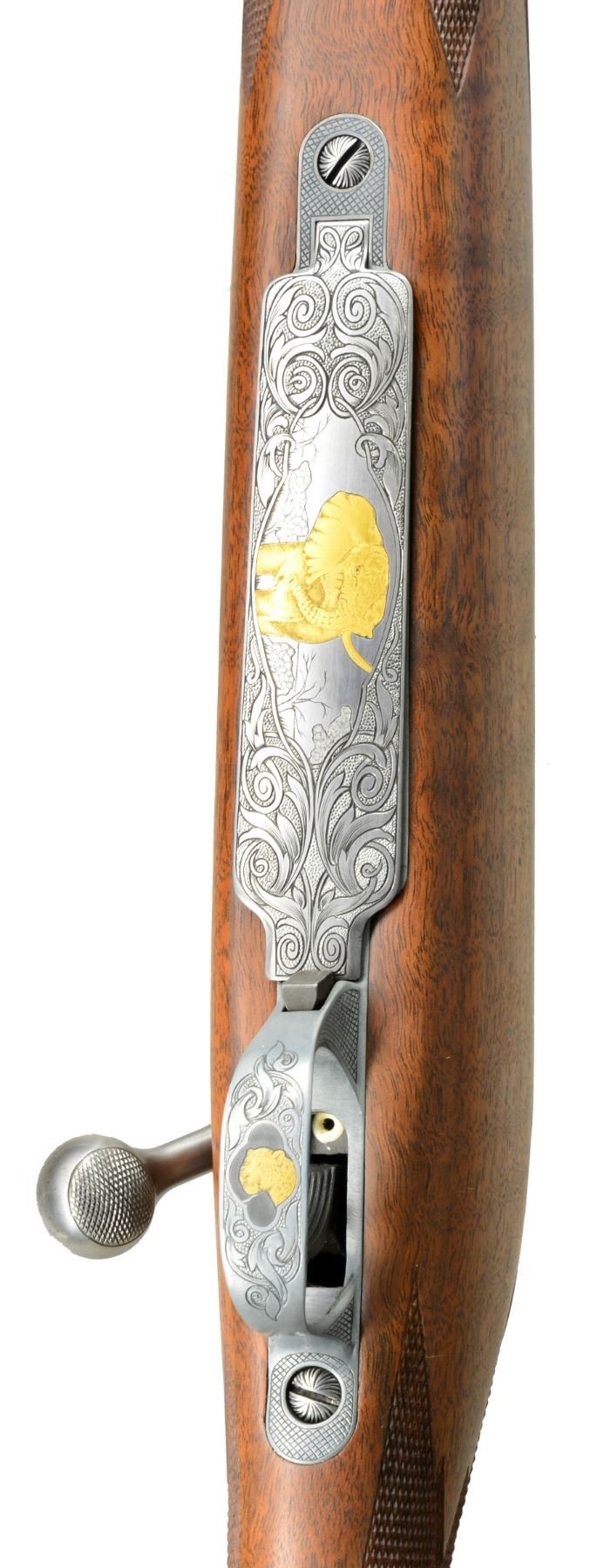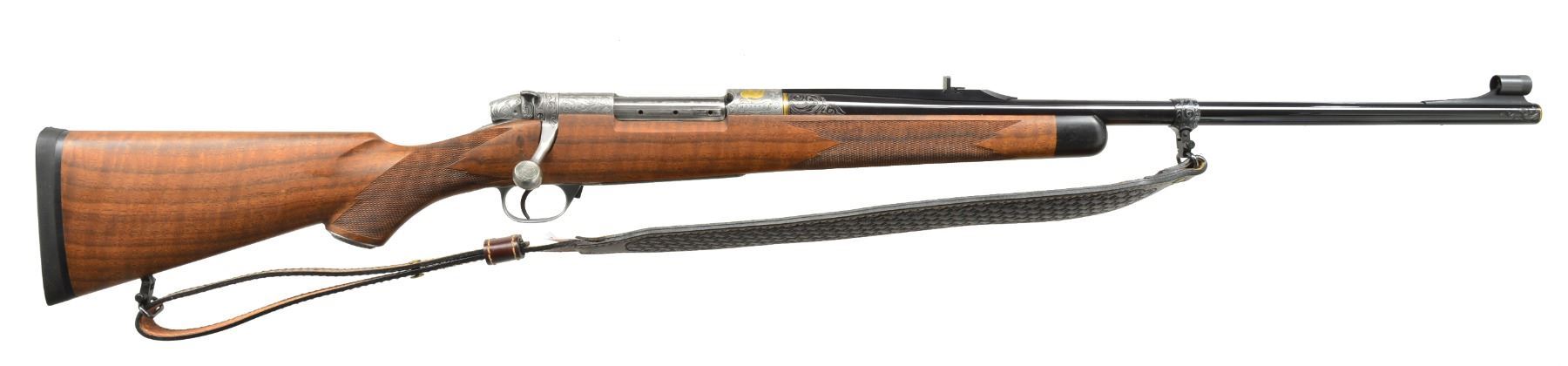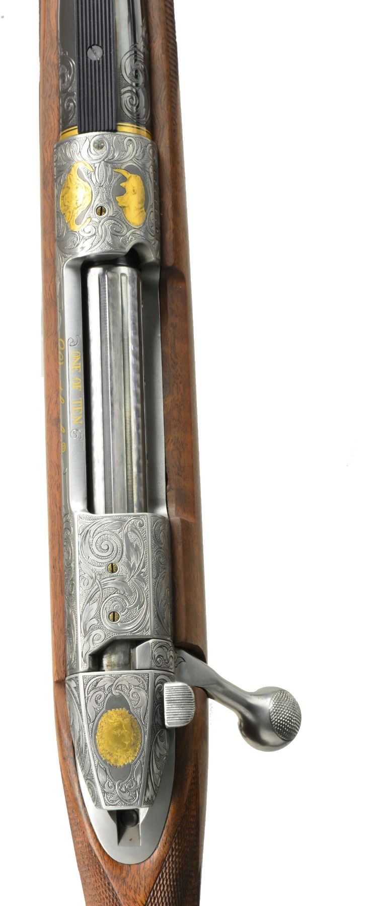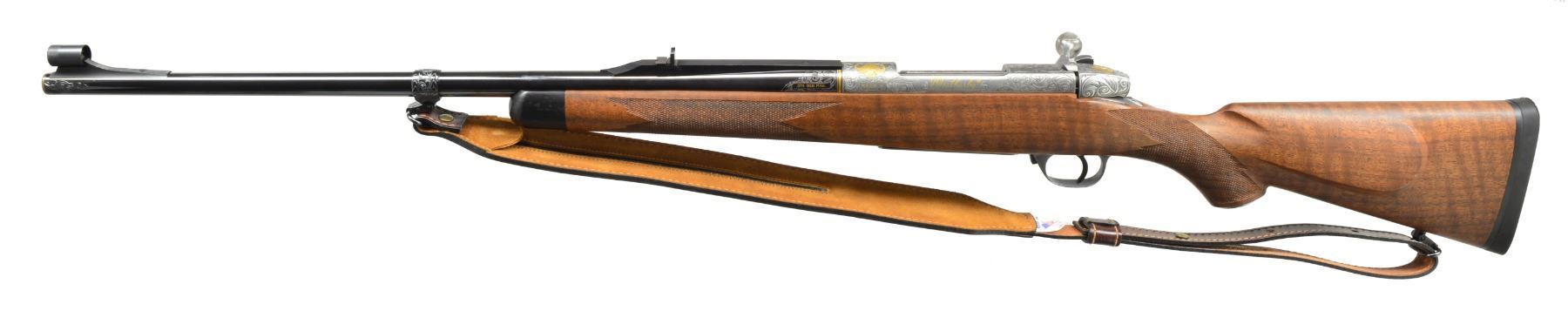 RIFLE. Cal. 375 H&H Mag. S# H238591. Bbl. 24". Spectacular high grade limited edition rifle by The American Historical Foundation of Richmond, Virginia. Action has satin silver finish w/ full coverage scroll engraving featuring gold plated game heads of buffalo, rhino & lion. Engraved floorplate has game scene engraving featuring gold plated elephant w/ leopard head on trigger guard. Left action flat marked "ONE OF TEN" in gold. Bbl. has high polished blue finish w/ gold bands & wedges of scroll engraving at breech & muzzle ends. Hooded ramp front sight w/ quarter rib express rear sight. Classic style cheekpiece stock of satin finished fancy walnut. Stock features ebony forearm tip, engraved steel grip cap, multi point checkering & solid black Weatherby pad. Tooled leather sling on QD swivels, front swivel is mounted on engraved bbl. band. UNATTACHED ACCESSORIES: glass fronted walnut presentation box w/ leatherette presentation label. Case contains key & delivery ticket dated 5/24/95. CONDITION: rifle is in near new condition showing little visible wear. (20-315/DS). MODERN. $2,500-4,500.
