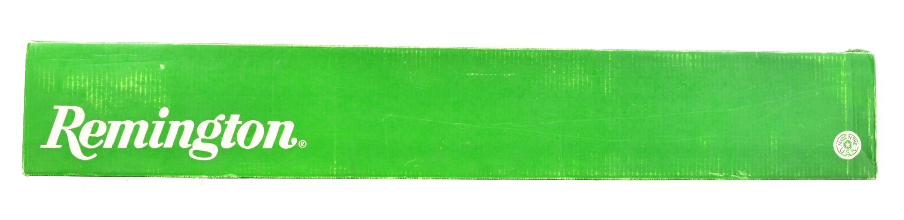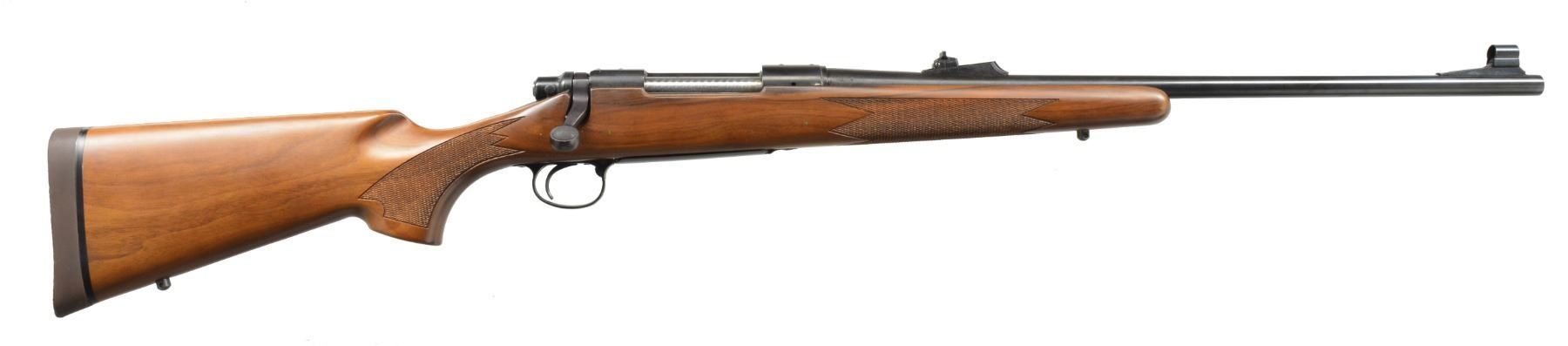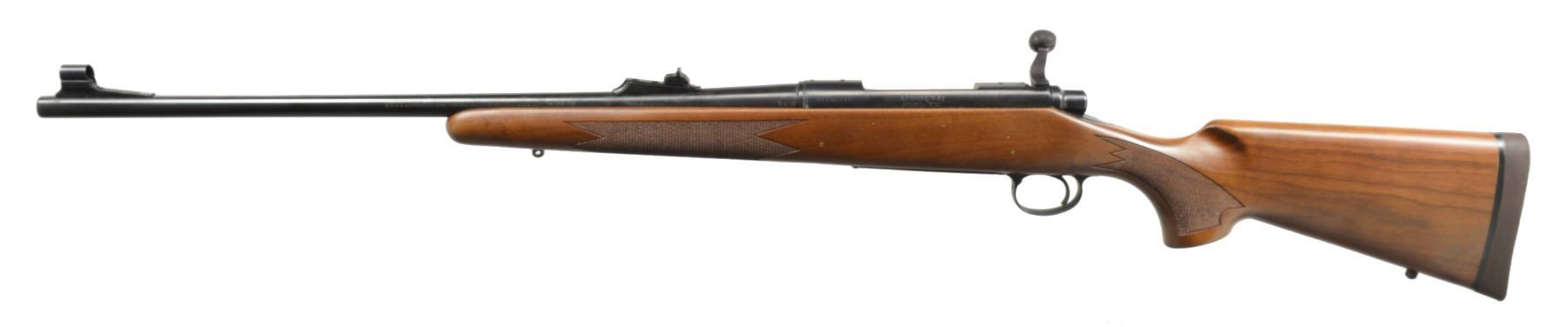 Cal. 35 Whelen. S# C6282712. Bbl. 22" w/ hooded bead front sight & U notch adj. rear sight. Action is drilled for scope attachment & has jeweled bolt body in hinged floorplate. Classic style walnut sporter stock, cut checkering & solid black Rem. pad. UNATTACHED ACCESSORIES: original box containing instruction booklet & hang tag. CONDITION: near excellent in box. Near excellent bore. (20-1285/DS). MODERN. $600-800.