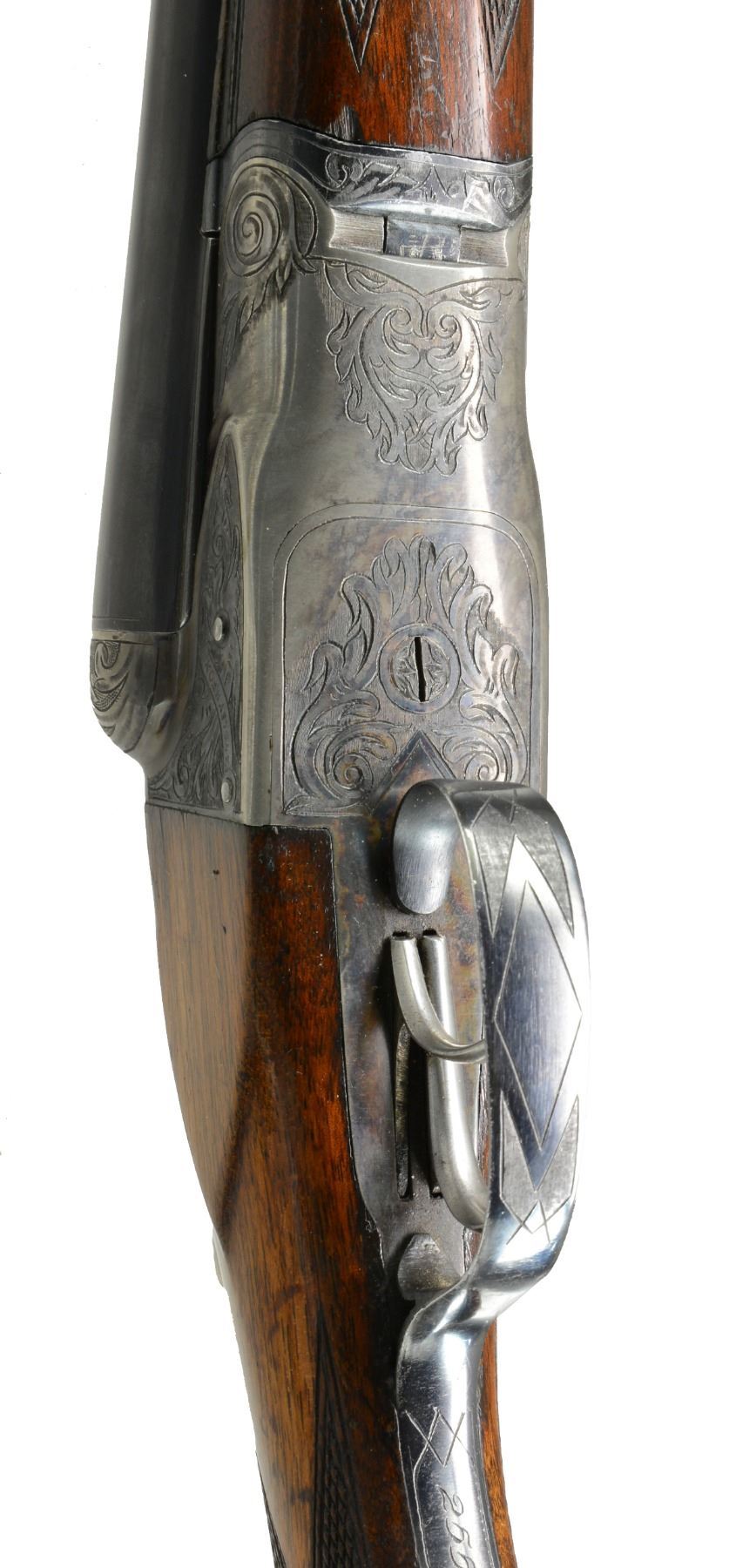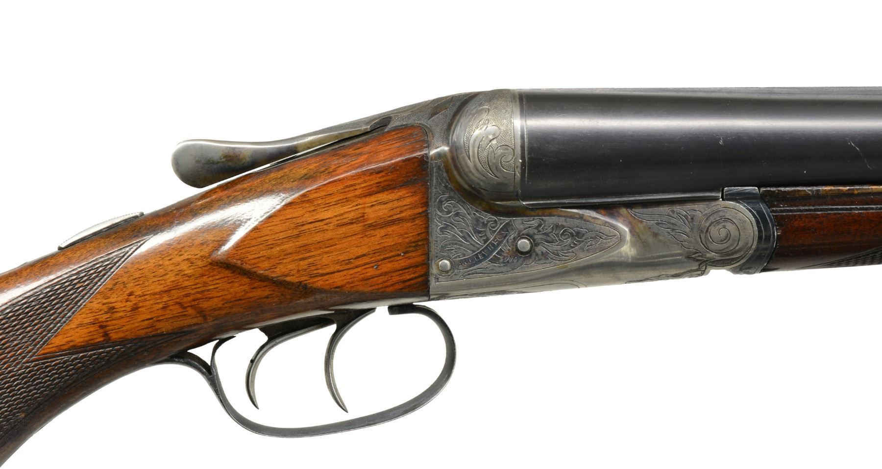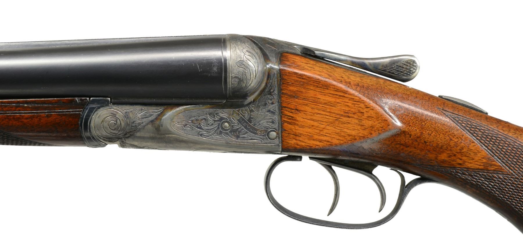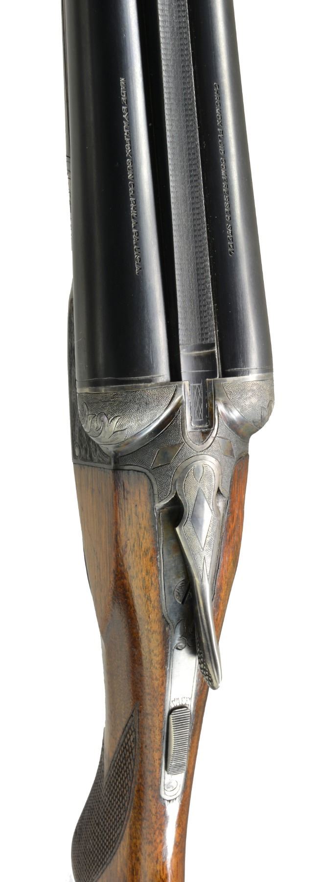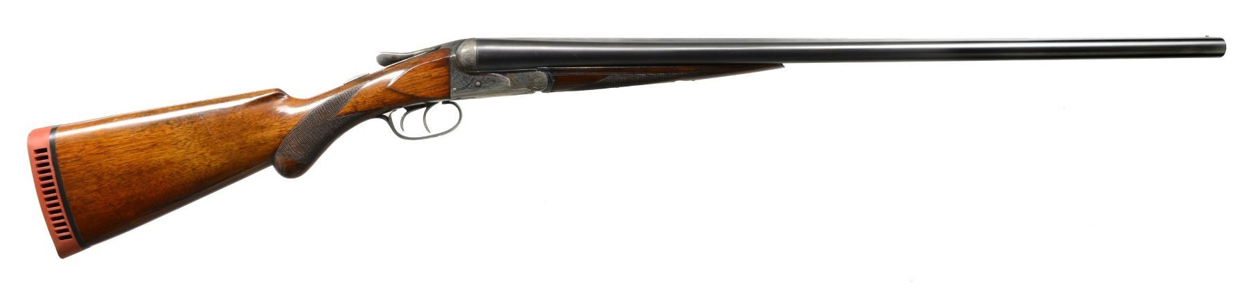 Cal. 12 Ga., 2 3/4". S# 25547. (1919). Bbls. 28" No. 3 weight w/ matted game rib, marked for Chromox steel & Fox Philadelphia address on tops. Bbl. flats are stamped w/ S#. grade letter & Fox proof. Case hardened action w/ rotary bolt has all correct markings on water table & features non automatic safety & dbl. triggers. Action is engraved in usual "A" grade shaded acanthus at about 70% coverage. "ANSLEY H. FOX" is in riband on each side. Blued steel trigger guard has S# at grip. Plain American walnut rnd. knob pistol grip stock measures 14" over old ventilated red Hawkins pad. Matching splinter ejector forend has Deeley type release. Bore diameters: left -.727, right -.727. Restrictions: left - .014 (MOD), right - .009 (IC). Minimum wall thickness: left - .032, right - .033. DAH: 3 3/16". DAC: 1 3/4". WEIGHT: 7 lbs. 0 oz. CONDITION: extremely fine. Bbls. retain over 95% original blue w/ only a hint of high edge wear & one or two scattered light scratches. Action retains over 90% original case hardening color, thinning around bottom, silvered on fences & beads. Thumbpiece is somewhat silvered as is top tang around safety. Over 90% blue remains on forend iron & latch. Trigger guard also has over 90% of its blue. Stocks retain approx. 80% original varnish w/ a bit of rubbed in oil, worn through on sharp edges w/ numerous marks. Checkering is lightly worn w/ some missing diamonds in forend. Pad is very fine, nicely fitted many years ago. Bores are very fine w/ minor ring 11" from breech end of right bbl. Action is tight. Ejectors are strong & in time. A fine Fox from before the "Roaring '20's". (20-694/MGM61). CURIO. $1,750-2,500.
