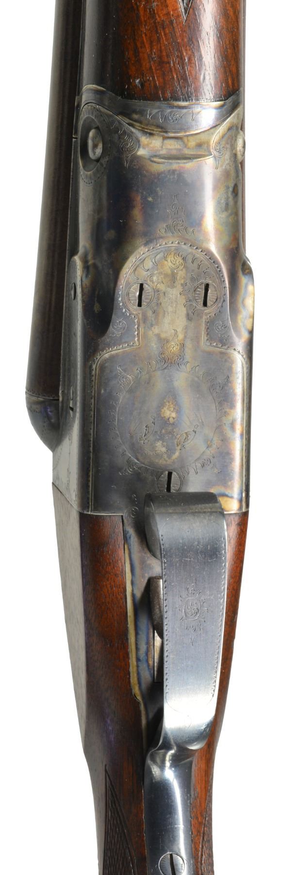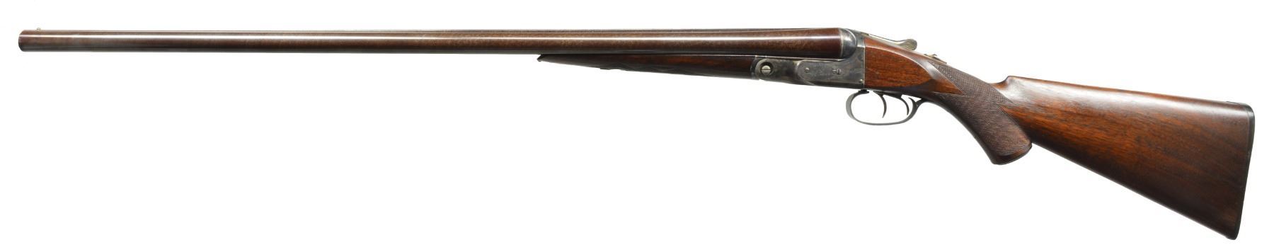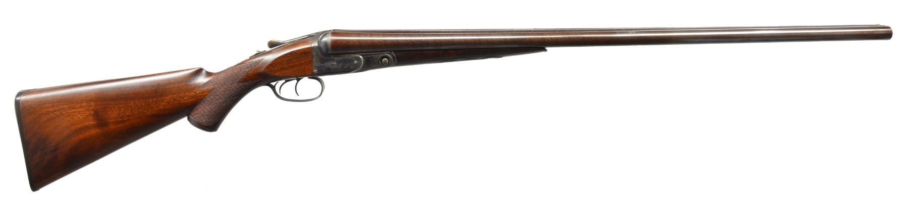 Cal. 12 Ga., 2 5/8". S# 81487. Bbls. 30" of Damascus Steel. Fixed Mod. & Full chokes. Lengthened forcing cones. No. 2 frame boxlock action w/ case colored finish. "G" Grade engraving features vignettes of fowl on sides of action & floorplate surrounded by scroll highlights & fancy borders. Dbl. triggers. Extractors. Steel tipped splinter forearm & hard rubber capped pistol grip stock w/ hand checkering. LOP: 14 1/4" over dog's head buttplate. DAC: 1 7/8". DAH: 3 1/8". Stock has a slight cast off. Weight: 7 lbs., 15 oz. Mfg. 1895. CONDITION: beautifully restored shotgun. Bbls. retain 98% finely rebrowned finish. Action retains 98% restored case colors & trigger guard blue. Stocks have very good refinish showing a few scattered marks. Checkering is nicely recut. Bores are polished bright. (01-17423/DS). ANTIQUE. $1,500-2,000.