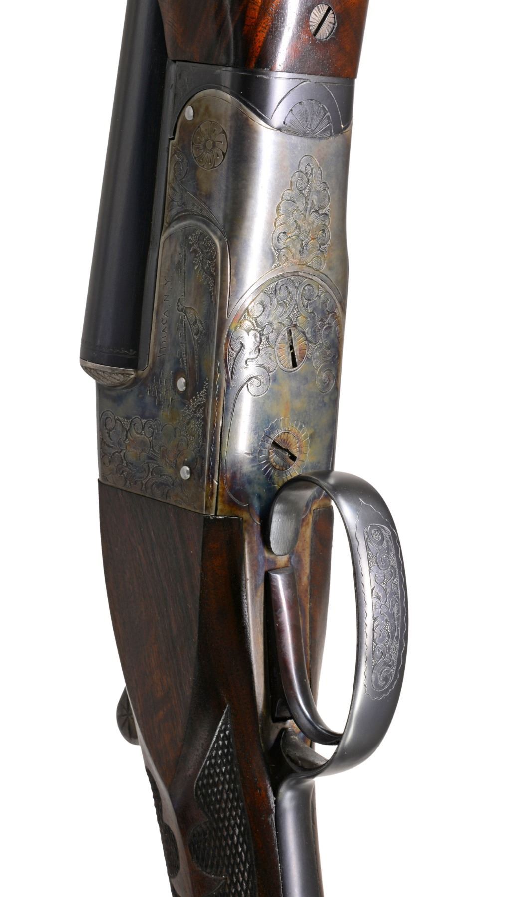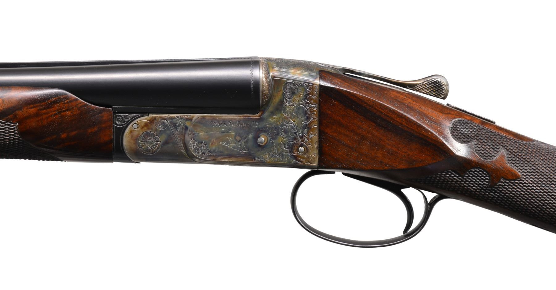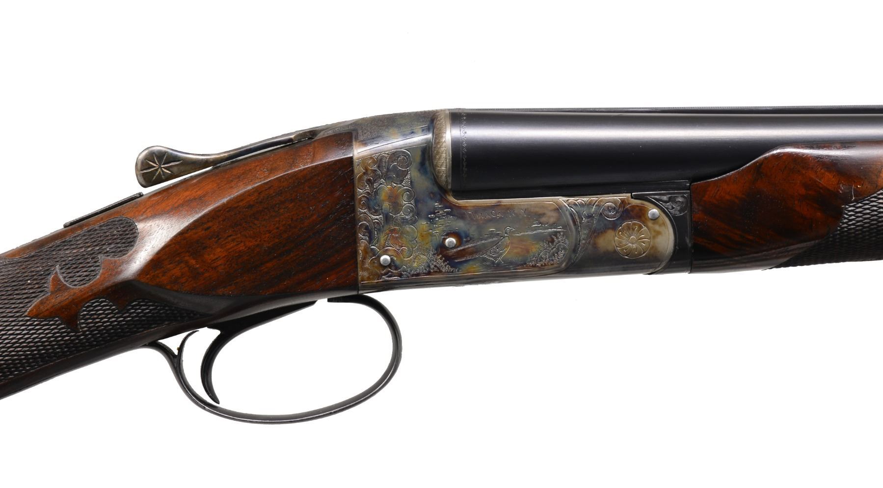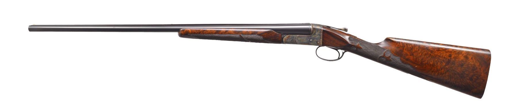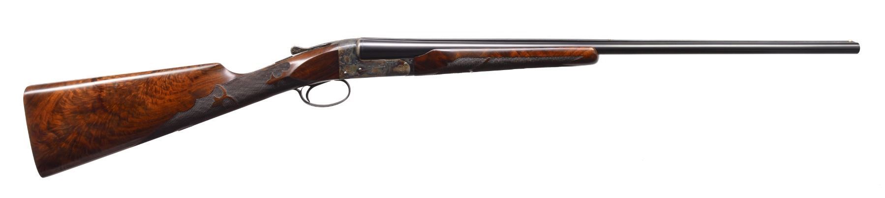 Cal. 28 Ga., 2 7/8". S# 467621. Bbls. 26" w/ fixed Mod. & Full chokes. Ivory front & mid beads. Case colored NID boxlock action w/ rotary bolt & cam cocking. Grade 4 engraving marked "Ithaca Gun Co" over a flying mallard scene on left, right side is marked "Ithaca N.Y." over a rooster pheasant game scene. Scenes are surrounded by floral scroll engraving that continues to top lever, floorplate & trigger guard. Top of receiver has stippled surface. Aftermarket Miller single non selective trigger. Selective automatic ejectors. Beavertail forearm & straight hand stock of exhibition quality black walnut w/ segmented borderless fleur-de-lis hand checkering. Forearm has ebony tip insert. LOP: 14" to checkered butt. DAC: 1 3/8". DAH: 2 9/16". Stock has a near neutral cast. WEIGHT: 6 lbs., 7.5 oz. This gun is only 2,378 numbers below the last Ithaca double mfg. 1948, S# 469999. CONDITION: bbl. retains over 98% rust blued refinish w/ remaining scratches at breech area of right bbl. Action has over 90% restored case colors showing light edge wear & fading in carry areas. Wood has lightly worn finish showing sm. handling marks. Butt area of stock has a large open grain check visible on both sides. Rear forearm latch screw does not fit entirely flush. Trigger guard screws show some distortion. Bores are bright. Left bbl. shows evidence of sm. removed dents & faint ring bulge near choke area. (20-544/DS). CURIO. $5,000-7,000.