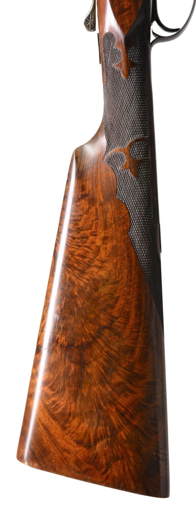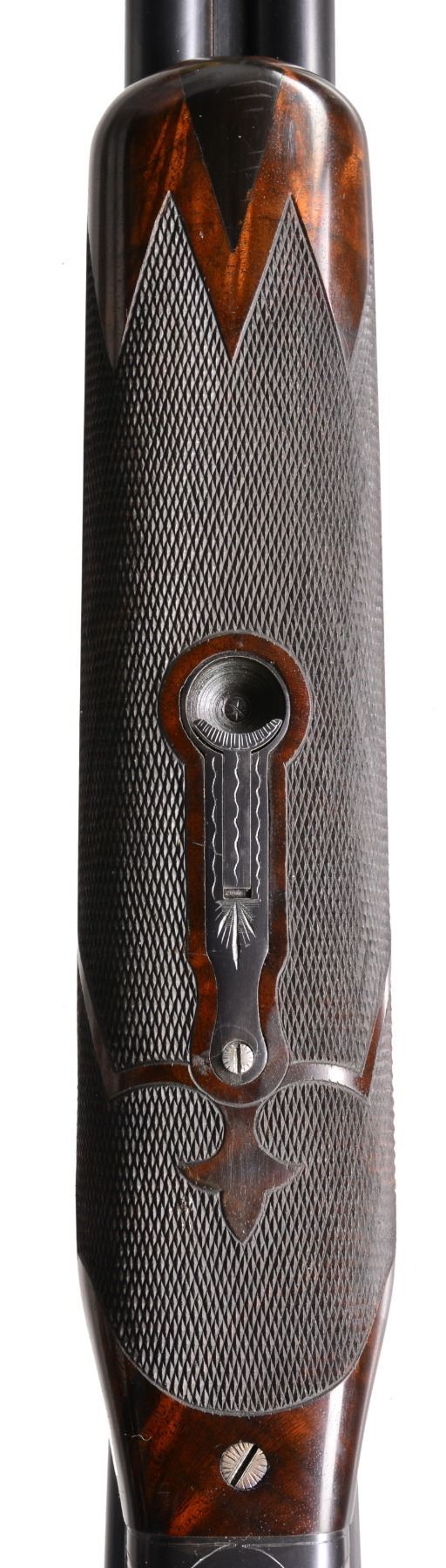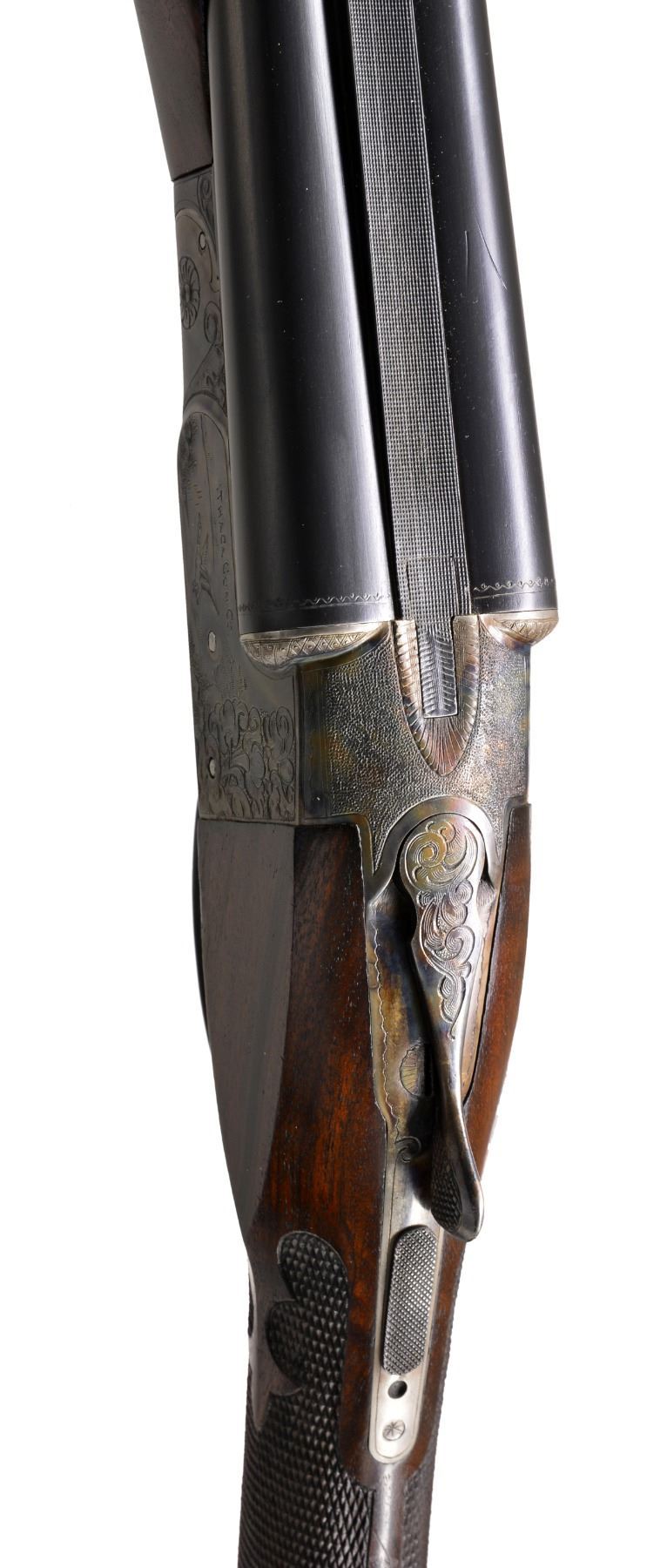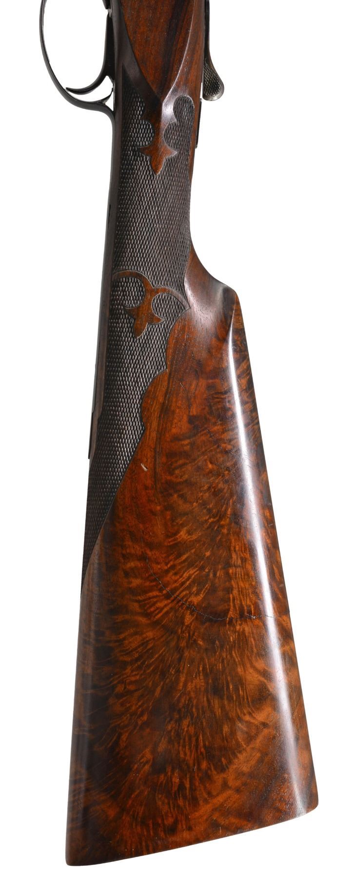 Cal. 28 Ga., 2 7/8". S# 467621. Bbls. 26" w/ fixed Mod. & Full chokes. Ivory front & mid beads. Case colored NID boxlock action w/ rotary bolt & cam cocking. Grade 4 engraving marked "Ithaca Gun Co" over a flying mallard scene on left, right side is marked "Ithaca N.Y." over a rooster pheasant game scene. Scenes are surrounded by floral scroll engraving that continues to top lever, floorplate & trigger guard. Top of receiver has stippled surface. Aftermarket Miller single non selective trigger. Selective automatic ejectors. Beavertail forearm & straight hand stock of exhibition quality black walnut w/ segmented borderless fleur-de-lis hand checkering. Forearm has ebony tip insert. LOP: 14" to checkered butt. DAC: 1 3/8". DAH: 2 9/16". Stock has a near neutral cast. WEIGHT: 6 lbs., 7.5 oz. This gun is only 2,378 numbers below the last Ithaca double mfg. 1948, S# 469999. CONDITION: bbl. retains over 98% rust blued refinish w/ remaining scratches at breech area of right bbl. Action has over 90% restored case colors showing light edge wear & fading in carry areas. Wood has lightly worn finish showing sm. handling marks. Butt area of stock has a large open grain check visible on both sides. Rear forearm latch screw does not fit entirely flush. Trigger guard screws show some distortion. Bores are bright. Left bbl. shows evidence of sm. removed dents & faint ring bulge near choke area. (20-544/DS). CURIO. $5,000-7,000.