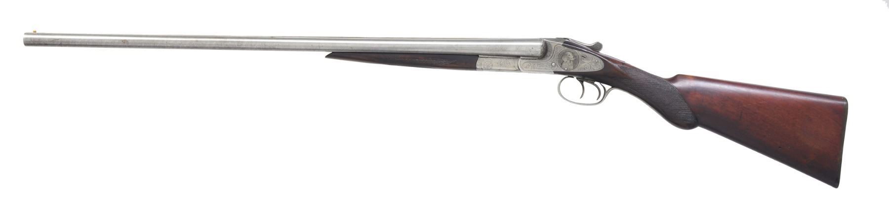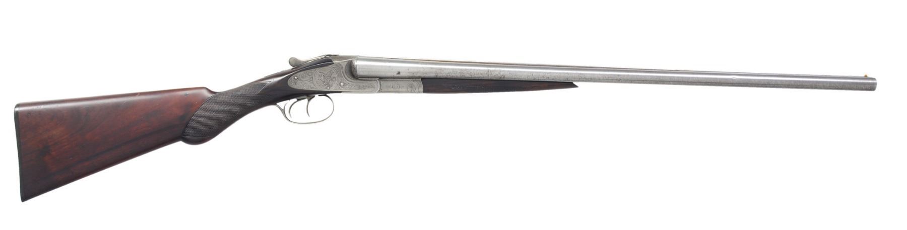 SXS SHOTGUN. Cal. 16 Ga., 2 9/16". S# 60885. Bbls. 26" of Damascus steel. Fixed Mod. & Full chokes. Ivory front bead. Case colored sidelock action has custom engraving. Vignette on left lock has hunting dog portrait. Right lock shows 2 flying mallards. Balance of locks along w/ frame, top lever, trigger guard & forearm iron have 75% coverage of arabesque scroll hand engraving w/ oak leaf highlights on bolsters & hand shaded top surfaces on action. Dbl. triggers. Extractors. 3 Position top tang sliding safety. Splinter forearm & rnd. knob walnut stock w/ hand checkering. LOP: 14" over original buttplate. WEIGHT: 6 lbs., 10.3 oz. Pre 1913 mfg. CONDITION: metal has faded to smooth gray w/ traces of original finish. Wood has dark worn appearance w/ scattered scratches & handling marks having lightly worn checkering. Top lever has replacement screw & is riding a little high in receiver. Bore shows scattered light pitting. Right bbl. has unraised dent 7 1/2" from muzzle. (19-5171/DS). CURIO. $700-1,200.