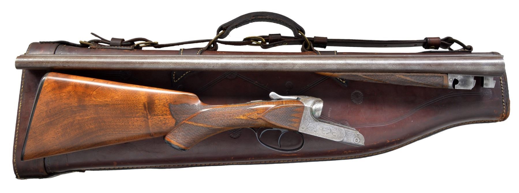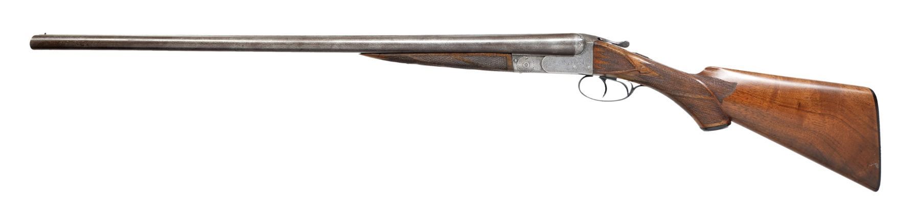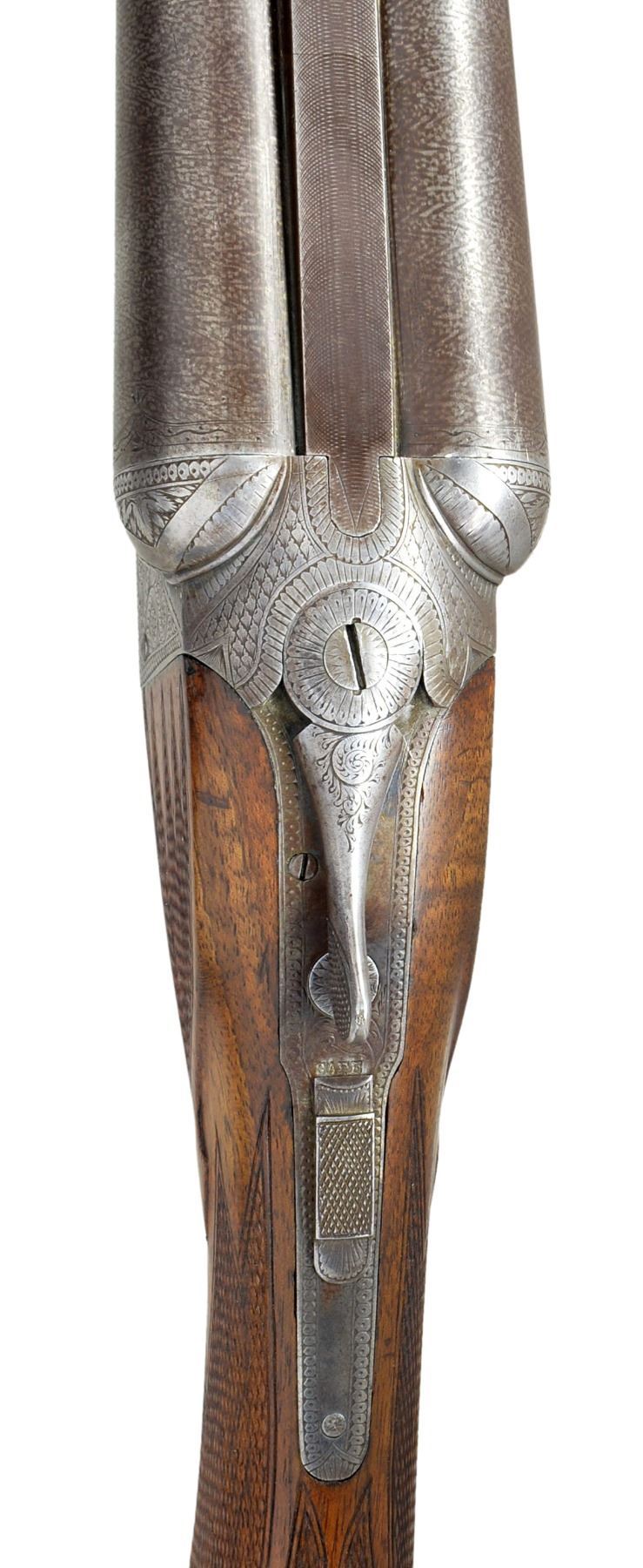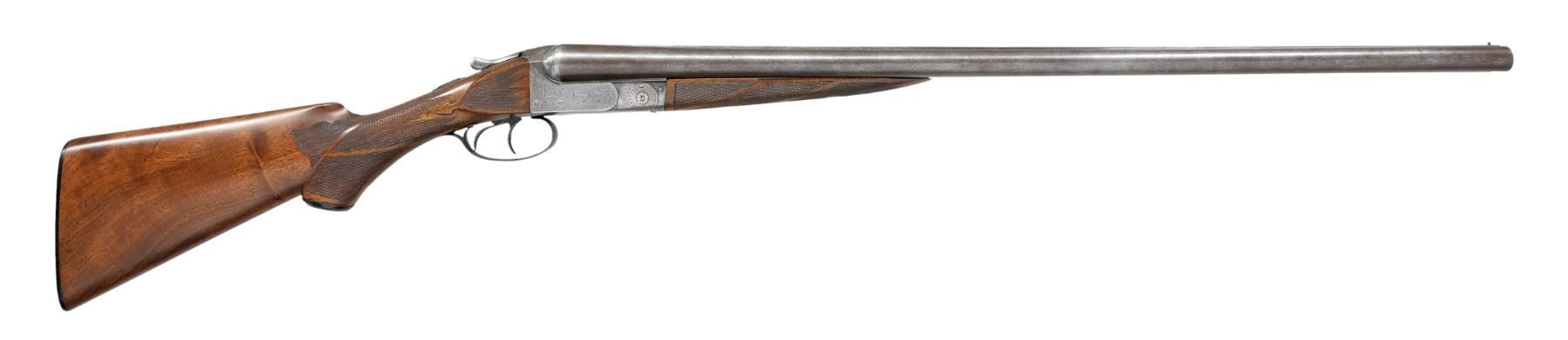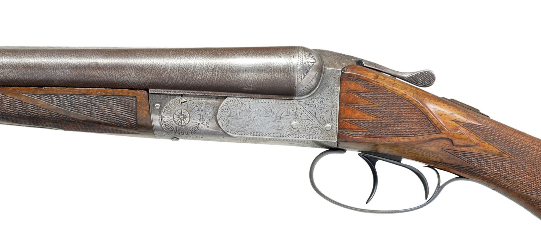 (HIGHEST CATALOGUED) DOUBLE SHOTGUN WITH BERNARD DAMASCUS BARRELS AND LEG OF MUTTON CASE. Cal.12 Ga. S# 1436. The Wilkes Barre Gun Company operated for only 3 years, closing its doors around 1895. They sold 4 grades of shotguns ranging from "A" (lowest) to "D" (highest), this gun a "D" grade. retailed for $125.00. It has 28" Bernard Damascus bbls. w/ matted flat rib. There is some engraving at breech ends. S# is on flats. Casehardened boxlock action features automatic safety & pivoting third fastener, in addition to standard Purdey bolts. Action is engraved w/ near full coverage varying sized but fairly lg. scroll w/in geometric borders. Scroll surrounds game scenes depicting a pair of snipe taking wing in marsh on left side & a pair of mallards on right. Trigger plate has makers name in circle surrounding scene of a pair of hunting dogs in rolling meadow. Fences more deeply engraved in acanthus motif & top of action has surface dulled by geometric engraving. Blued trigger guard w/ scroll on bow has S# on tang. Somewhat figured American walnut capped pistol grip buttstock measures 14 3/16" over checkered hard rubber buttplate w/ oval circular vignette of spaniel retrieving snipe. Side panels are checkered in point pattern & have arrowhead drop points. Elaborate point pattern checkering at grip is separated at top & bottom by horizontal central ribbon & other ribbons separate flourishes toward comb. Matching splinter forend has Deeley type release & grade (D) is stamped into wood in front of iron, its normal location. Bore diameters: left - .729, choke .000 (cyl), right - .732, choke .003 (IC). Wall thickness: left - .028, right - .030. DAC: 1 3/4"+. DAH: 3". Neutral cast. LOP: 14 3/16". WEIGHT: 7 lbs. 3 oz. UNATTACHED ACCESSORIES: "A & F" marked brown leather LOM case is in fine condition w/ straps & handle restitched. CONDITION: very good, as partially refinished. Bbls. retain most of their original dramatic Bernard pattern w/ areas somewhat browned. Action retains traces of original casehardening color, mostly where protected by top lever & trigger guard. Balance is a pewter gray. Trigger guard newly temper blued. Stocks refinished & retain nearly all of that finish. Checkering competently recut. Bores are good, mostly shiny but considerably frosted, verging on light pitting. Bbls. most likely cut many, many years ago, as muzzles are considerably brown & w/ some denting on edges. Examples of guns by this company are very rarely encountered. Their total production was probably fewer than 500 guns. "D" grade production was probably far fewer than 20 units. (01-17164/MGM17). ANTIQUE. $1,500-2,500.