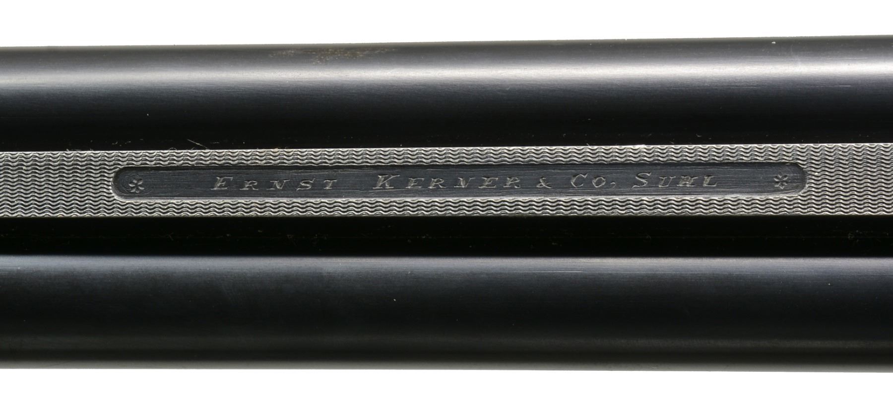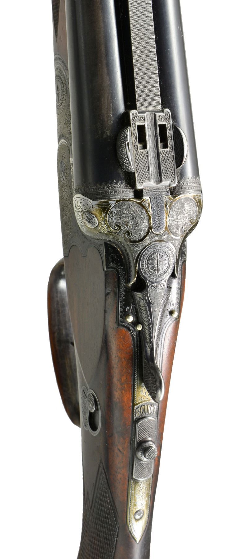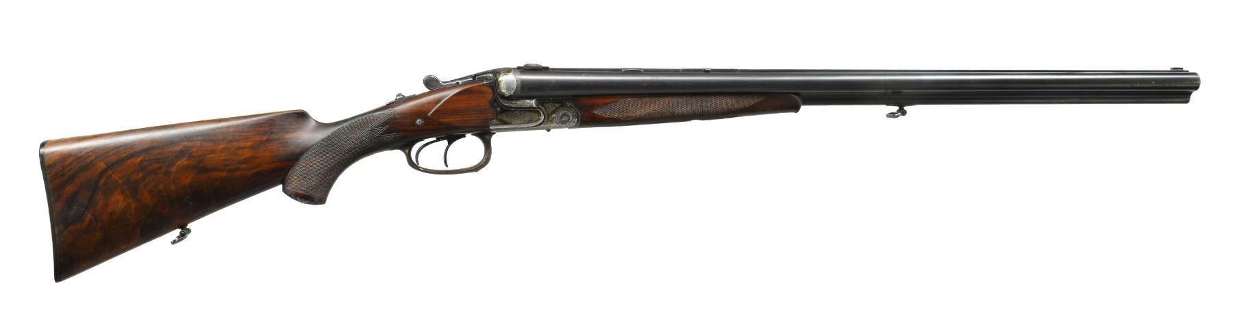 Cal. 16 Ga., 2 1/2" x 16 Ga., 2 1/2" x 8x57JR (318 groove dia). S# 17844. (1935). Bbls. 25 5/8" fitted w/ full length matted rib holding pop up blue enameled rifle sight & claw scope bases. Bbl. flats stamped w/ Suhl nitro proofs w/ date code "11/35". Black anodized Dural (aluminum) action features side safety, tang mounted rifle selector, pin type cocking indicators either side of top lever, bushed strikers, side clips, crossbolt third fastener & dbl. triggers (front set). Action engraved w/ 70% coverage varying sized scroll w/in scroll & geometric borders. Trigger guard is of horn. Well marbled European walnut sunburst horn capped pistol grip buttstock measures 13 3/4" over ribbed horn buttplate. Stock features shadow line right hand cheekpiece, carved side panels & point pattern checkering at grip. A sling loop on toeline matches that soldered to bottom bbl. Matching schnabeled splinter forend has Deeley release. Bore diameter: left - .674, restriction: .041 (extra full), right - .675, restriction: .029 (IMod). Minimum wall thickness: left - .024, right - .023. DAH: 2 9/16". DAC: 1 9/16". WEIGHT: 6 lbs. 4 oz. CONDITION: fine. Bbls. retain 85"90% original blue. Action has most of its black anodize, considerably faded, along w/ some scratches. Stock retains most of what appears to be its original finish w/ marks & scratches. Checkering at grip poorly recut & there is some evidence of repair. Forend checkering shows some rubs, dings & a bit of wear. Bores are fine to very fine w/ a few minor dings. Rifle bore is sharp & shiny. Action is tight. A good quality lightweight Drilling. (20-667/MGM53). CURIO. $1,500-2,500.