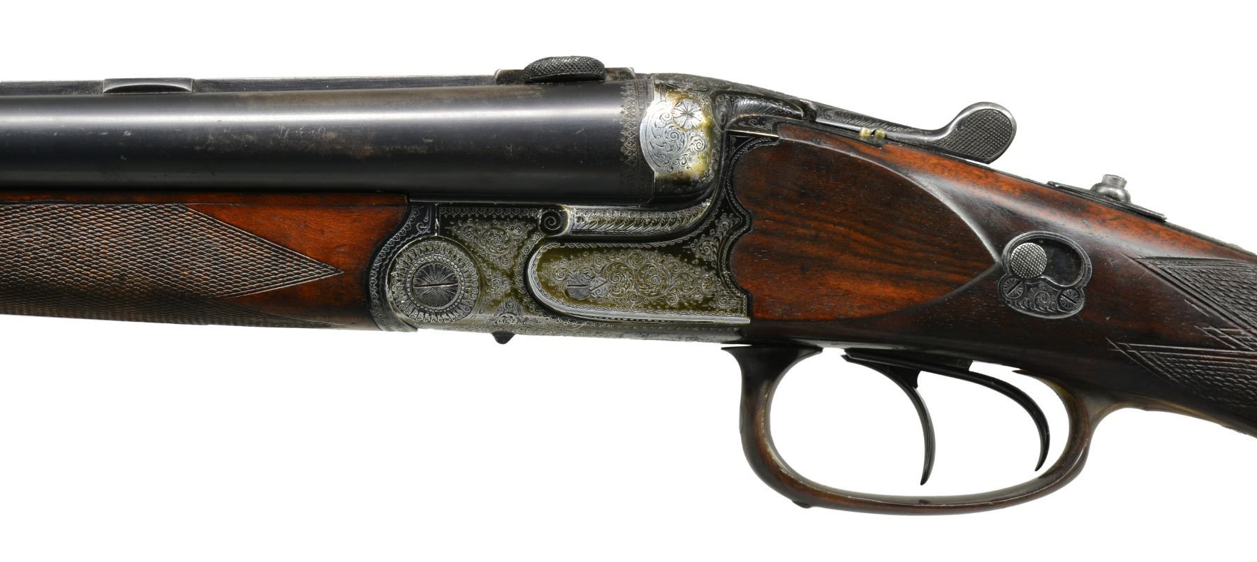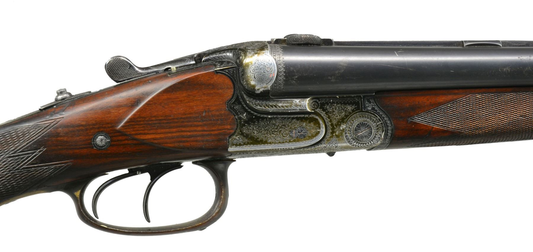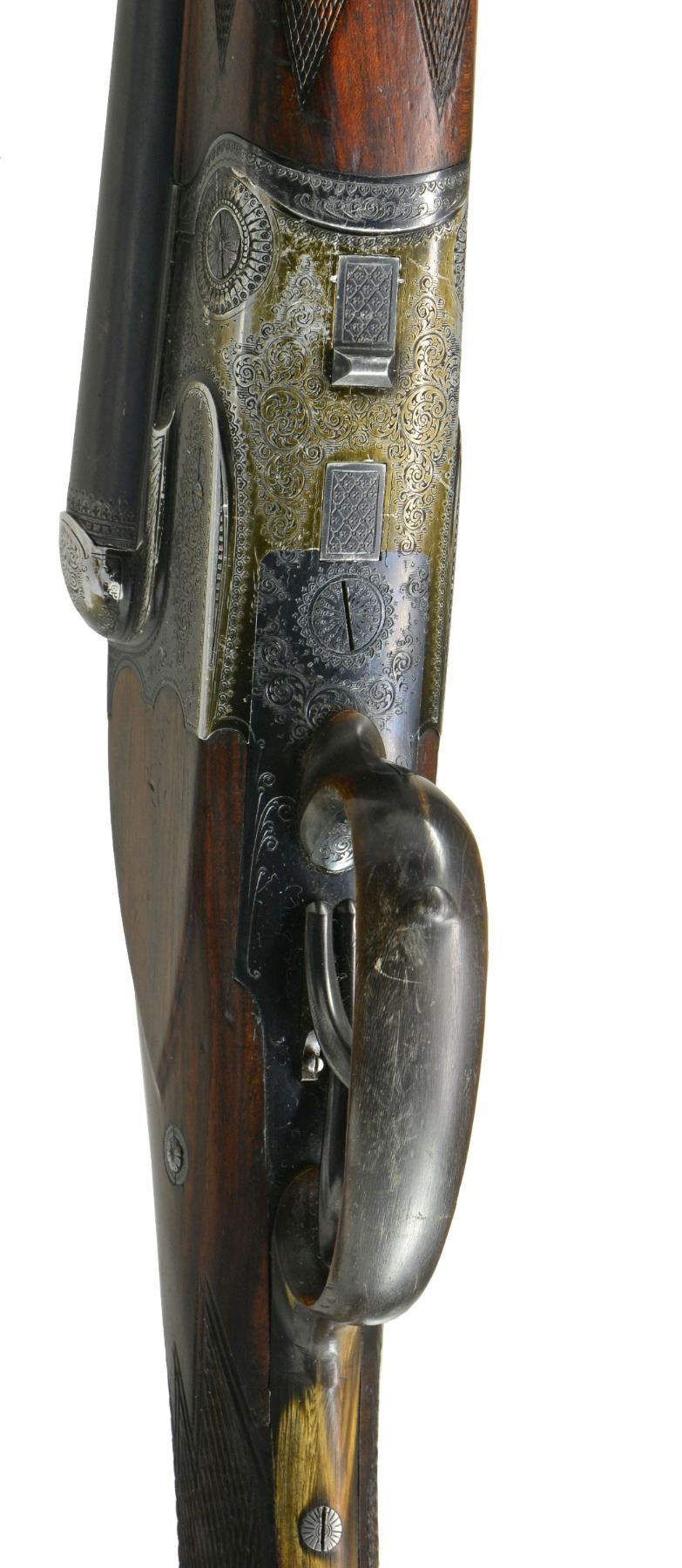 Cal. 16 Ga., 2 1/2" x 16 Ga., 2 1/2" x 8x57JR (318 groove dia). S# 17844. (1935). Bbls. 25 5/8" fitted w/ full length matted rib holding pop up blue enameled rifle sight & claw scope bases. Bbl. flats stamped w/ Suhl nitro proofs w/ date code "11/35". Black anodized Dural (aluminum) action features side safety, tang mounted rifle selector, pin type cocking indicators either side of top lever, bushed strikers, side clips, crossbolt third fastener & dbl. triggers (front set). Action engraved w/ 70% coverage varying sized scroll w/in scroll & geometric borders. Trigger guard is of horn. Well marbled European walnut sunburst horn capped pistol grip buttstock measures 13 3/4" over ribbed horn buttplate. Stock features shadow line right hand cheekpiece, carved side panels & point pattern checkering at grip. A sling loop on toeline matches that soldered to bottom bbl. Matching schnabeled splinter forend has Deeley release. Bore diameter: left - .674, restriction: .041 (extra full), right - .675, restriction: .029 (IMod). Minimum wall thickness: left - .024, right - .023. DAH: 2 9/16". DAC: 1 9/16". WEIGHT: 6 lbs. 4 oz. CONDITION: fine. Bbls. retain 85"90% original blue. Action has most of its black anodize, considerably faded, along w/ some scratches. Stock retains most of what appears to be its original finish w/ marks & scratches. Checkering at grip poorly recut & there is some evidence of repair. Forend checkering shows some rubs, dings & a bit of wear. Bores are fine to very fine w/ a few minor dings. Rifle bore is sharp & shiny. Action is tight. A good quality lightweight Drilling. (20-667/MGM53). CURIO. $1,500-2,500.