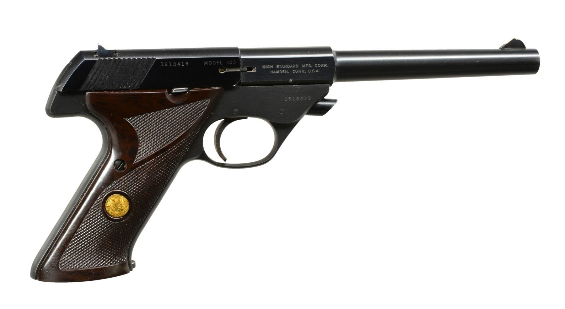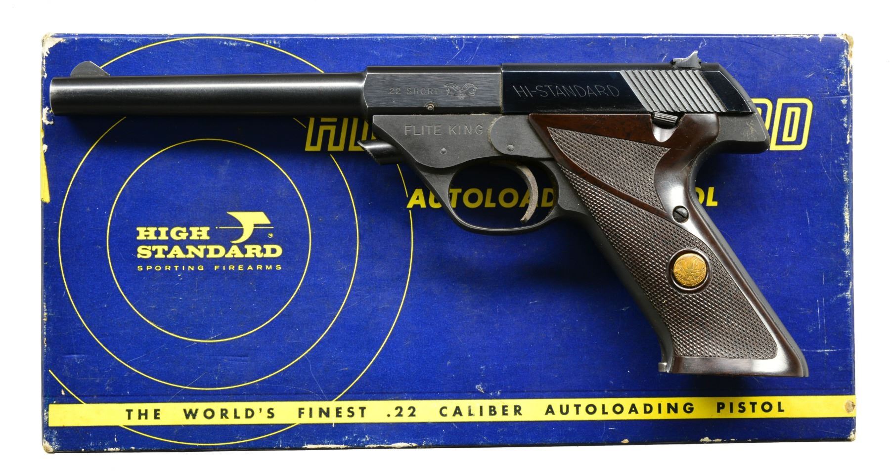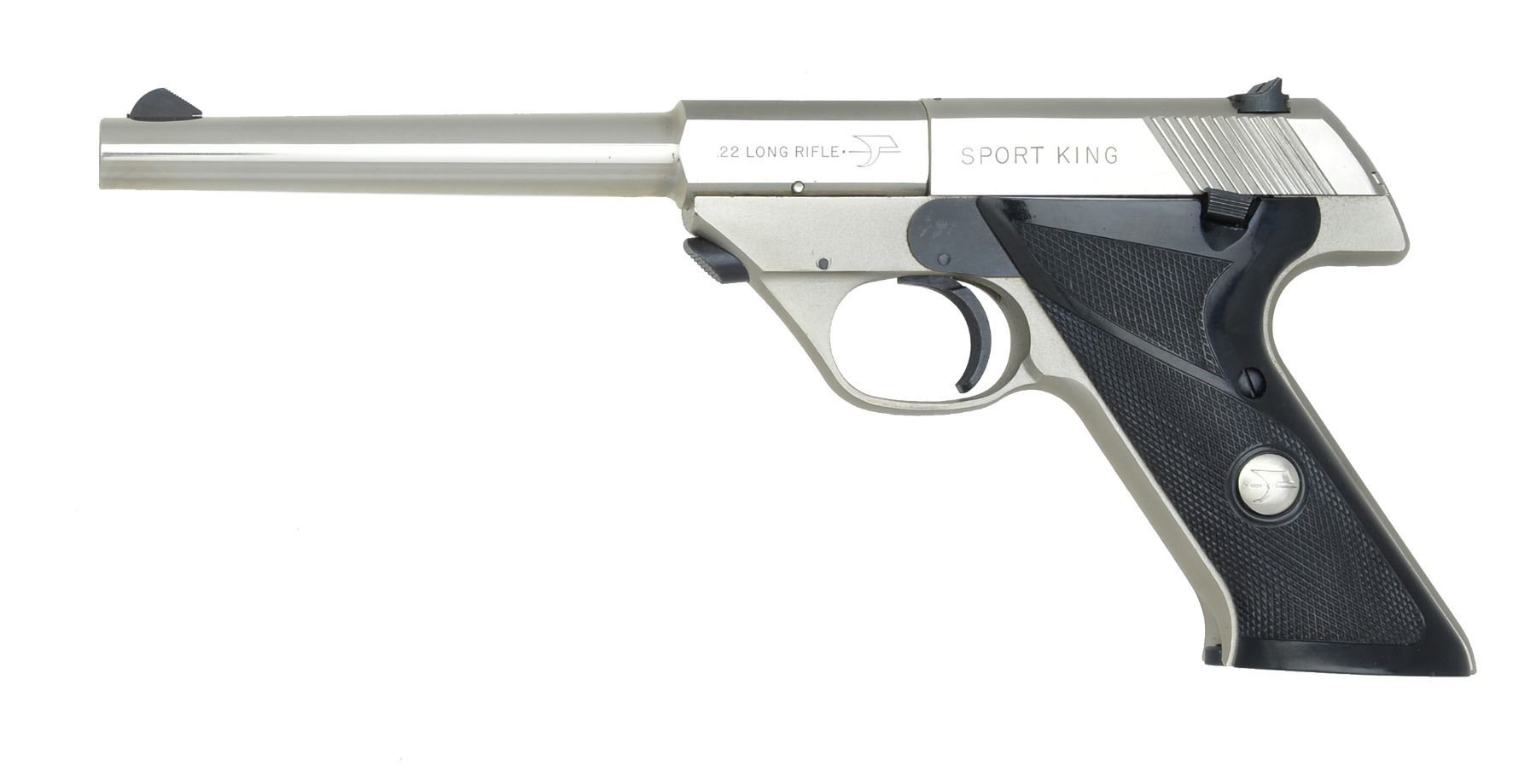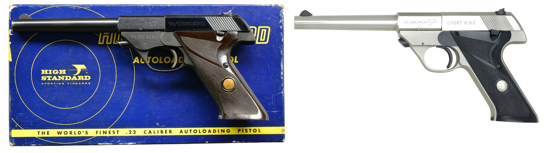 1) FLITE KING MODEL 103. Cal. 22 Short. S# 1513419. Bbl. 6 3/4". Serrated ramp front sight w/ square notch rear sight. Steel frame w/ alloy slide. Blue finish. 2 Piece checkered plastic grips w/ gold medallions. MAGS: 1 detachable 10 rd. UNATTACHED ACCESSORIES: 2 piece blue & gold box w/ non matching S#. Box contains instruction manual, warranty card, mag. & service information. CONDITION: 90% metal finish showing light edge wear & sm. scratches. Sights have shooter added white & red paint. Bore is bright w/ sound rifling. (20-36/DS). 2) SPORT KING MODEL 107. Cal. 22 LR. S# 2460447. Bbl. 6 3/4". Serrated ramp front sight w/ square notch rear sight. Slide & bbl. have bright nickel finish. Frame has satin nickel finish. 2 Piece black plastic checkering grips w/ silver medallions. MAGS: 1 detachable 10 rd. UNATTACHED ACCESSORIES: 2 piece black foam lined box w/ matching number on label. CONDITION: over 99% original finish. Bright near excellent bore retains strong rifling. (20-37/DS). BOTH MODERN. $900-1,200.