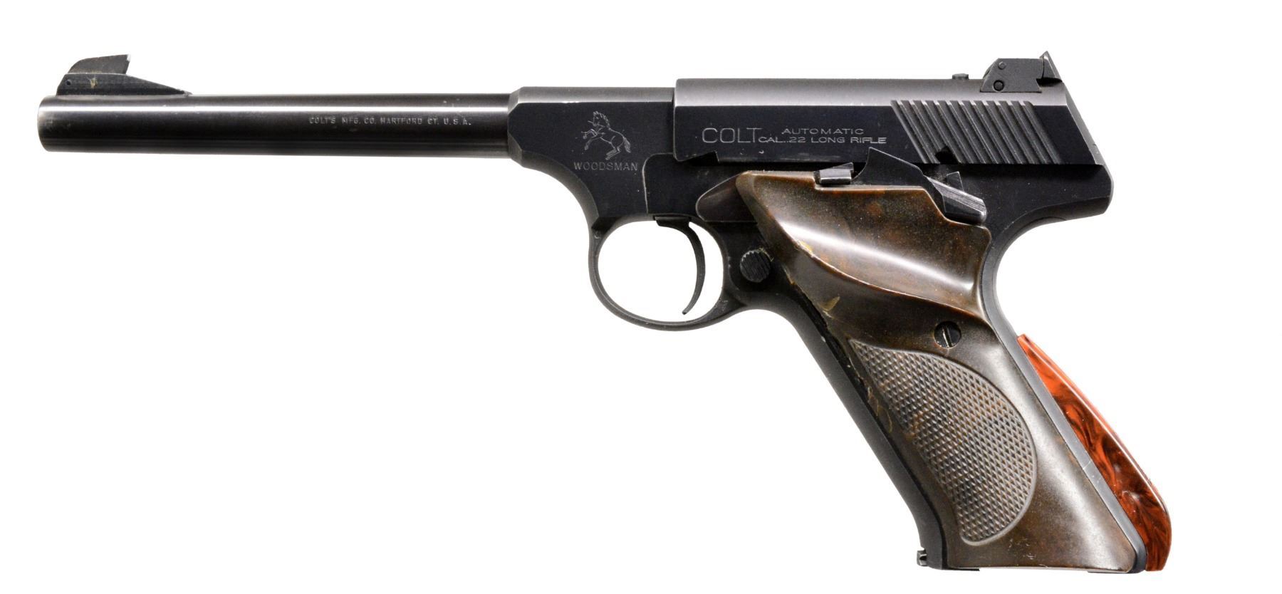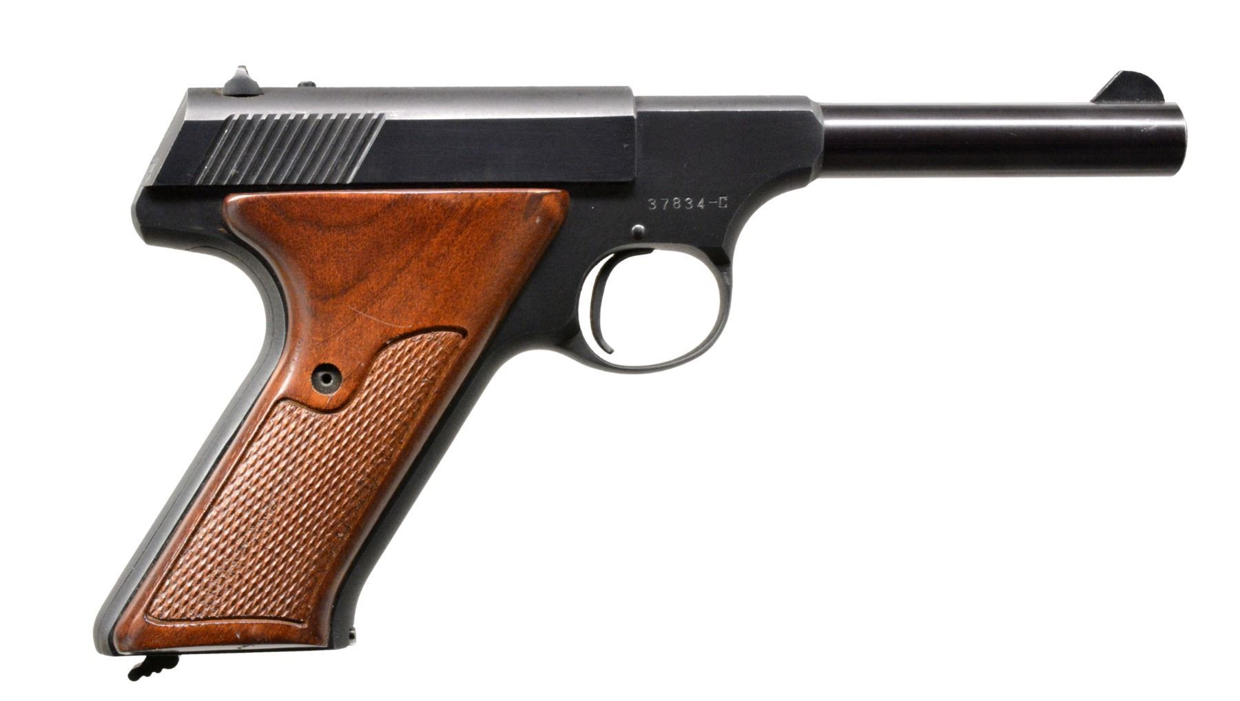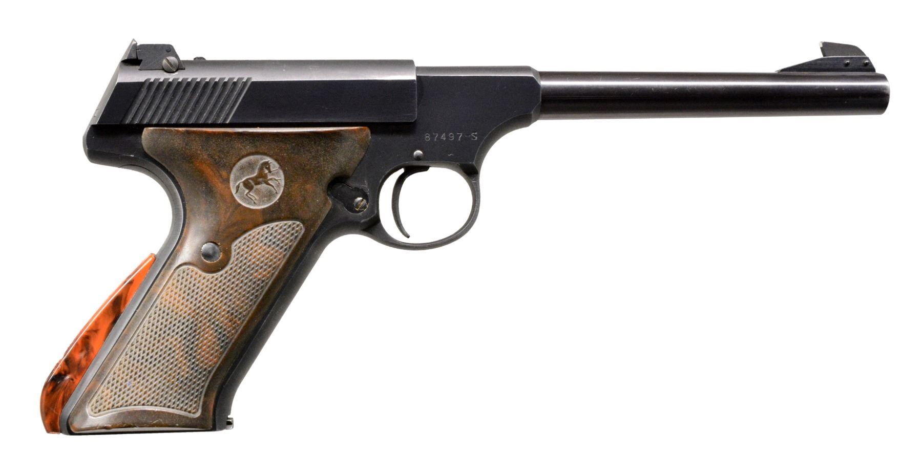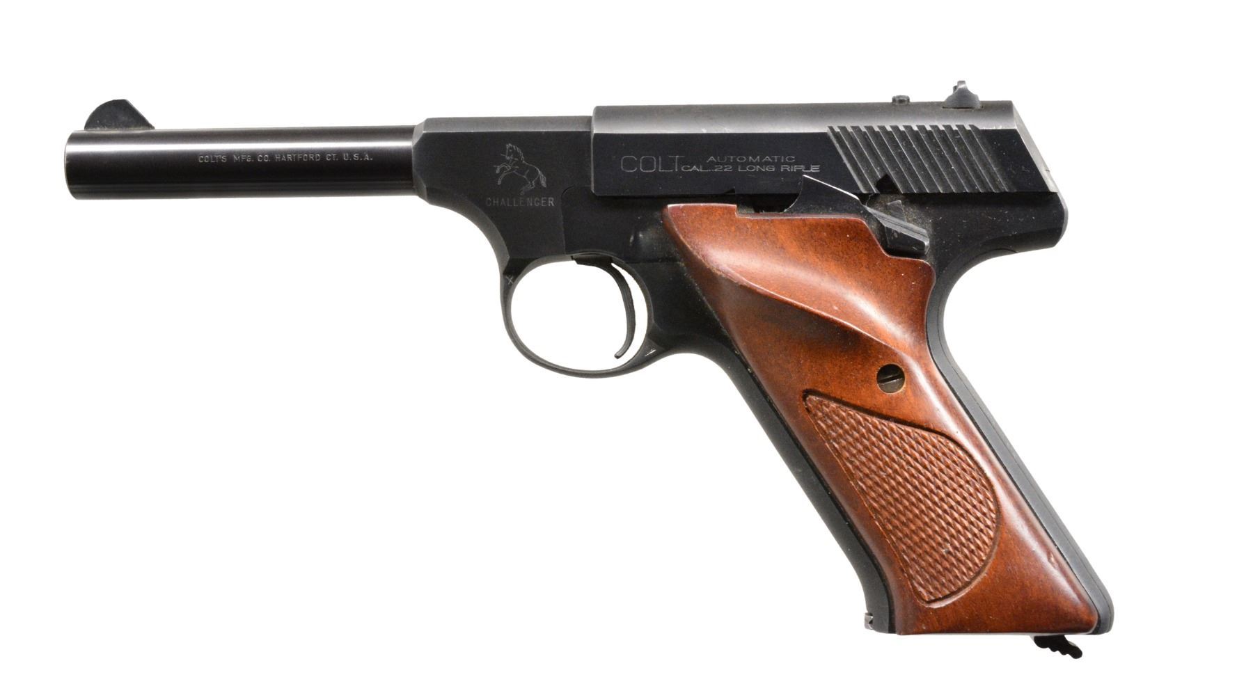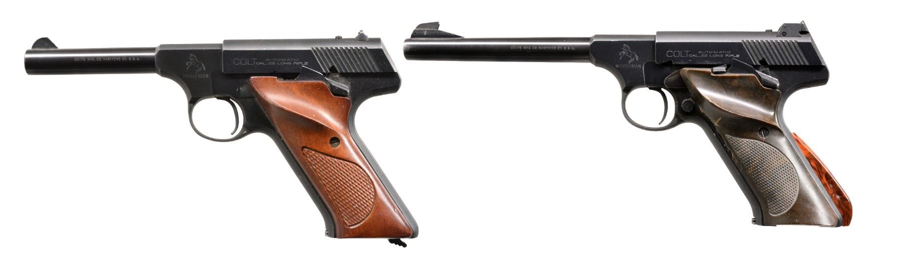 1) MODEL CHALLENGER. Cal. 22 LR. S# 37834" C. Bbl. 4.5" w/ fixed sights. Bottom mag release. Checkered thumb rest walnut grips. MAGS: 1"10 rd. CONDITION: very fine original blue w/ a few handling marks on front & back straps. Grips have a few scattered minor dings otherwise very good. Very good bore. (19"5863/ZAL). 2) MODEL WOODSMAN SECOND SERIES TARGET. Cal. 22 LR. S# 8749'S. Bbl. 6". Automatic slide stop & hold open. Adj. rear sight. Coltwood plastic thumb rest grips. Injection molded plastic palm extension. Push button mag release. MAGS: 1"10 rd. CONDITION: 80% original metal finish w/ muzzle wear & scattered handling marks. Left grip panel is cracked & missing lg. chips along front grip strap. Very good bore. (19"5864/ZAL). BOTH CURIO. $600" 1,000.