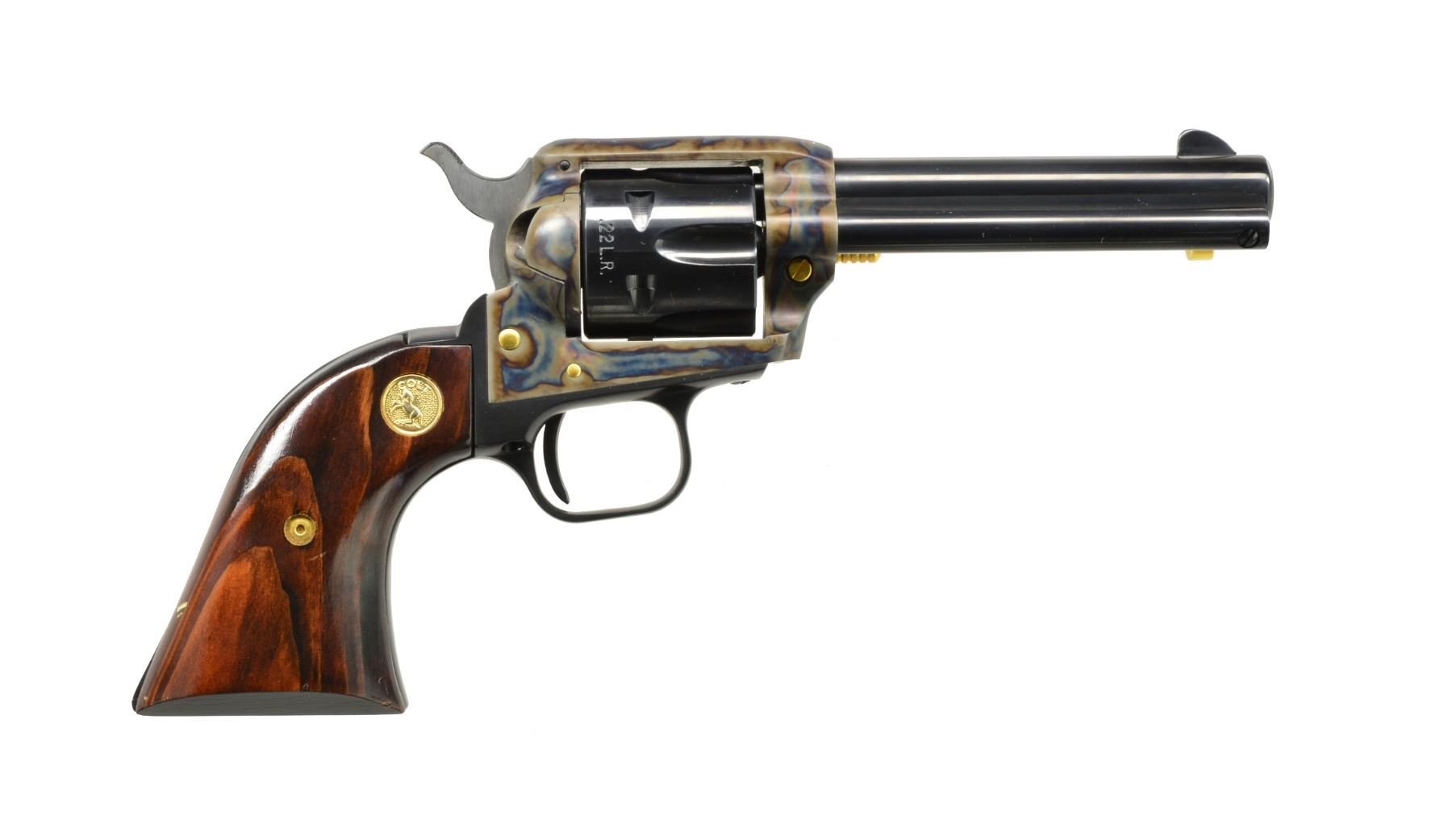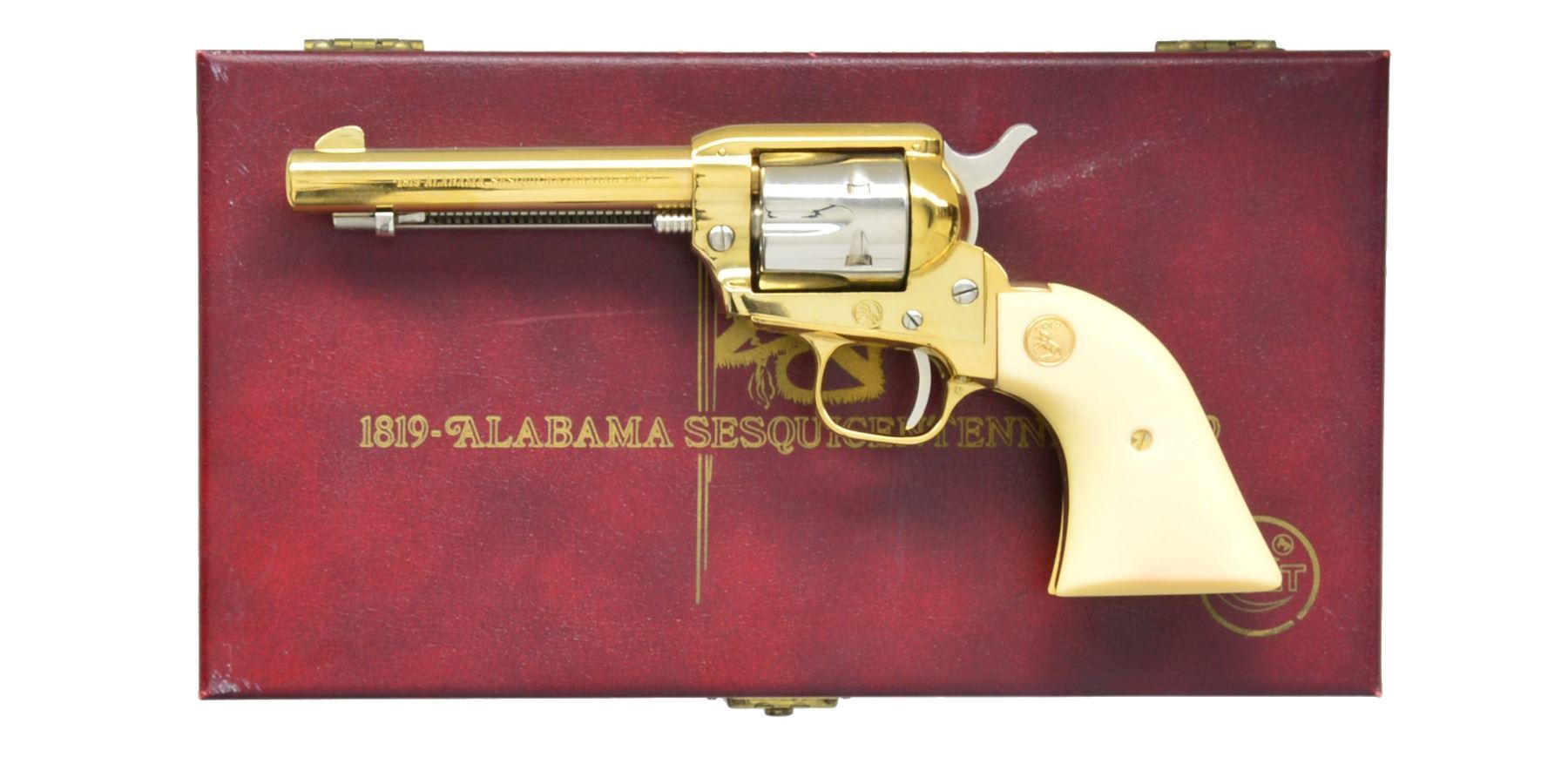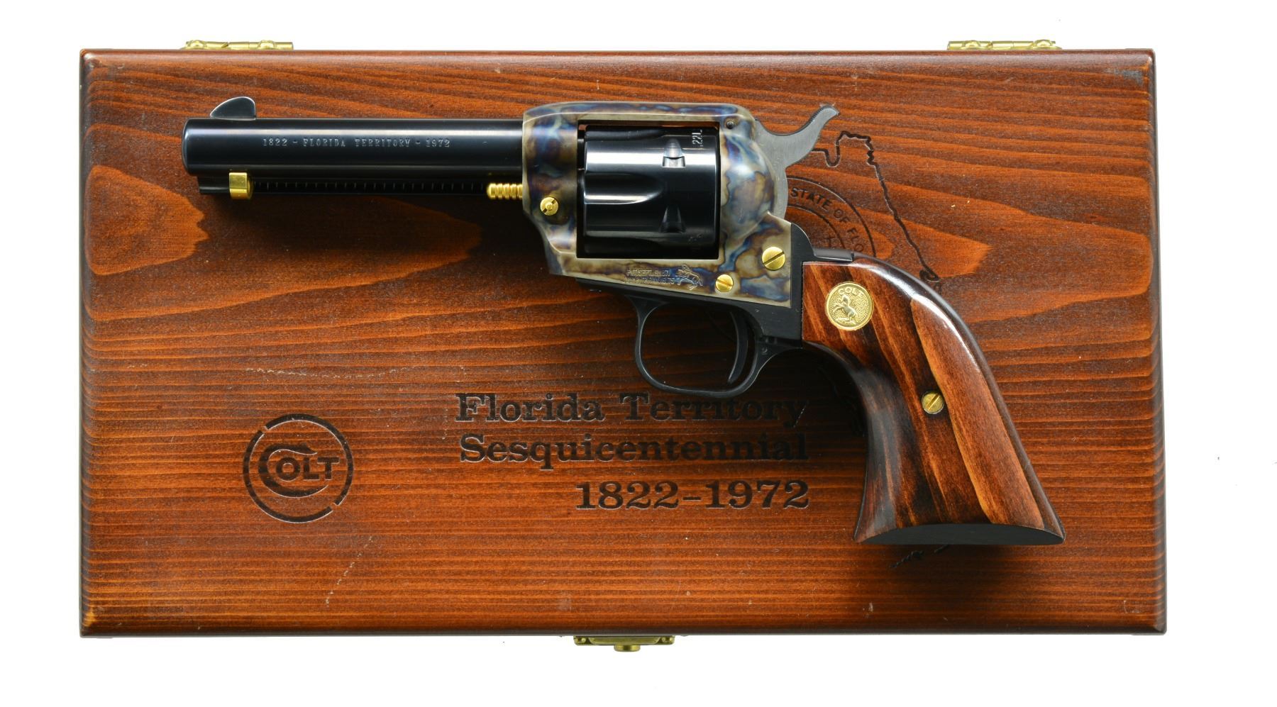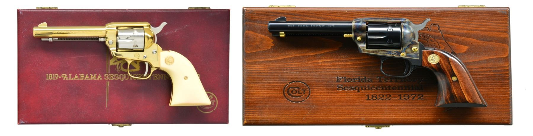 SA REVOLVERS. BOTH: cal. 22 LR. 1) ALABAMA SESQUICENTENNIAL 1819-1969. S# 2321AS. Bbl. 4 3/4". 6 Shot fluted cyl. Bbl., frame & grips straps have gold anodized finish. Cyl., ejector housing, hammer, trigger & other parts have nickel finish. 2 Piece synthetic ivory grips w/ gold Rampant Colt medallions. Limited edition 3,001 mfg. 1969. UNATTACHED ACCESSORIES: red Naugahyde covered display case w/ red & white interior having Alabama flag on lid. CONDITION: appears unfired. Grips show age related yellowing & staining. (20-87/DS). 2) FLORIDA TERRITORY SESQUICENTENNIAL 1822-1972. S# 1018FLA. Bbl. 4 1/2". 6 Shot fluted cyl. Blued bbl., cyl. & ejector housing. Case colored frame. Black anodized grip straps. Gold anodized ejector housing, cyl. pin & action screws. 2 Piece laminated wood grips w/ gold Rampant Colt medallions. Limited edition 2,001 mfg. 1972. UNATTACHED ACCESSORIES: wood display box having gold interior having state of Florida seal on lid. CONDITION: as new. (20-94/DS). BOTH CURIO. $900-1,300.
