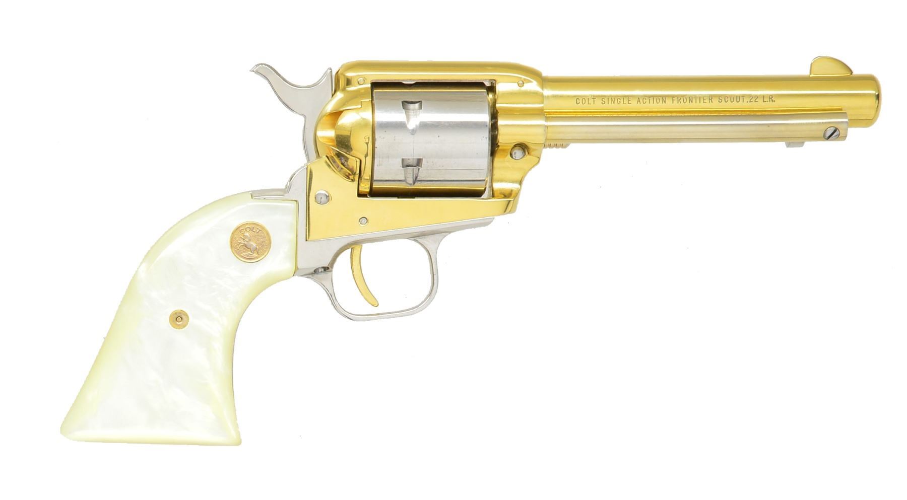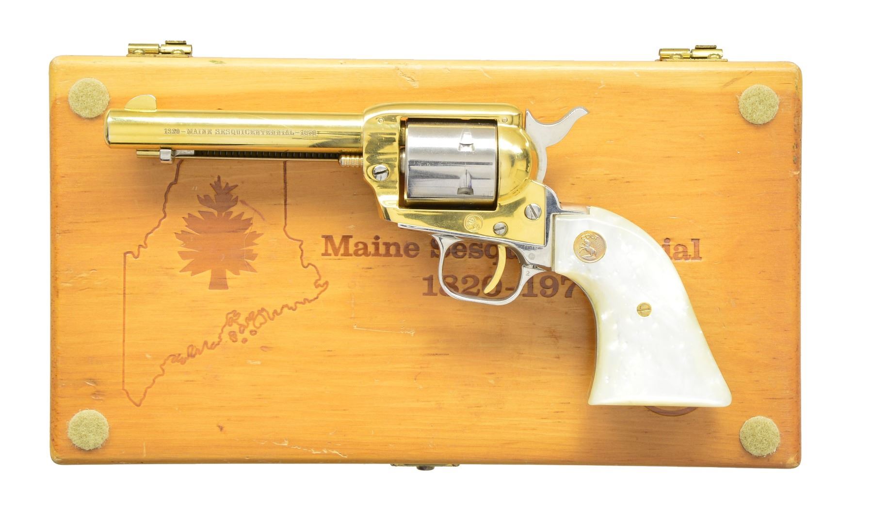 Cal. 22 LR. S# 2257MES. Bbl. 4 3/4" w/ blade front sight. 6 Shot rnd. cyl. Left side of bbl. is marked "1820-MAINE SESQUICENTENNIAL-1970". Gold finished bbl., frame & trigger w/ nickel finish cyl., hammer & grip straps. 2 Piece synthetic pearl grips w/ gold rampant Colt medallions. Limited edition of 3,000 mfg. in 1970. UNATTACHED ACCESSORIES: wood presentation box w/ blue velour interior holding a gold finished lobster. CONDITION: over 90% metal finish showing some fading in edge wear w/ light cyl. drag line. (19-5599/DS). CURIO. $400-600.