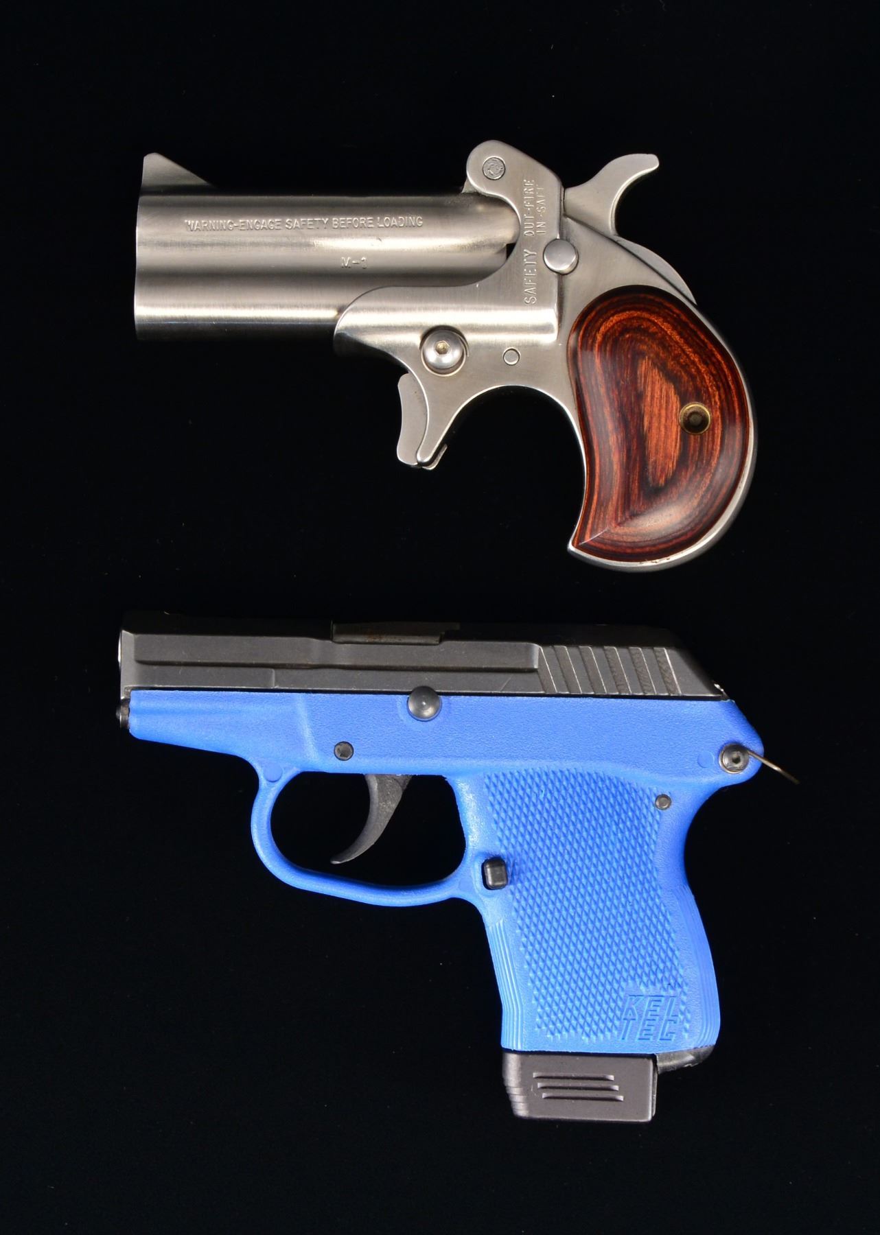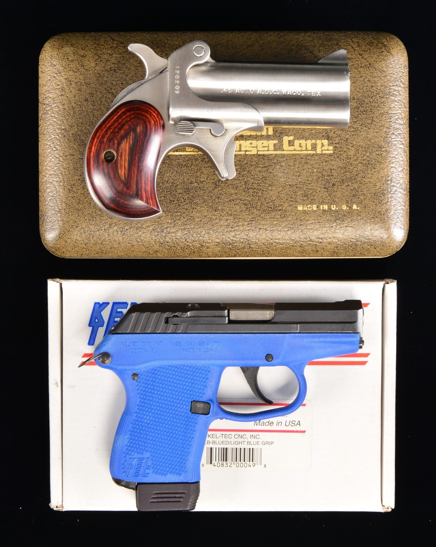 M-1 PISTOL. 1) KEL-TEC MODEL P-32 SEMI-AUTO PISTOL. Cal. 32 Auto (32 ACP). S# 75068. Bbl. 2 5/8". Mfg. 1999 to date. Light blue polymer frame & blued slide. Optional Kel-Tec lanyard loop at rear; no lanyard. MAGS: 1 very good factory 7 rd. w/ finger extension base. UNATTACHED ACCESSORIES: factory box & packaging. Blue nylon factory pouch. CONDITION: very good to near excellent appearance w/ slight stained bbl. appearance. Very good bore w/ hint of firing residue. (20-1235/NW). 2) AMERICAN DERRINGER MODEL M-1 PISTOL. Cal. 45 ACP. S# 120209. Bbls. 3" w/ blade front sight & hinge notched rear. Patterned after Remington Model 1895 Derringer w/ modern mfg. improvements: robust hinge, spring loaded bbl. latch & push button hammer block safety. Mfg. 1980 to date in Waco, TX. Smooth laminated rosewood grips. UNATTACHED ACCESSORIES: near excellent leather looking jewelry style snap closing case w/ gold lettering on top of lid & red lettering on ivory satin under lid. Base w/ red velvet shadow line derringer insert. Simulated black leather zippered pouch w/ gold company lettering. CONDITION: all exterior aspects near excellent appearing unfired but bores have milling marks in rifling. (20-1238/NW). BOTH MODERN. $500-750.