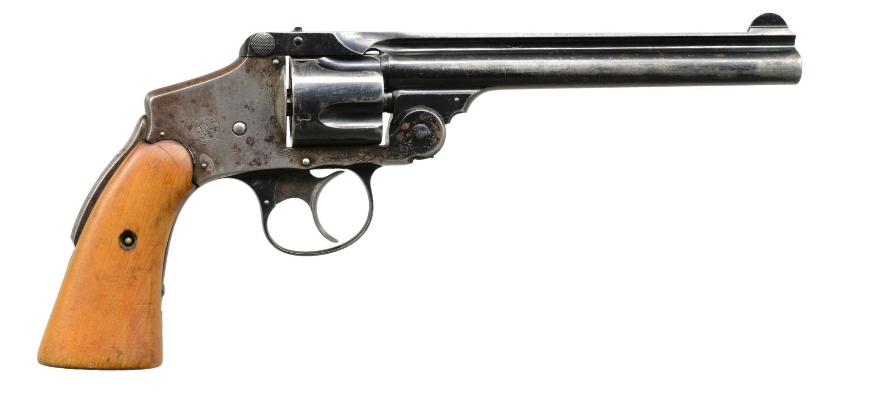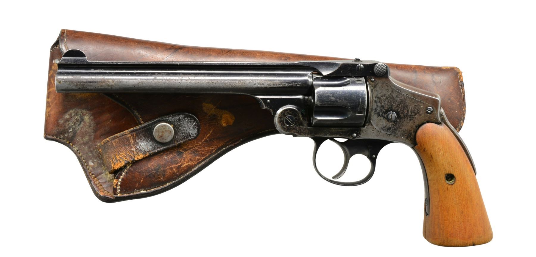 Cal. 38 S&W. S# 237774. Bbl. 6". Fifth model mfg. 1907-1940 w/ blued finish; 41,500 units. Rnd. butt frame w/ homemade light colored hardwood grips extending below butt. Seldom encountered w/ 6" bbl. in hammerless configuration; usually 3 1/4". Matching numbered cyl. & bbl. latch. UNATTACHED ACCESSORIES: fair brown dbl. thickness leather utility holster w/ single wide belt loop & snap secured retention strap. CONDITION: fair overall appearance w/ minimal finish at rear of frame having spotty light pitting on right side & beginning patina appearance. Cyl., bbl. & trigger guard much better in appearance; sides of bbl. holster worn w/ light pitting on left side near muzzle. Fair serviceable grips w/ less than factory quality fit & finish. Very good to excellent bore & proper functioning. (20-302/NW). CURIO. $150-250.