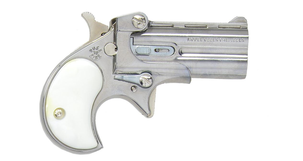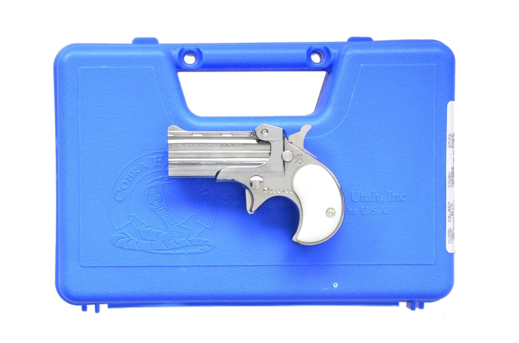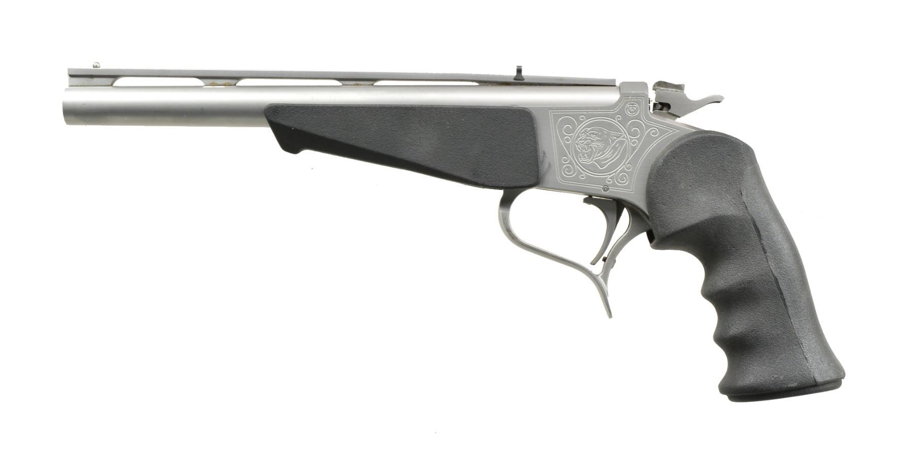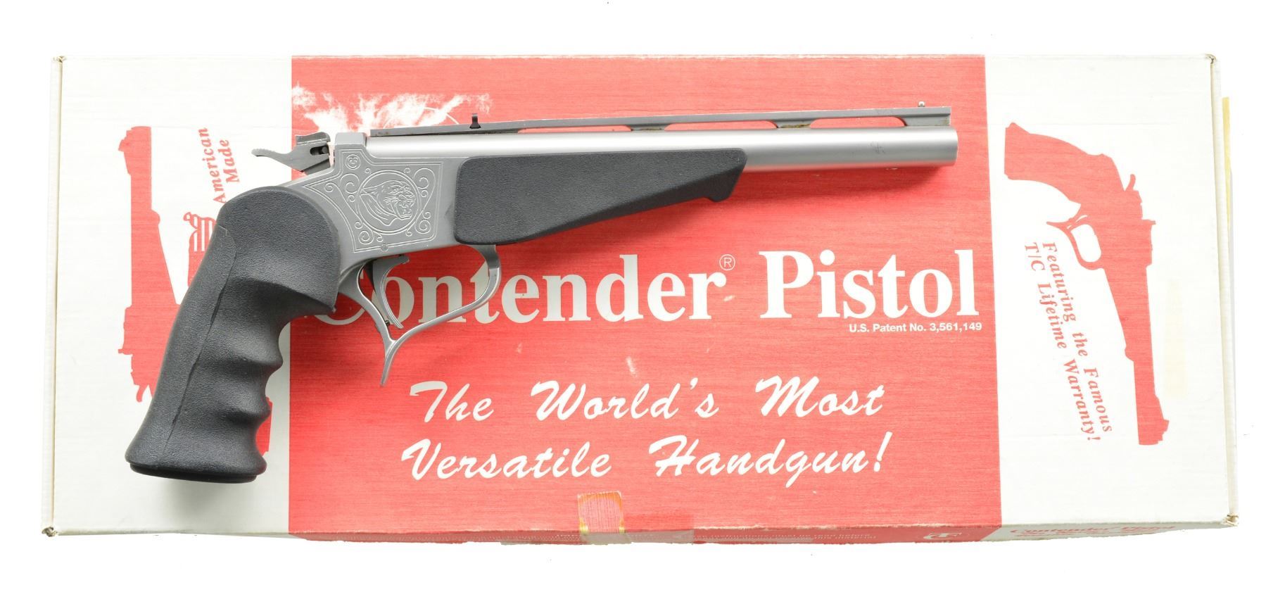 1) THOMPSON CENTER CONTENDER SINGLE SHOT. Cal. 45 Colt / 410. S# S33764. Bbl. 10" VR w/ bead front sight & matching notched rear; internal choke. Mfg. 1997 in stainless steel w/ easy open frame feature & Rynite stock set; finger grooved grip. Laser engraved w/ TC logo & puma on both sides. Safety / bbl. selector on top of hammer. Bbl. lug having improved split locking bolt plus stamped w/ circled 95. UNATTACHED ACCESSORIES: matching factory frame only box w/ pistol cutout in base plus packaging to include 30 min. VHS tape. Proper bbl. box; no choke wrench. Original box for bbl. CONDITION: all aspects near excellent including bore. (20-1337/NW). 2) COBRA MODEL C22LR. Cal. 22 LR. S# 054124. Bbl. 2 3/8". Chrome plated w/ simulated pearl grips & hammer block push button safety. Mfg. post 2004 as indicated by "COBRA ENT. OF UTAH INC." bbl. marking. UNATTACHED ACCESSORIES: factory blue plastic case & packaging. CONDITION: all aspects near excellent including bore; appears new, unfired. (20-1352/NW). BOTH MODERN. $400-600.