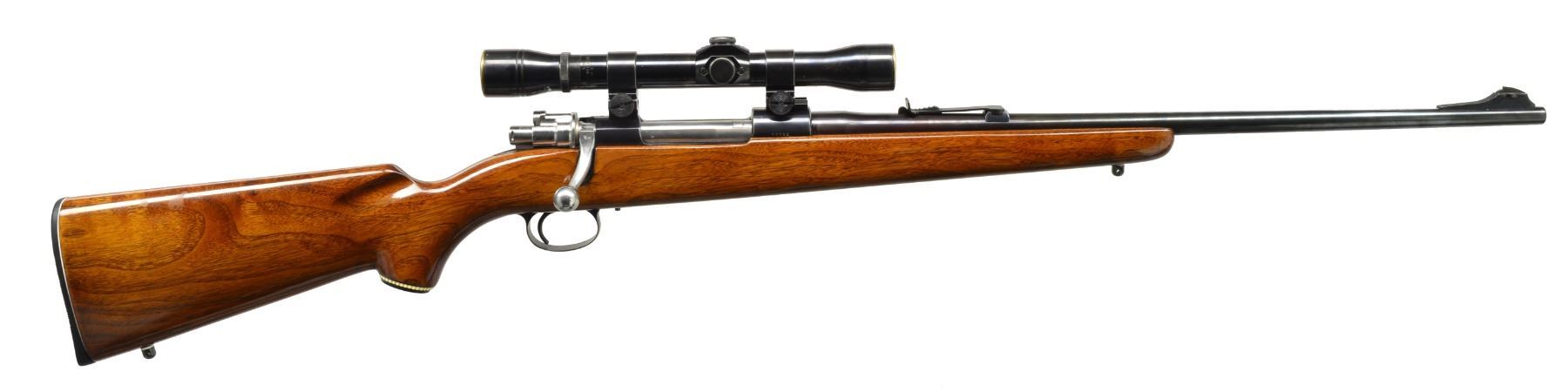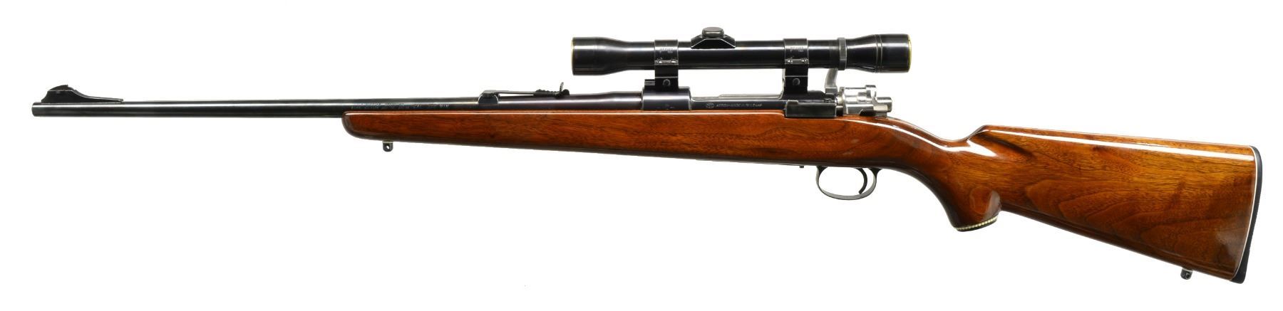 ACTION AND SCOPE. Cal. 270 Win. S# 27732. These great little rifles were always considered a bargain, w/ one being able to purchase a superb FN action for short money. This rifle, in exceptionally fine original condition has 22" lightweight bbl. fitted w/ iron sights. Model information & caliber is on left side of bbl. FN action is of earlier type w/ swept bolt handle & military type shroud fitted w/ low scope safety. Blued bottom metal has floorplate removable w/ pin type release. Rifle is mounted w/ J. C. Higgins 4X scope w/ crosshair reticle in Weaver QD rings; leather lens protector. Plain American walnut stock has white line spacers at grip & J. C. Higgins marked buttplate. Sling swivel bases are installed. UNATTACHED ACCESSORIES: rifle comes w/ another J. C. Higgins stock of plain walnut w/out white lines. CONDITION: excellent, close to"as new" w/ only a few minor marks in all original factory finishes. Chrome lined bore is sharp & shiny. Spare stock is also close to new. (20-879/MGM109). CURIO. $300-500.